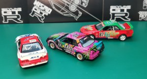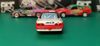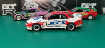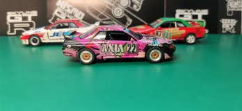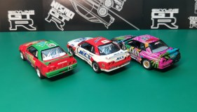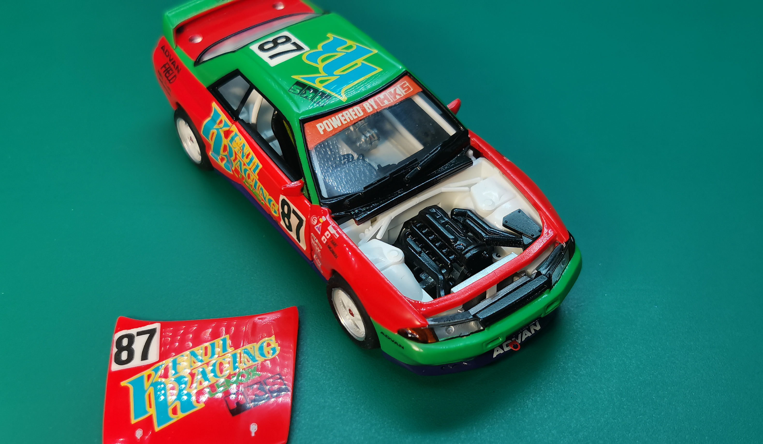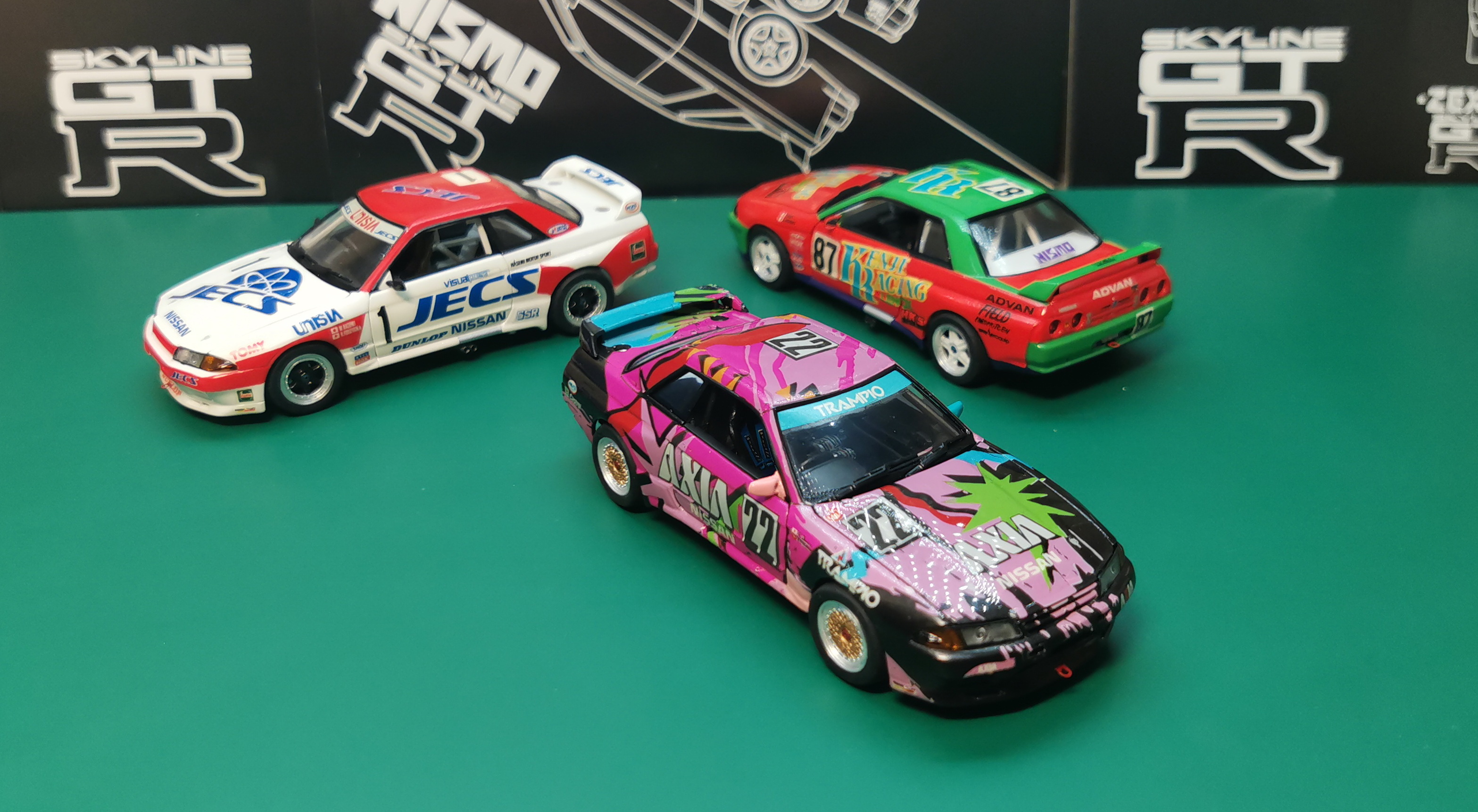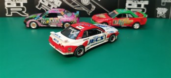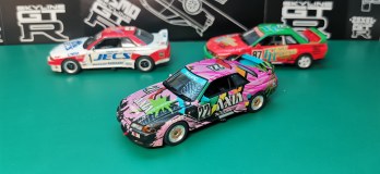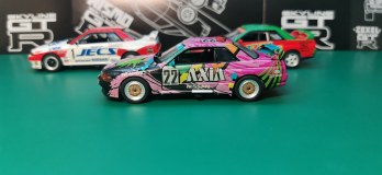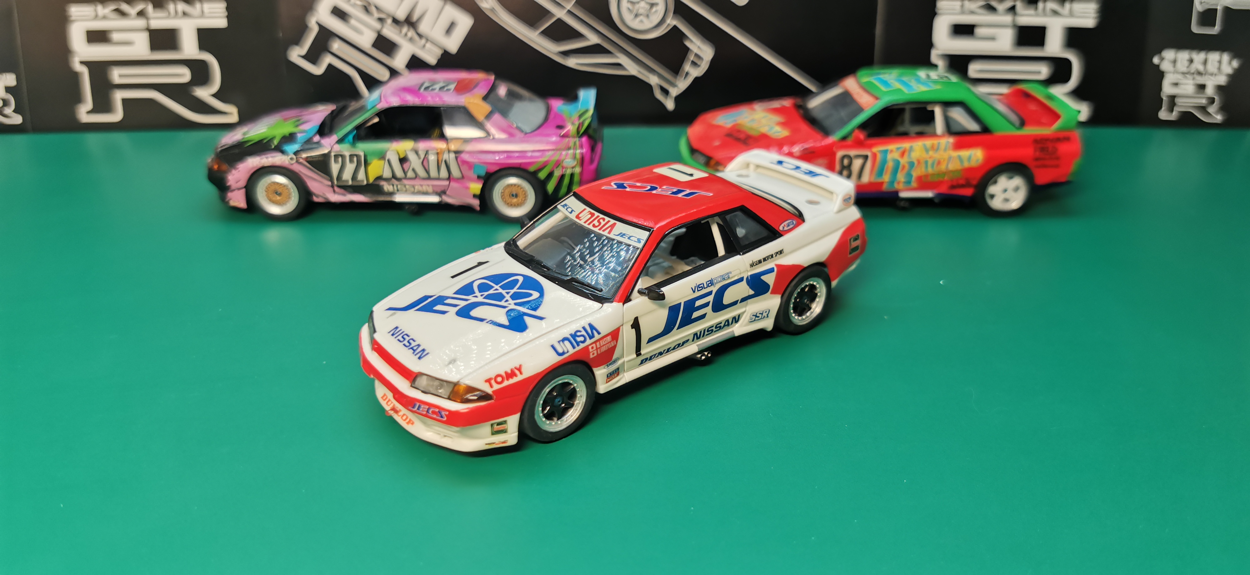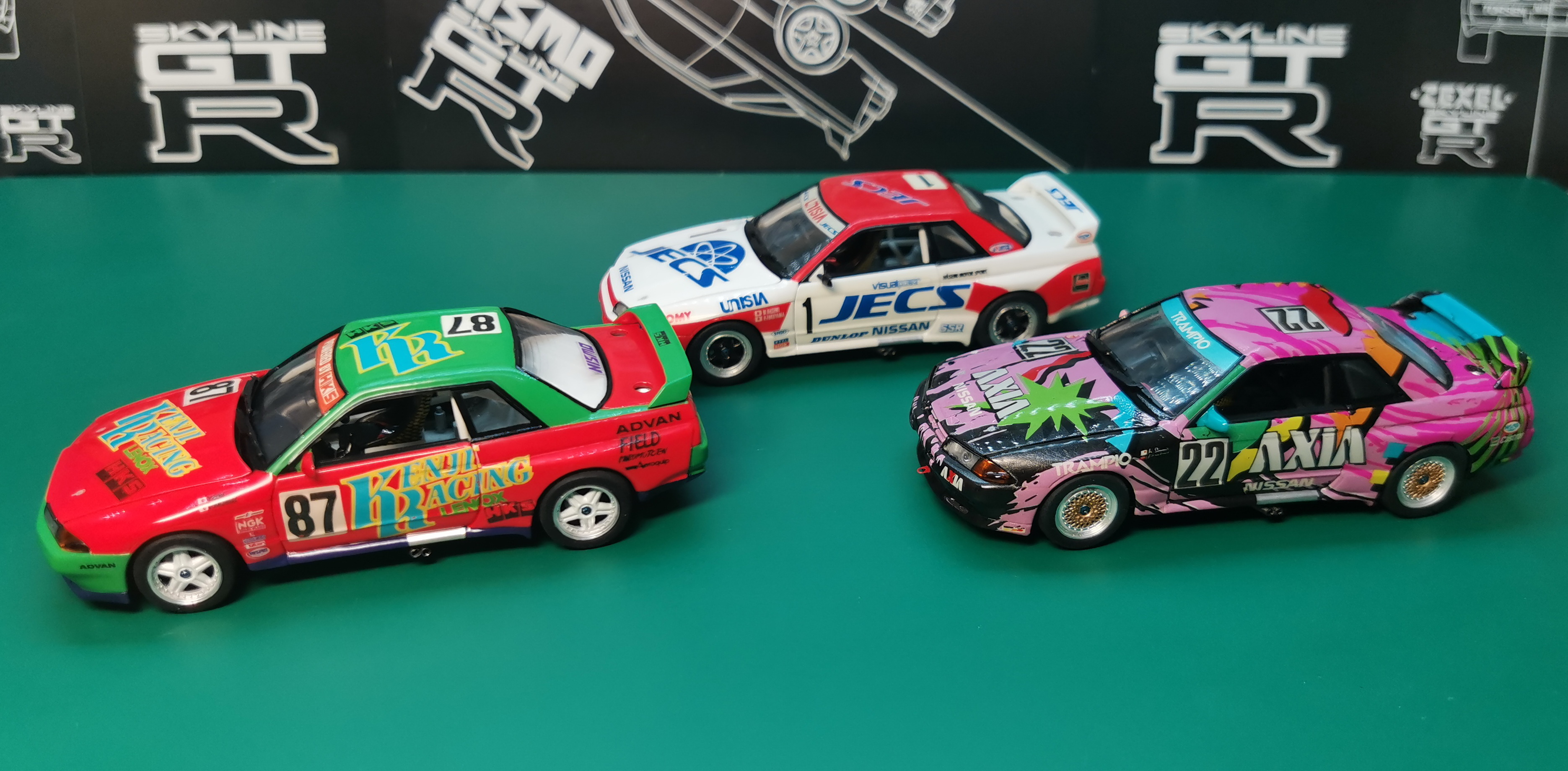 Три варианта одной и той же модели с разными декалями (в металлическом коллекционном исполнении именно эти машинки никогда не выпускались) заказал брат для своей коллекции. Модель достаточно старая, 92-го года, множество утяжин, немного облоя, крайне упрощенные в детализации и конечно декаль, к слову ожидалось что с ней будут проблемы, насколько большие проблемы проявились на стадии их нанесения не описать словами. Они просто рассыпались, и были задуты спиртовым лаком в два тонких слоя (оказалось надо было еще пару слоев дунуть, но боялся что подложка будут выступать, что в итоге и так проявилось). Сборка проблем особых не доставило а вот покраска была долгая и муторная, так как и ожидалось что с декалями будут тяжело, то было принято боевую раскраску делать с помощью краски (к примеру зеленая крыша у HKS , красные элементы у Jecs были даны декалями и вряд ли они легли бы огибая всю модель). А теперь подробнее про каждую: