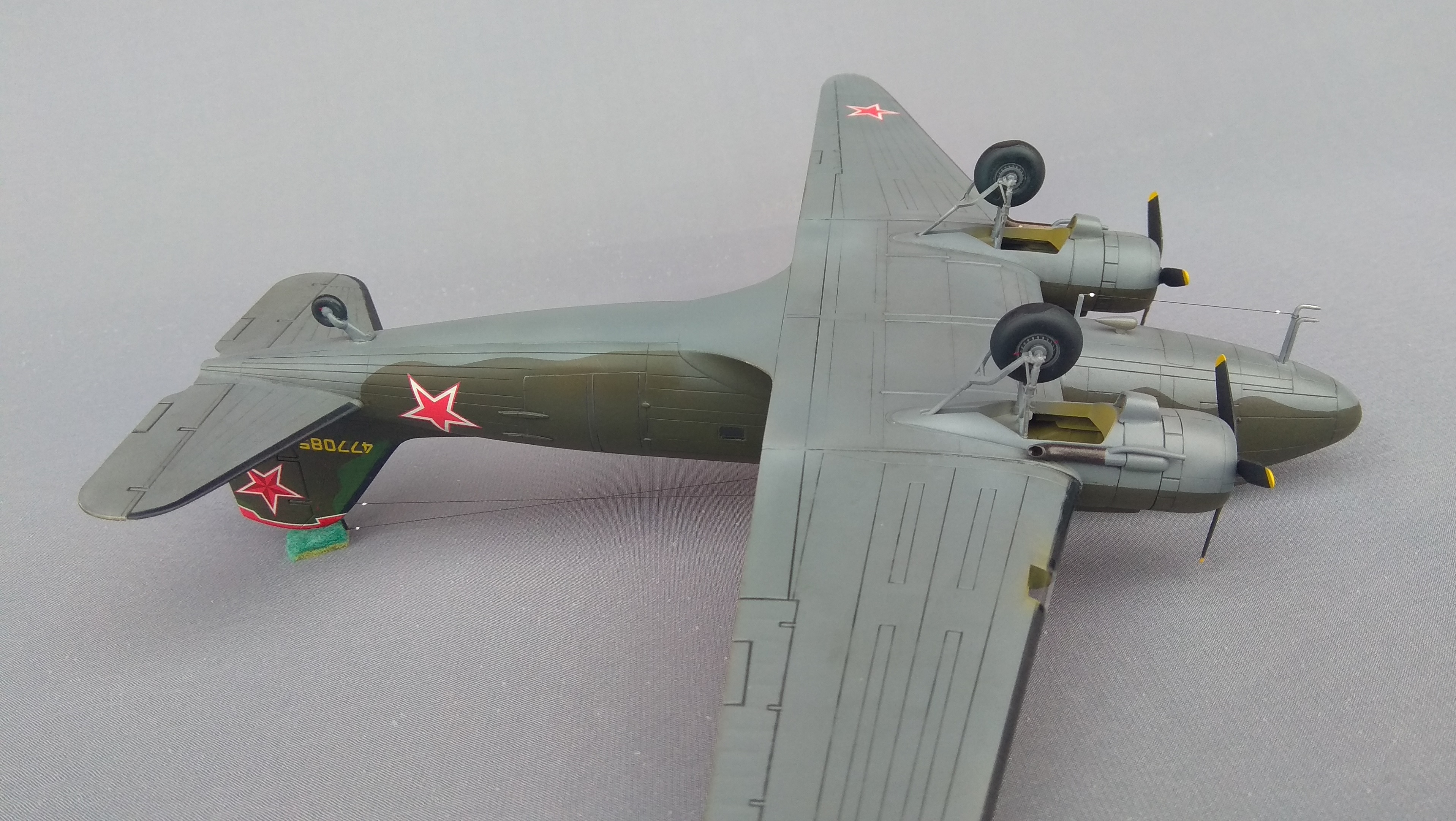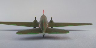 Разобрал её на составные части, доработав двигатели свечной проводкой, склеил планер вновь. Воздухозаборники двигателей потребовали некоторой подгонки. Сверху фюзеляжа, позади кабины пилотов, наклеил пластиковую шайбу и сделал отверстие в фюзеляже для монтирования прозрачного колпака астрокомпаса. Колпак взял из набора Ан-24Б 1:72 от Amodel.