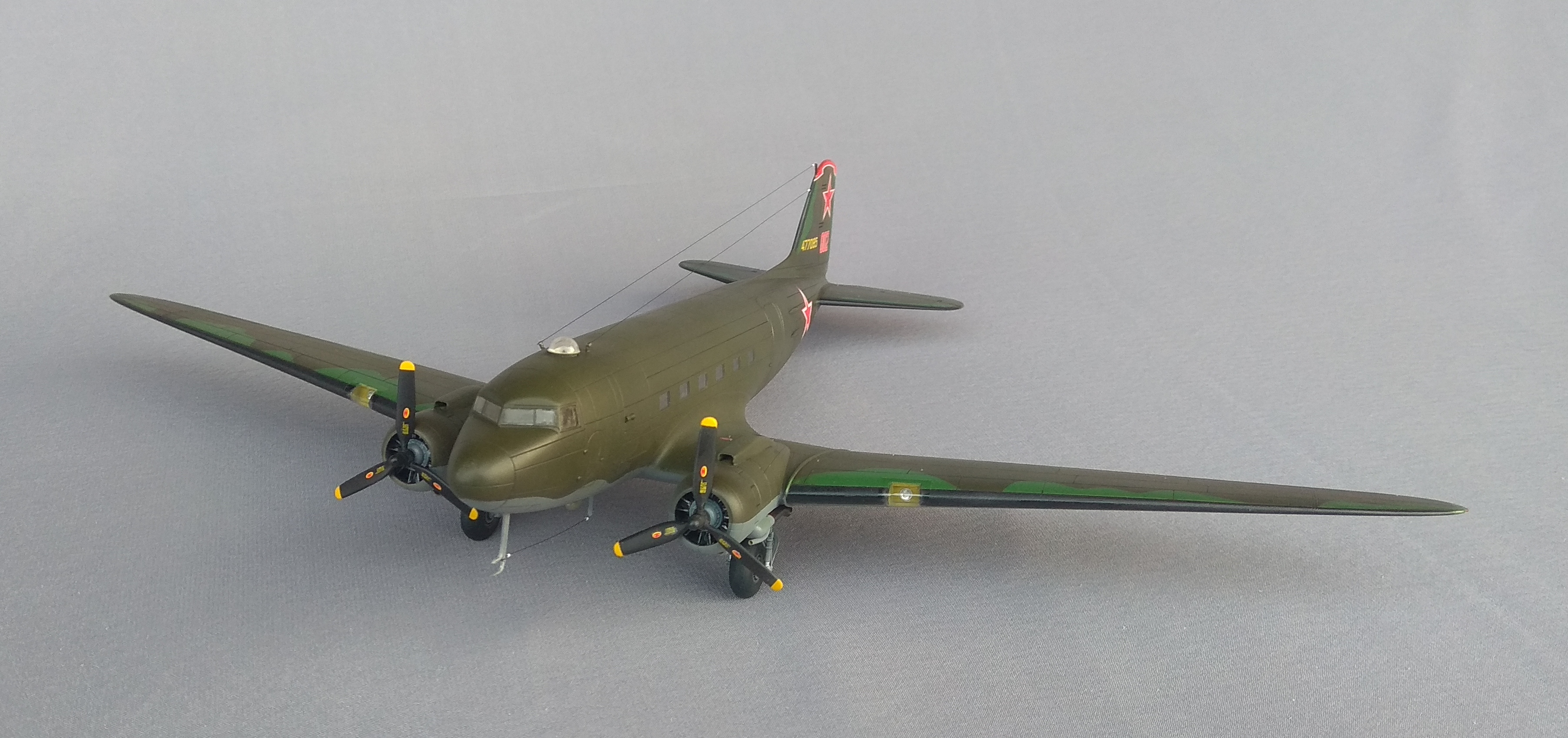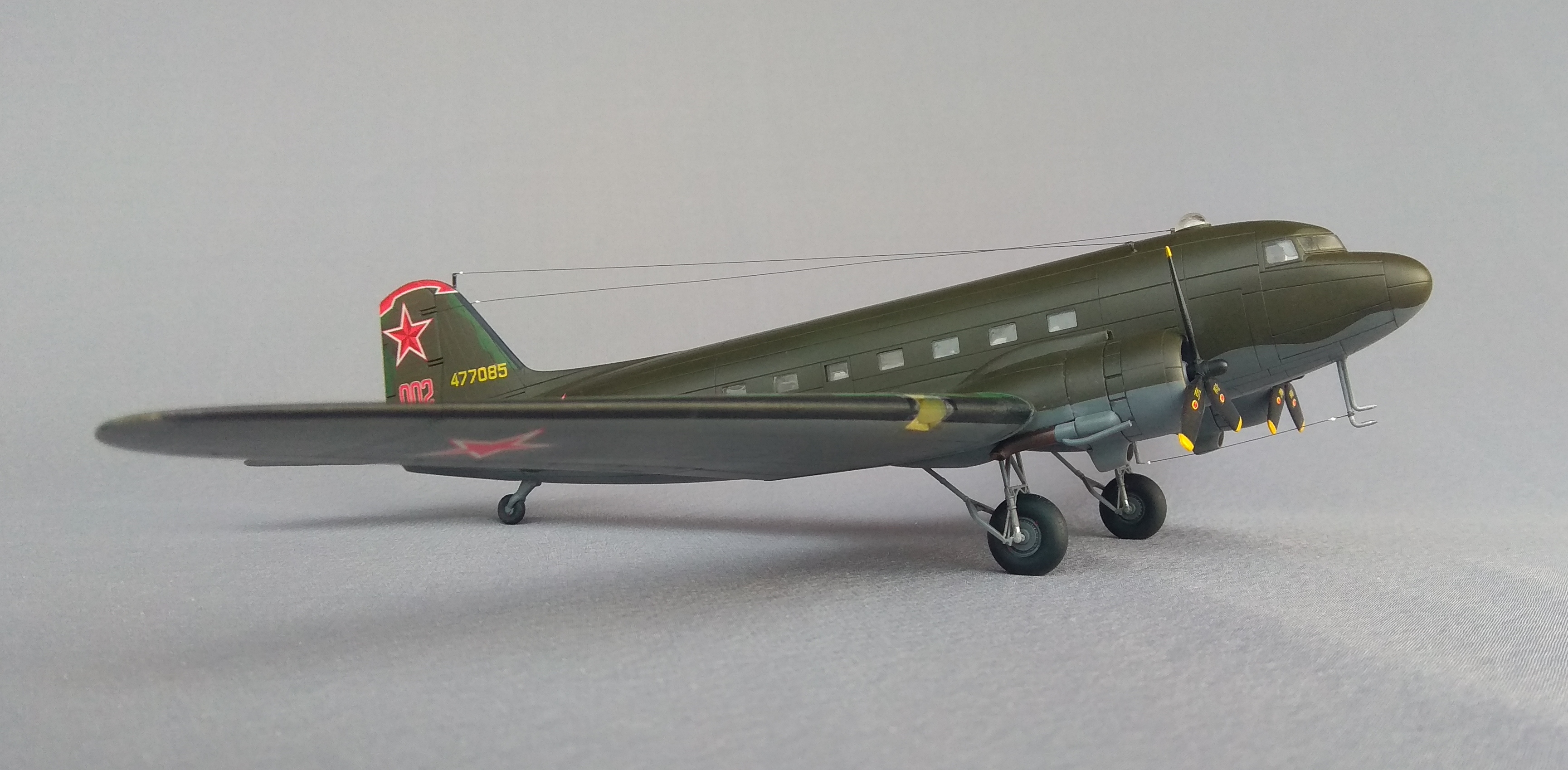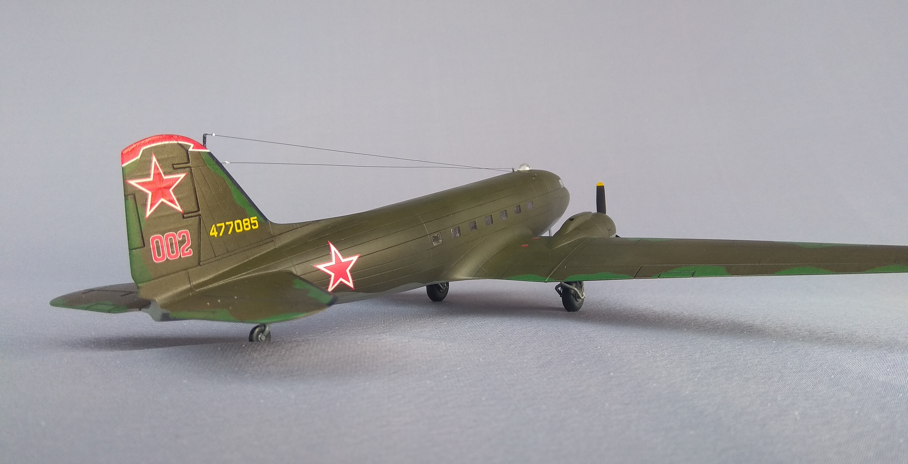 При помощи коллеги с сайта «Скалемоделс», который дал ссылку в интернете, где можно было выяснить, какие бортовые номера были накрашены на киль С-47, поставленные в Советский Союз. Выяснил, что самолёт с серийным номером 477085, был изготовлен в США 31.05.1945 г. И принят Советской стороной на Аляске 11.06.1945 года. И пролетел по авиатрассе Аляска-Сибирь, может быть у него была посадка в аэропорту Олёкминск.