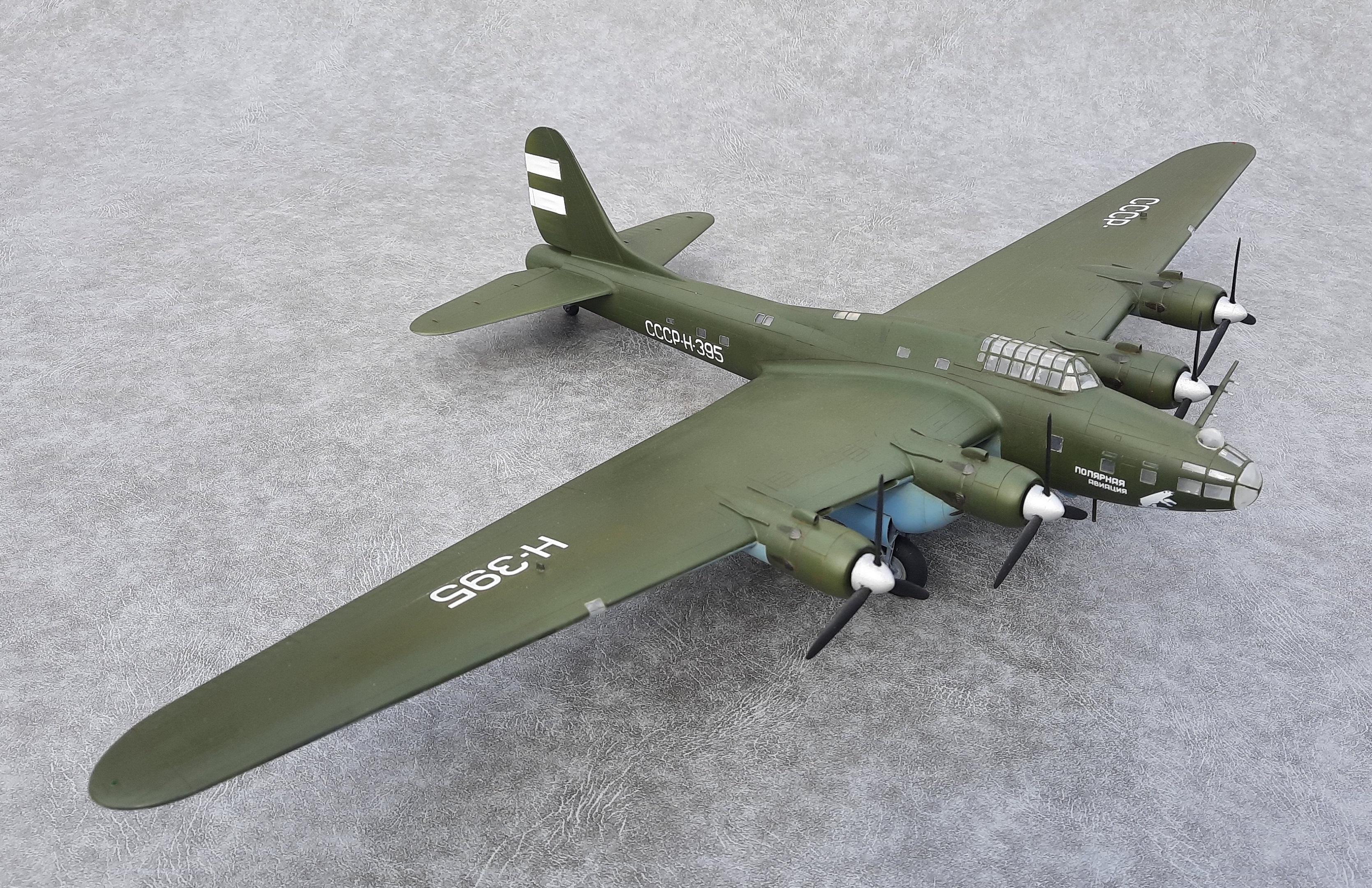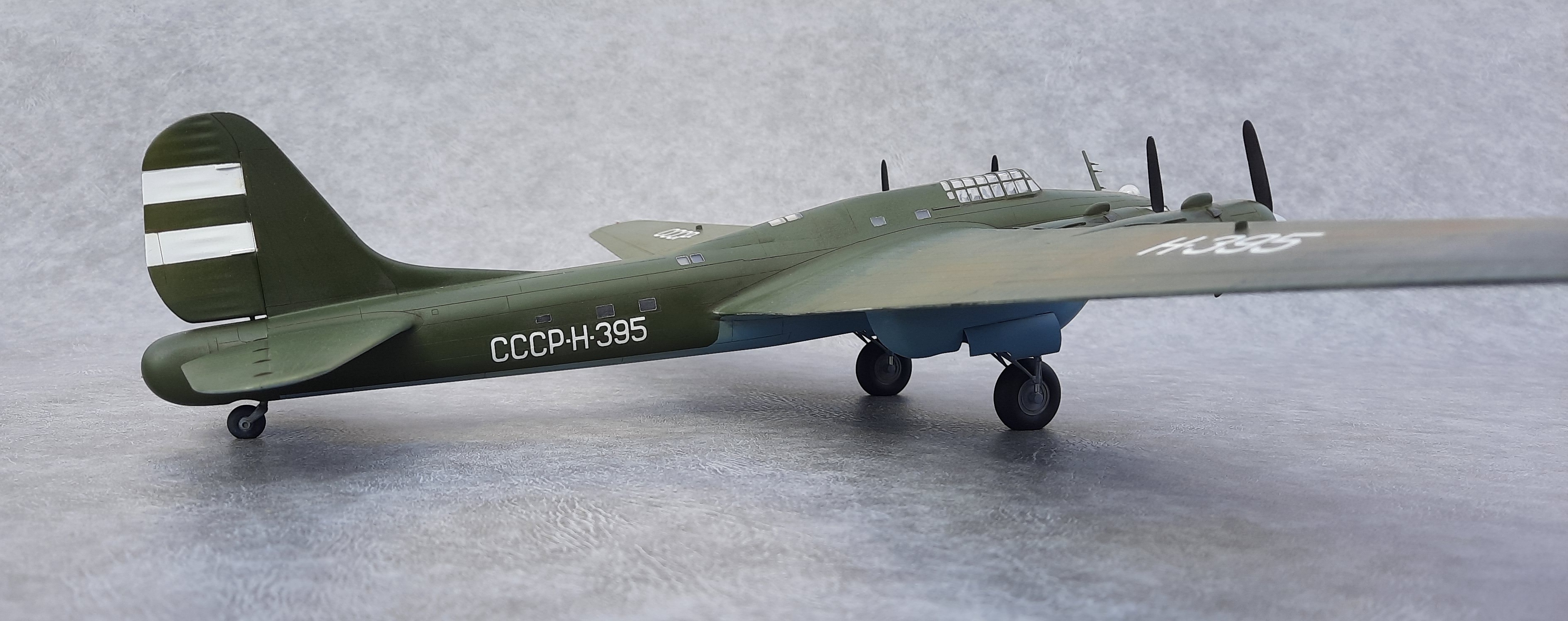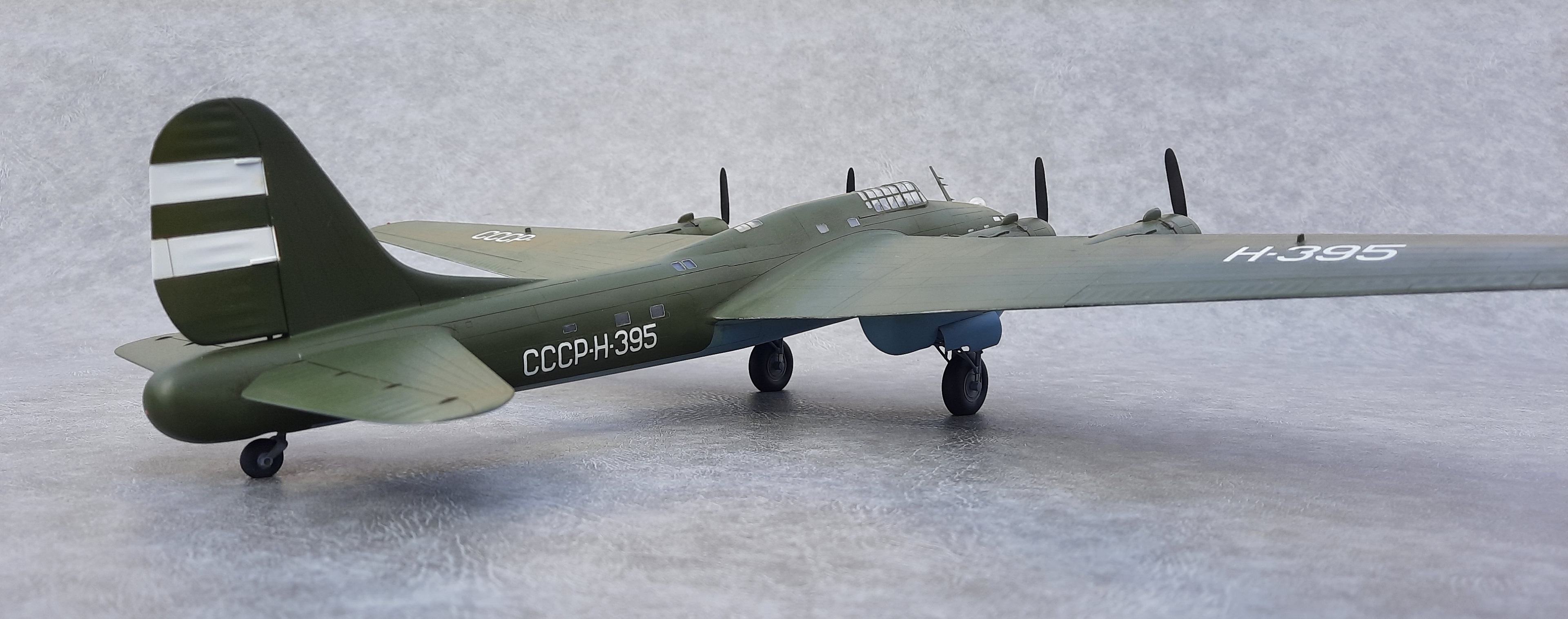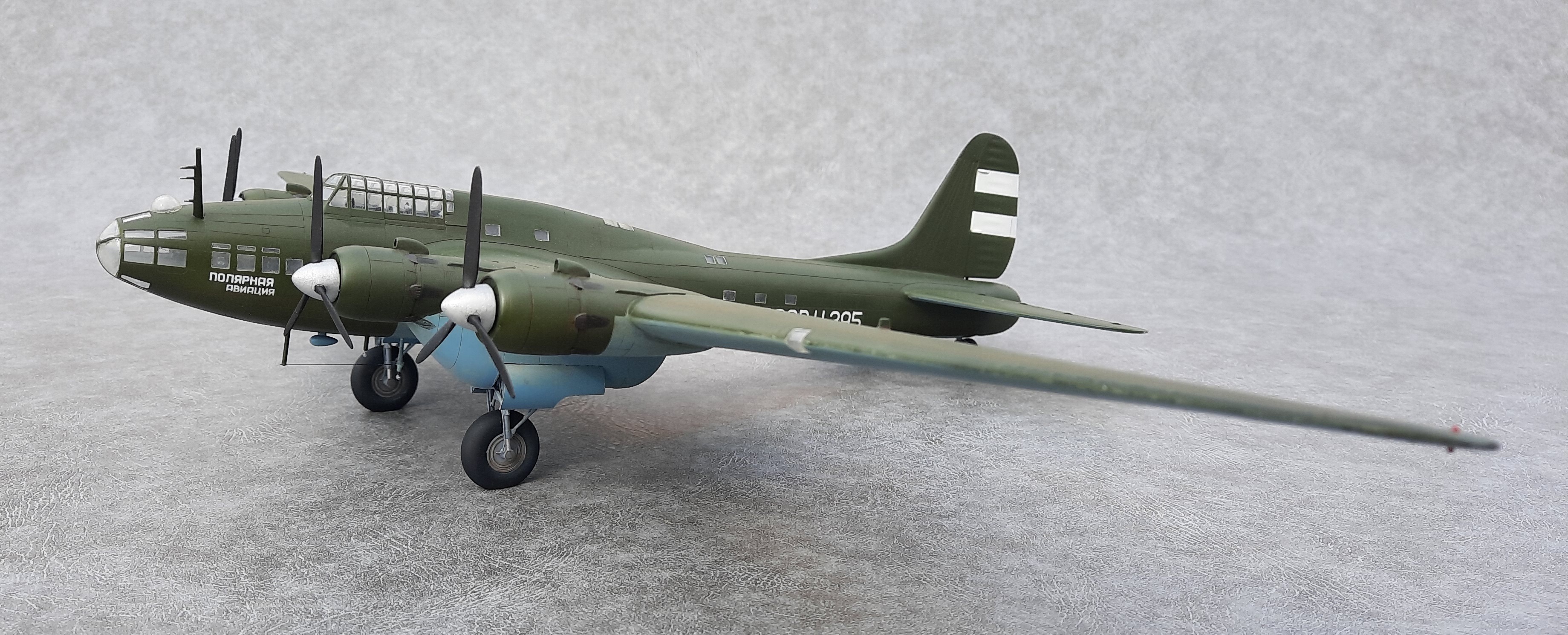Окна позади крыла, делал по примеру Пе-8 Н-396. Увиденная после фотография Н-395, подтвердила правильность этого. А окна сверху фюзеляжа и, окна, смещённые вниз за кабиной пилотов увидел после просмотра кинохроники «Разведчик Севера» про Советского полярного лётчика Бабушкина М. С.. В этом фильме запечатлён производящий посадку и заруливающий на стоянку Пе-8 Н-395. Только освещённости не хватает рассмотреть все детали.