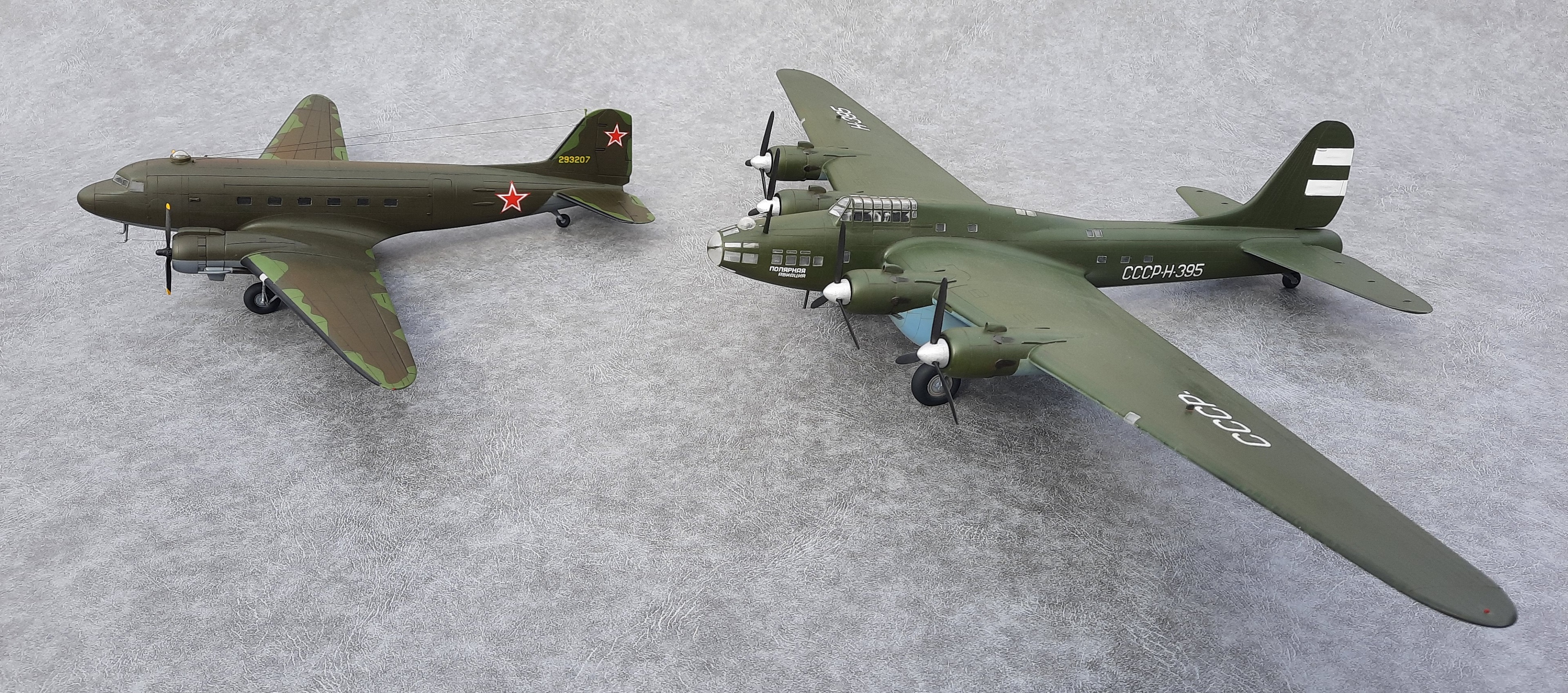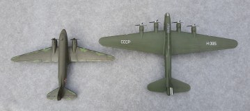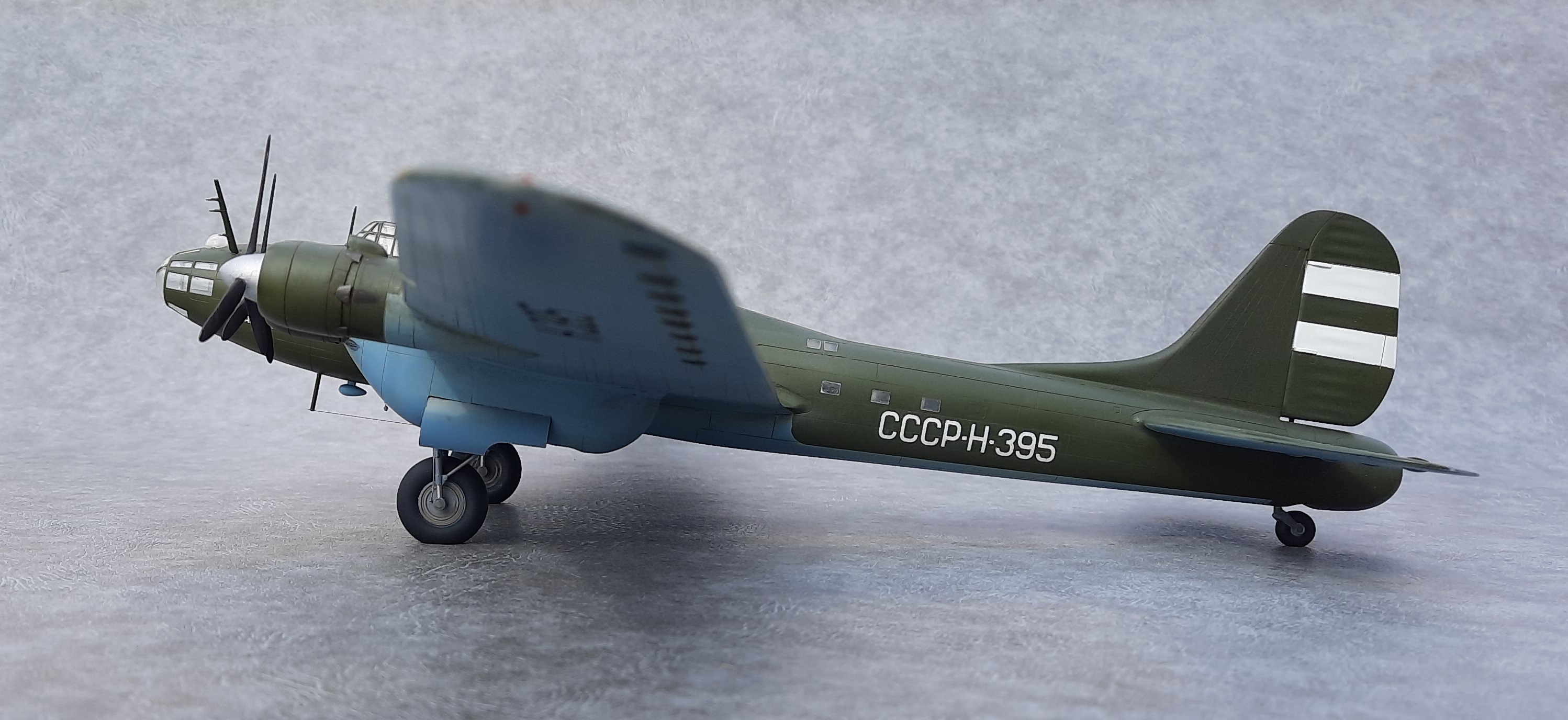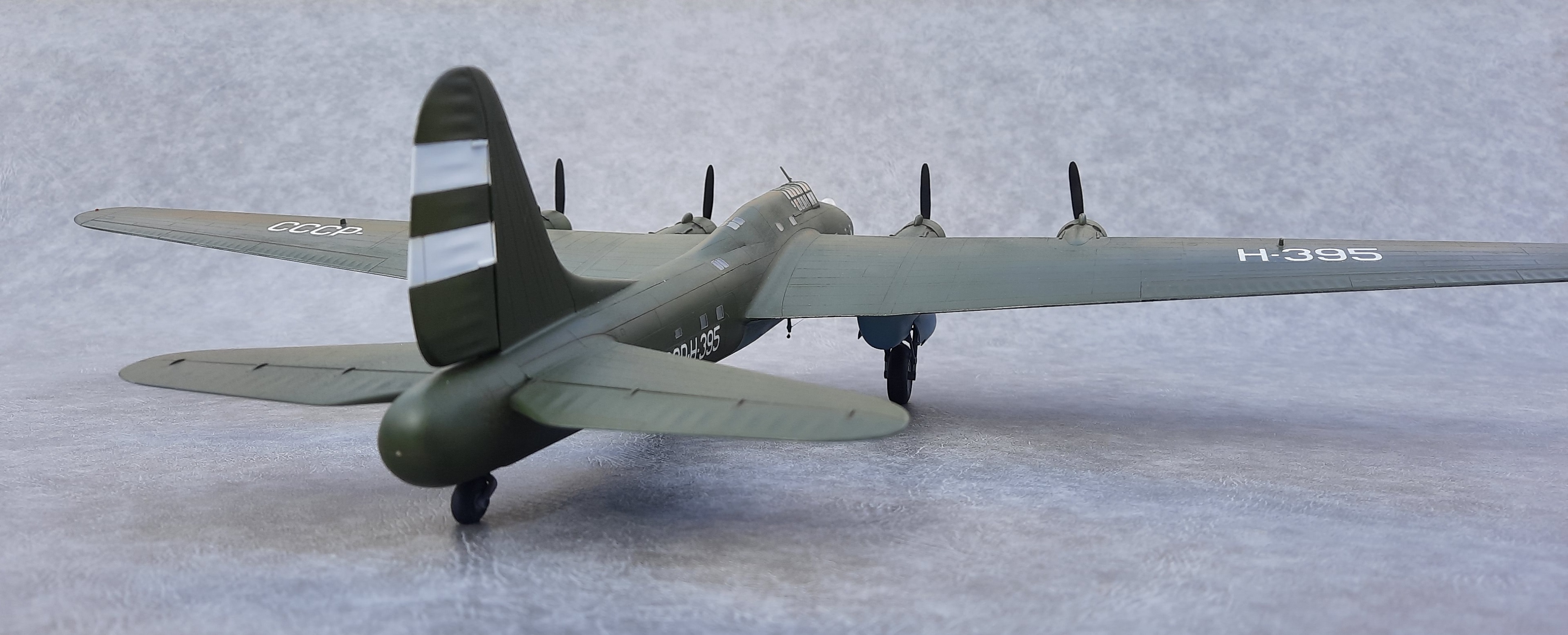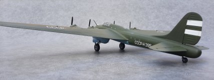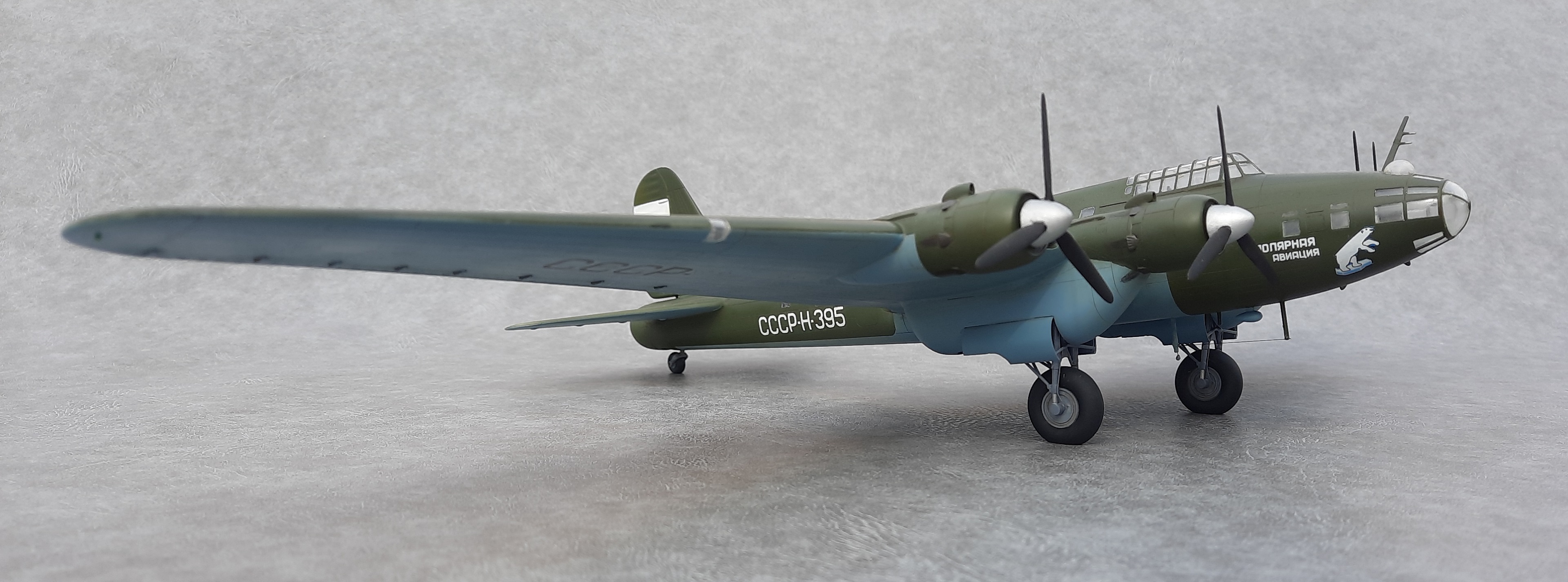 Окна позади крыла, делал по примеру Пе-8 Н-396. Увиденная после фотография Н-395, подтвердила правильность этого. А окна сверху фюзеляжа и, окна, смещённые вниз за кабиной пилотов увидел после просмотра кинохроники «Разведчик Севера» про Советского полярного лётчика Бабушкина М. С.. В этом фильме запечатлён производящий посадку и заруливающий на стоянку Пе-8 Н-395. Только освещённости не хватает рассмотреть все детали.