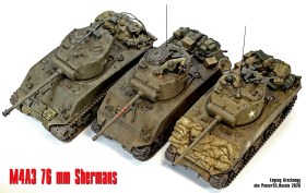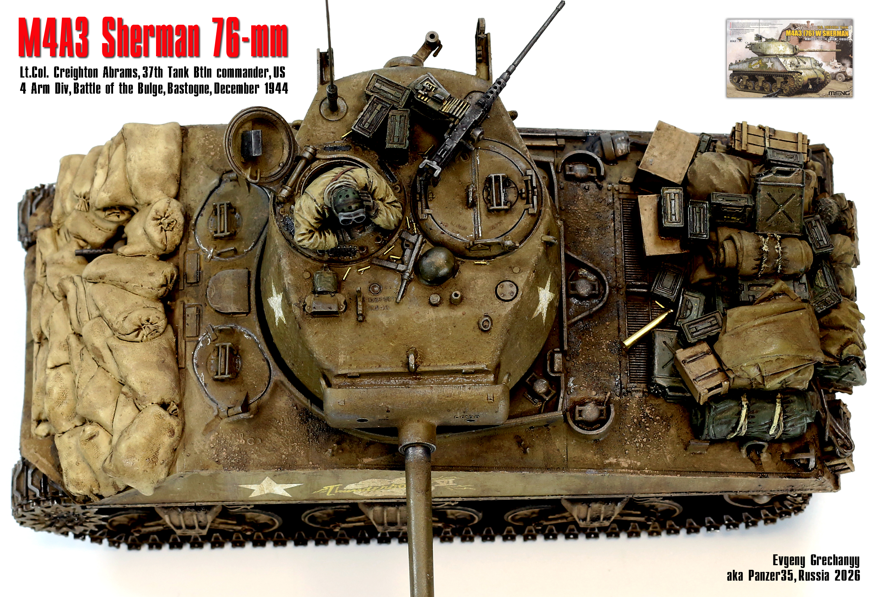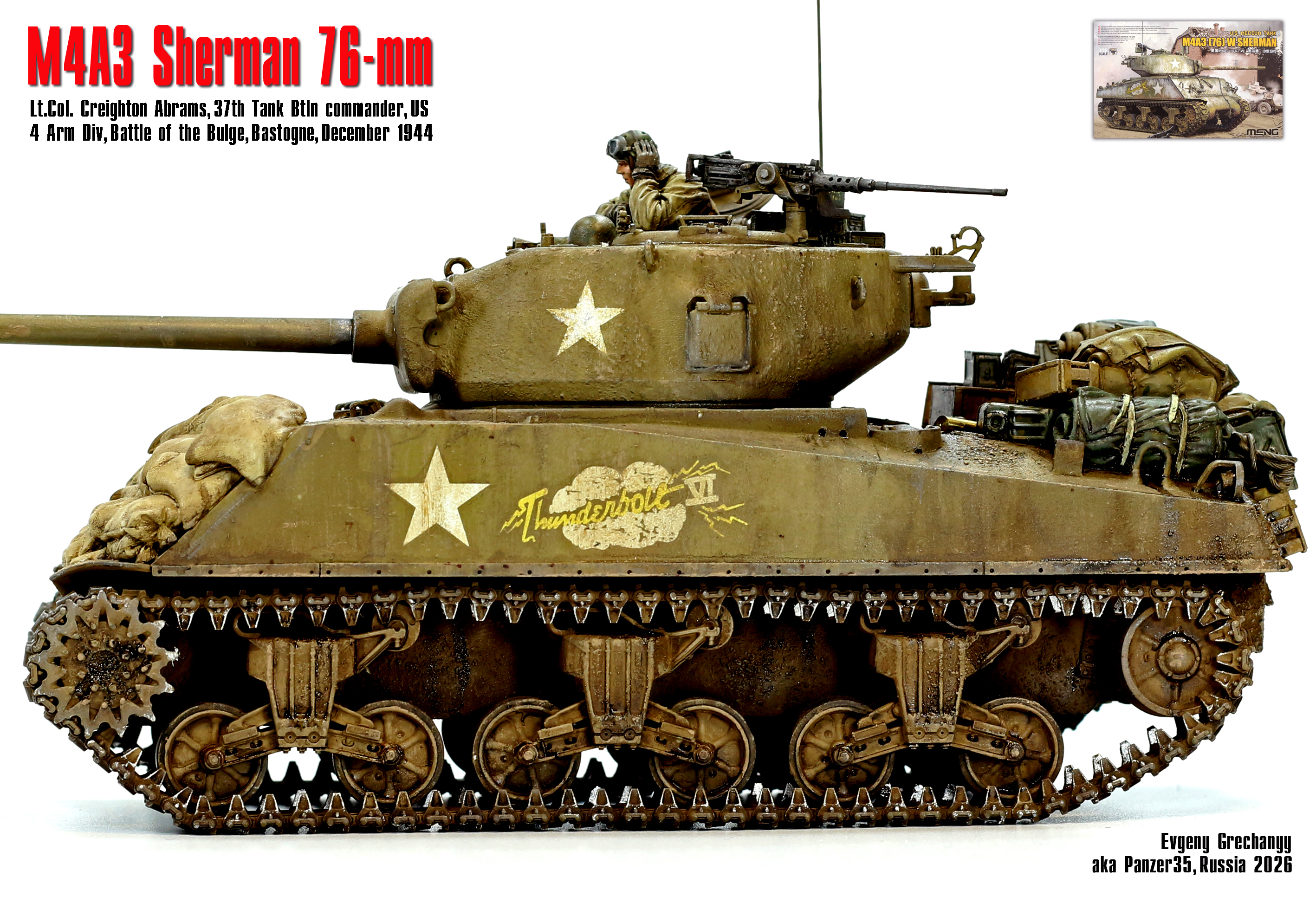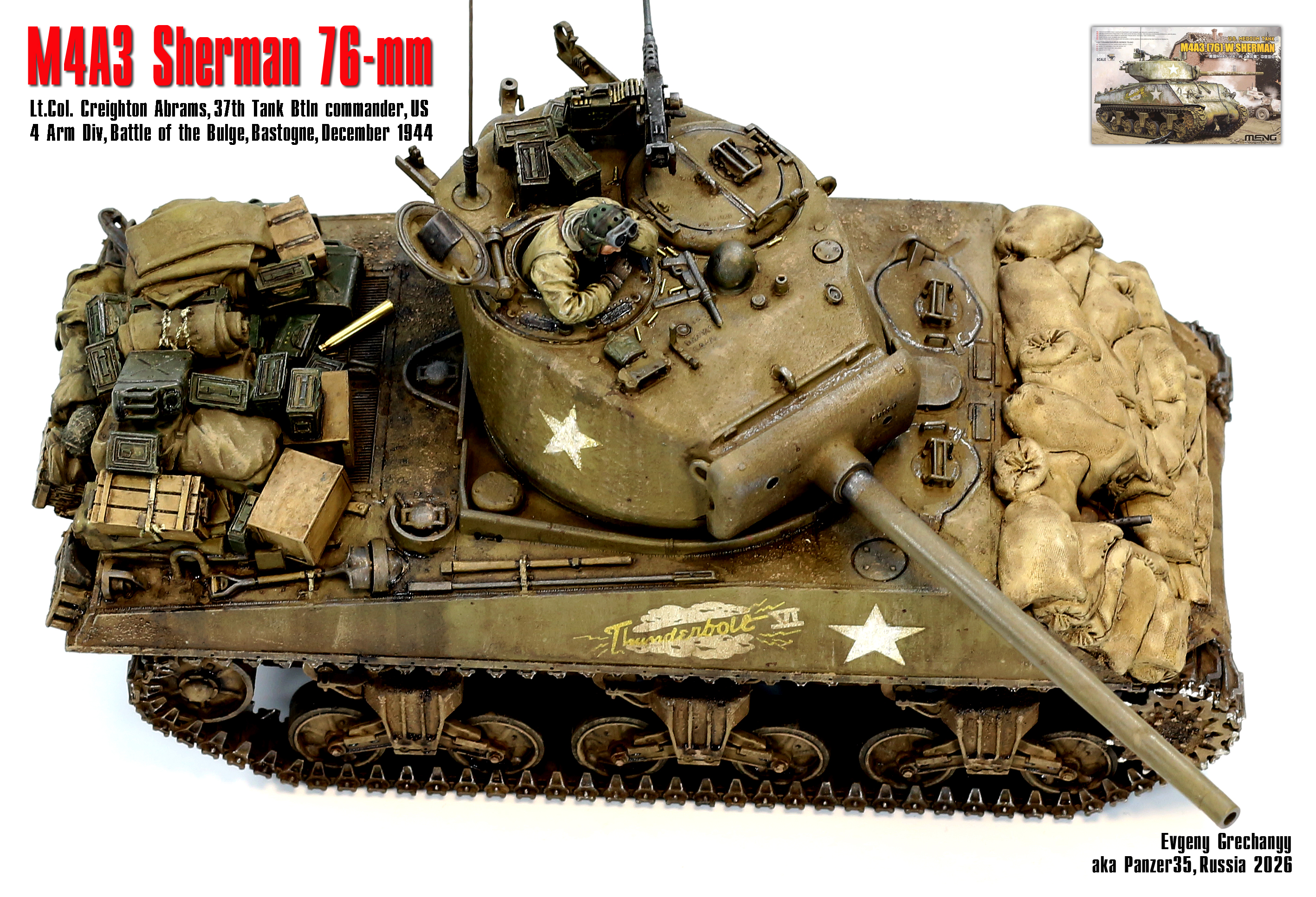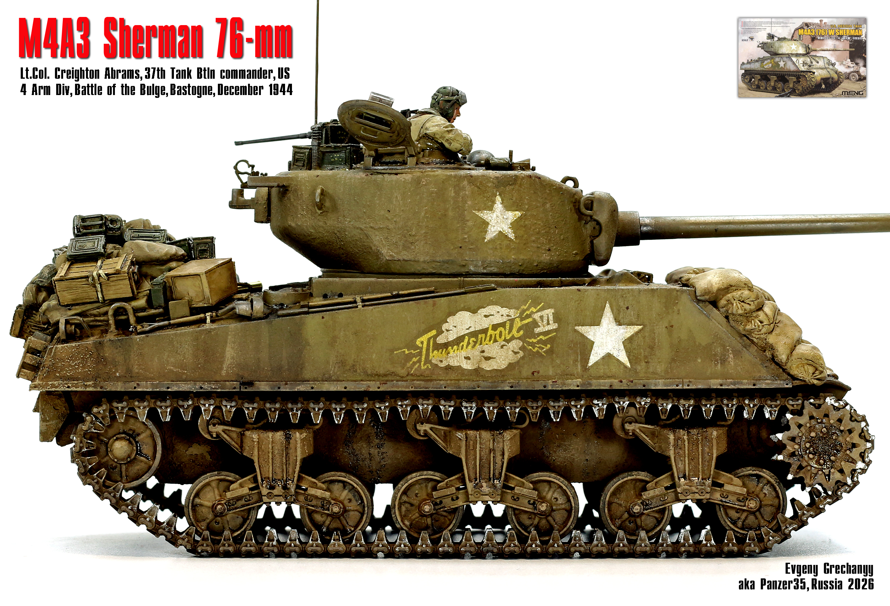 Китайская фирма Менг выпустила модель танка М4А3 76-мм в 2019 году. Боксарт у модели, как всегда просто шикарный: танк самого известного американского танкиста подполковника Крэйтона Абрамса ведет бой где-то в Западной Европе, возможно даже в пригородах знаменитой Бастони. Шерман назван Thunderbolt VI – все танки Абрамса несли это имя, а их порядковый номер менялся, когда он пересаживался на новый танк. Первый М4 75-мм, на котором Абрамс воевал Европе нес имя Тандерболт V – он был полностью изношен к осени 1944 и поэтому, Абрамс, как командир 37-го батальона получил эту новую машину с 76-мм пушкой.