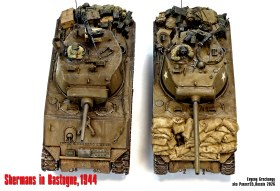 Надо сказать, что американские танкисты не спешили менять свои старые 75-мм М4 на новые 76-мм из-за ослабленного действия их фугасных снарядов. Поэтому командование поручило комбату Абрамсу принять новый танк и своим примером показать, что на таких машина воевать можно не хуже, а даже лучше чем на старых танках. С этим заданием Абрамс блестяще справился – его экипаж стал самым результативным среди всех американских танкистов. На боксарте «Шерман» Абрамса дается в облезшей побелке – но на самом деле это неверно, так как в декабре 1944 года, когда шли бои за Бастонь во время Арденнского наступления немцев, снега почти не было и вся техника США не была побелена. Тоже самое можно сказать и о немецких танках того периода боев – они были в стандартном летнем камуфляже.