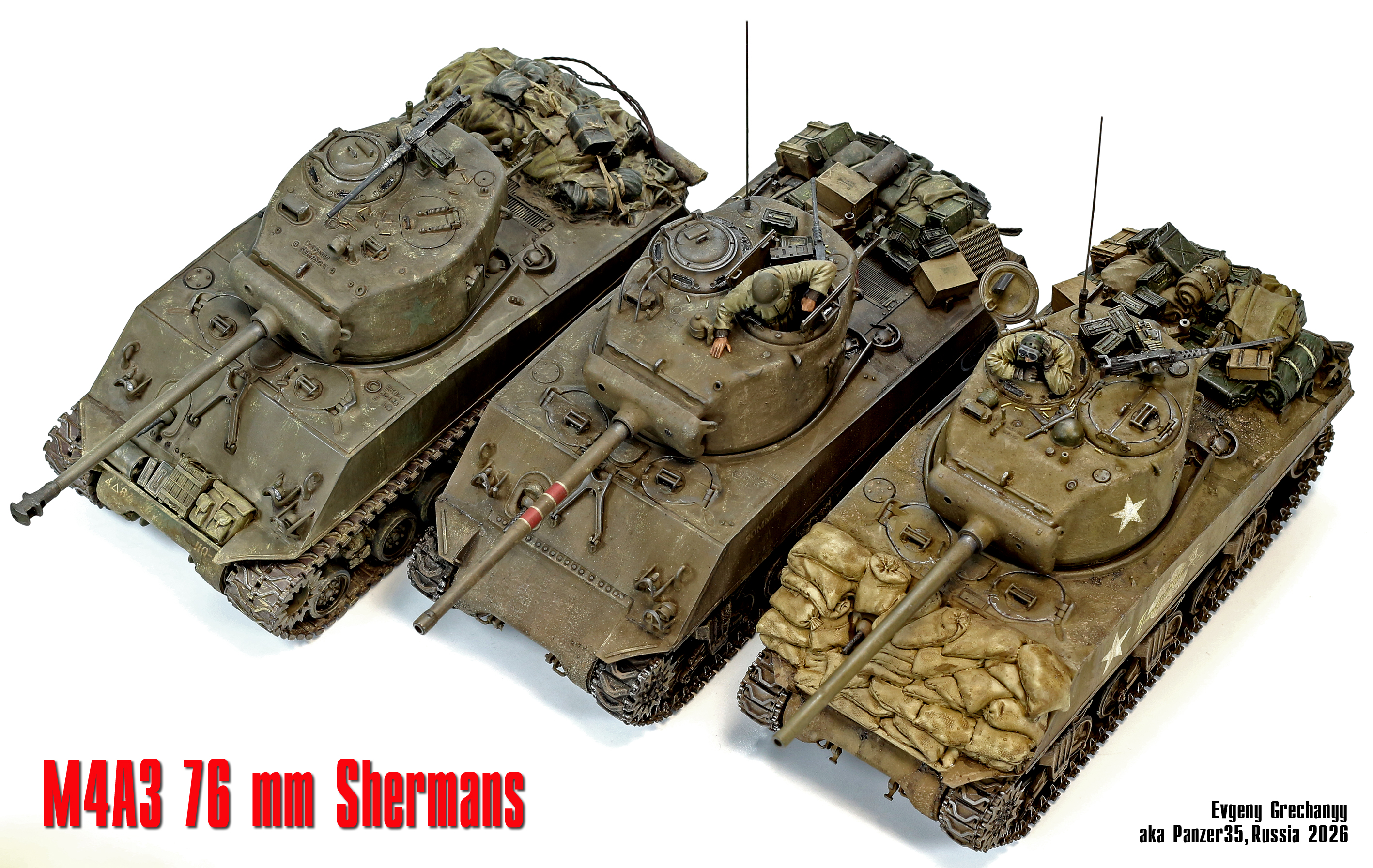 Танк М4 Шерман – самый массовый танк союзников во Второй мировой войне. Его модификация М4А3 с 76-мм орудием была создана для борьбы толстобронными немецкими танками – она могла пробить даже лобовую броню Тигра при удачном стечении обстоятельств. Такие танки начали выпускать в марте 1944 года, поначалу они оснащались стандартной вертикальной подвеской – выпустили таких машин около 1400 шт. Осенью 1944 года танк оснастили горизонтальной подвеской с расширенными траками – и такую модификацию выпускали уже до конца войны.
