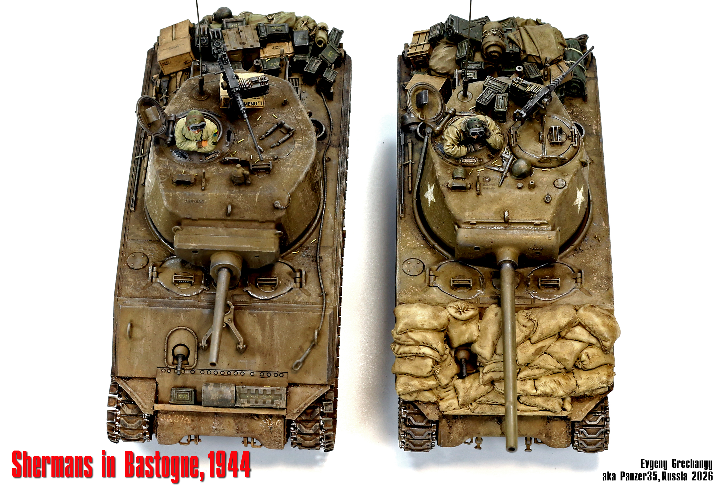 Звездовские траки встали на менговский Шерман как родные! В остальном модель прекрасно собирается из коробки. На лоб корпуса решил уложить броню из мешков – для придания колорита модели. Такой набор от Panzer Art давно у меня лежал в закромах – вот пригодился. Накидал на танк всякой поклажи армии США того периода – американцы всегда любят возить с собой много разного барахлишка. Красил модель тамиевским акрилом, тонировал разными жидкостями. В конце работы добавил смоляную фигуру командира танка. Вот такой несложный проект получился.