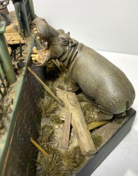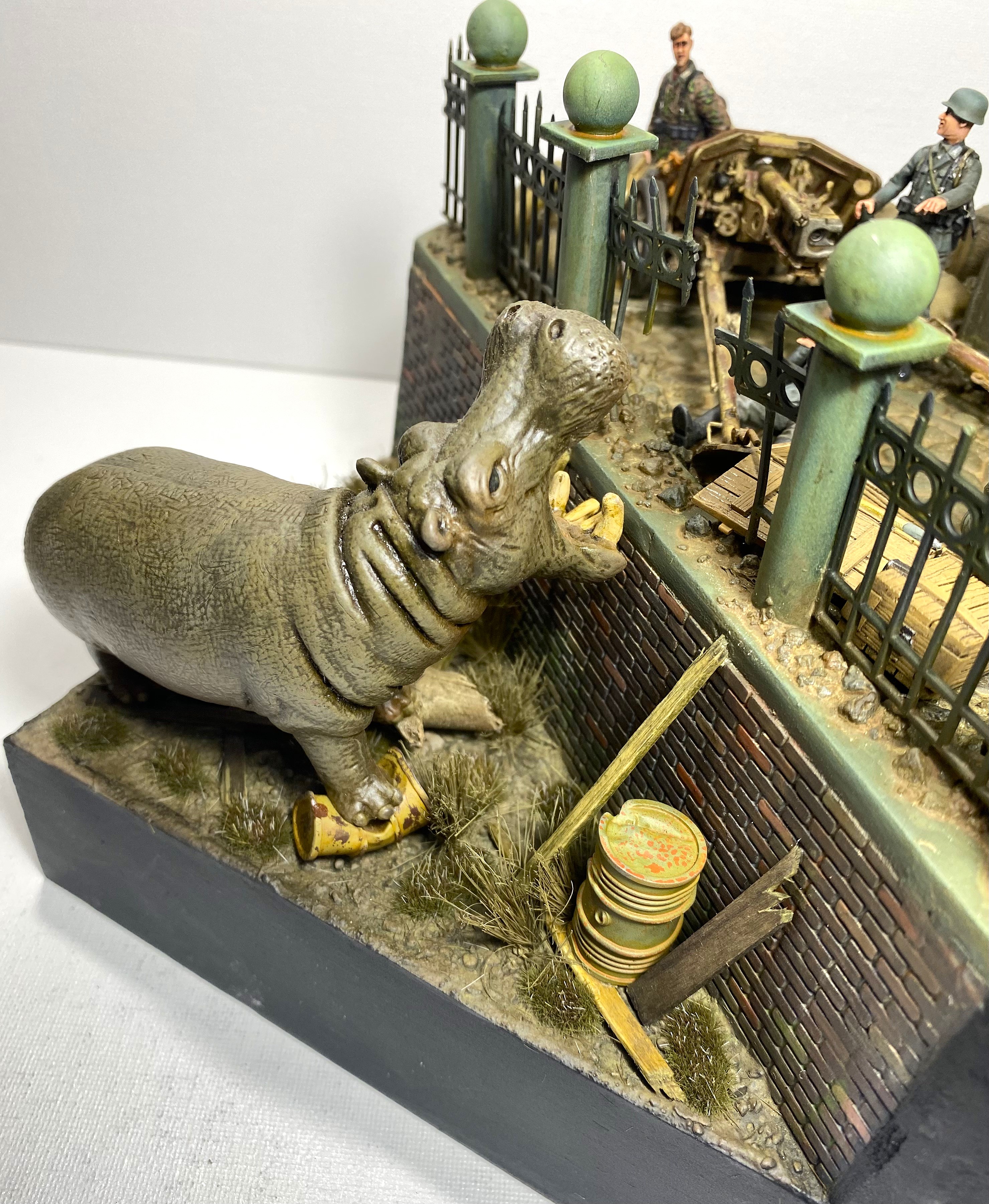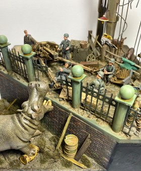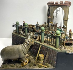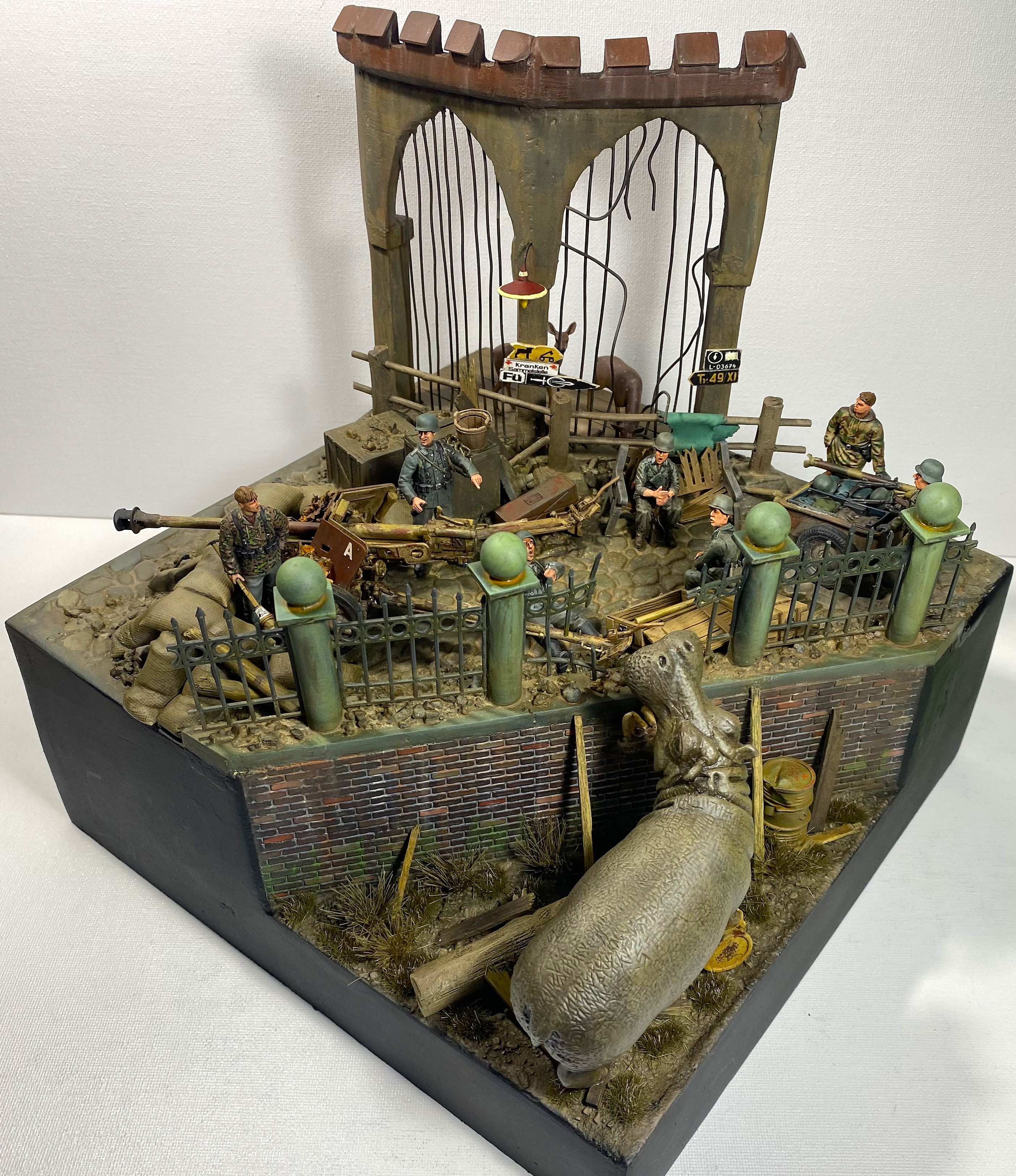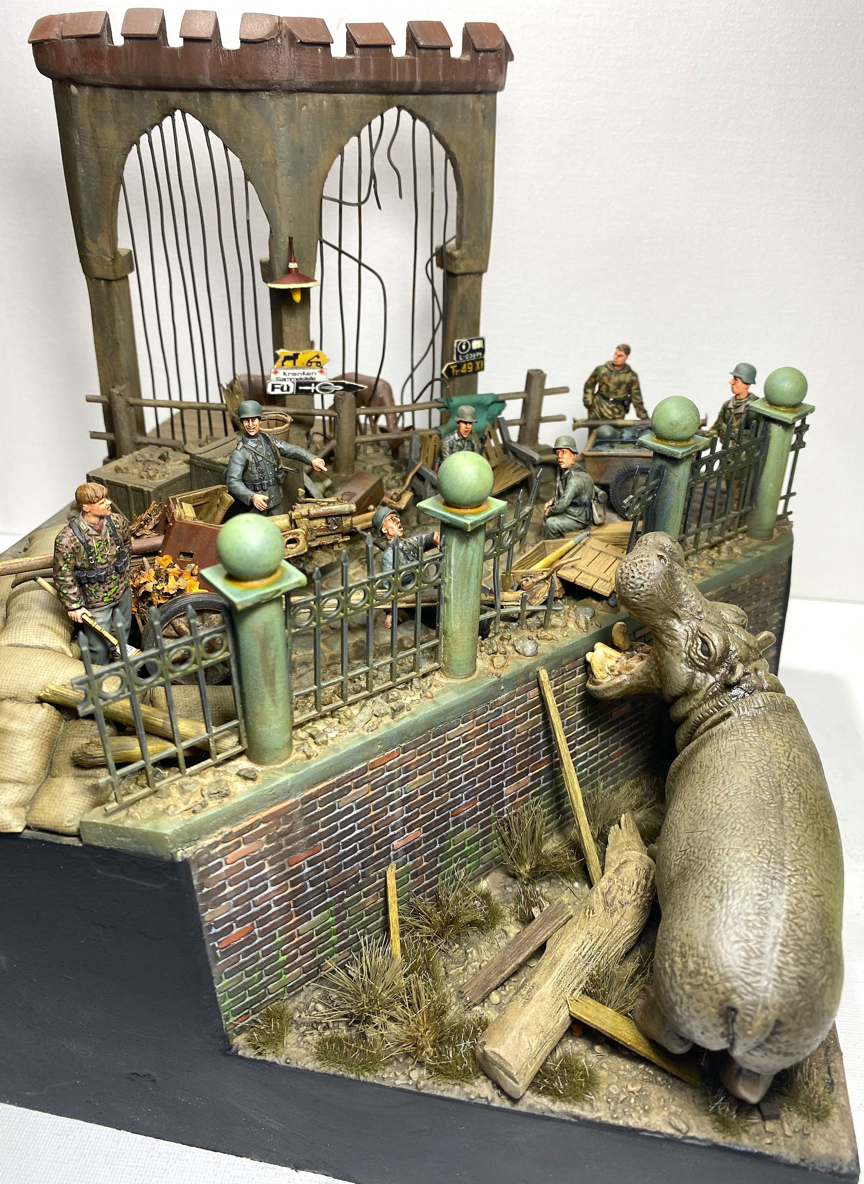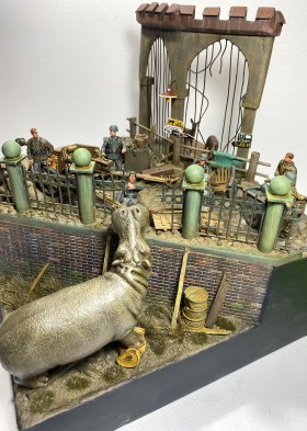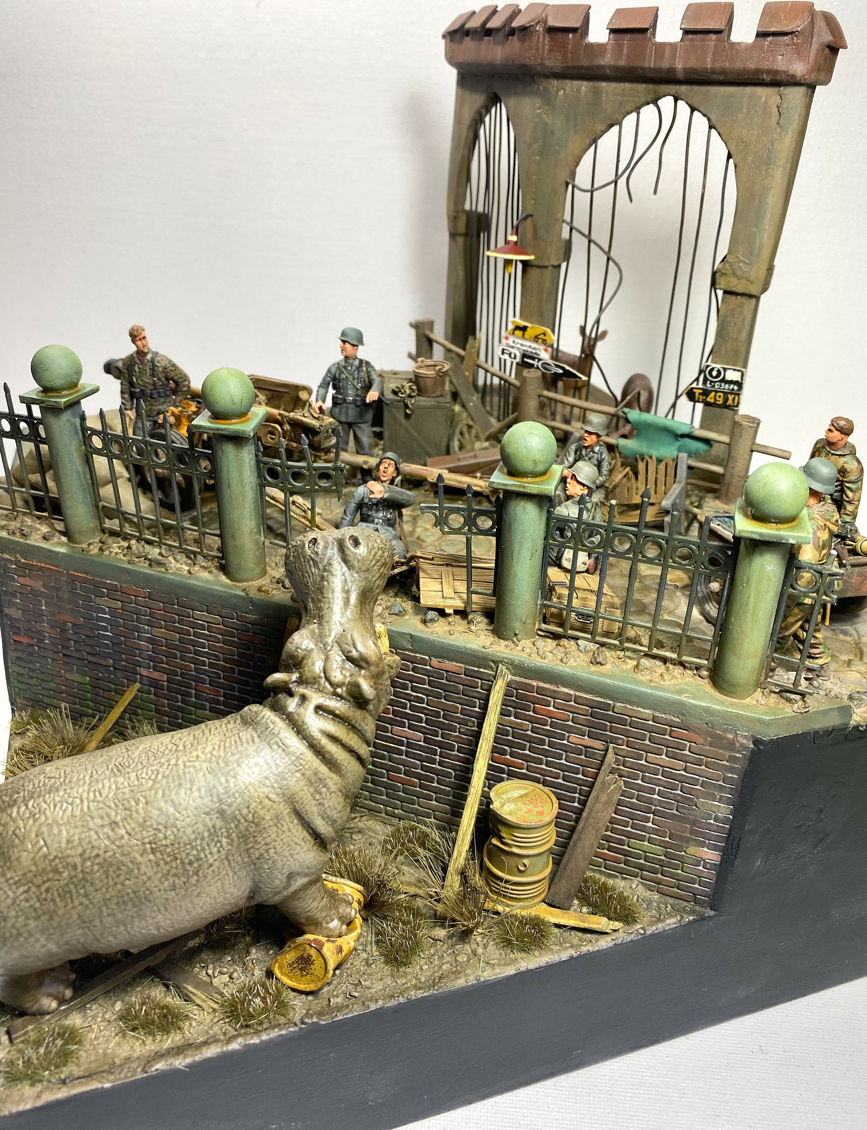 Проникнувшись этой историей, я решил посвятить «бегемотной» теме свой следующий проект в формате объемной диорамы. Интересно изобразить динамическую сцену с участием бегемота. Собирая необходимый материал, я наткнулся на менее известную историю о другом «военном» бегемоте и она показалась мне более подходящей. В Кенигсберге, в апреле 1945 года, когда советские войска готовились к штурму этой крепости, а немецкие части занимались укреплением обороны, в местном зоопарке продолжали томиться в клетках самые разные животные. Позиции немецкой обороны проходили через зоопарк, и трудно было надеяться, что животные смогут спокойно пережить грядущие бои. Действительно, так или иначе, еще до боев, голод, бомбежки, шальная стрельба стали причиной гибели многих уникальных животных, а в живых остались только четверо - лань, барсук, осел и бегемот. Остановимся подробней на последнем.