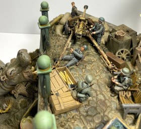 Немецкая пушка Pak40 от фирмы Tamiya. Она собрана из коробки, без существенных дополнений. В виде эксперимента добавил естественный камуфляж из веток с листвой. Ветки выполнены из проволоки, листву имитировал с помощью синтепона и подкрашенных модельных листочков из Китая.