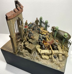 Покраска производилась спиртовым акрилом Tamiya и Mr. Hobby. Тонировка стандартная: фильтры, смывка, эффекты, пигменты AK и Ammo MIG, местами пользовался химией фирмы 128. Общую тонировку выполнил масляной краской фирмы «Невская палитра». Фигуры расписывал смешанной техникой, используя как акрил, так и темперную краску.