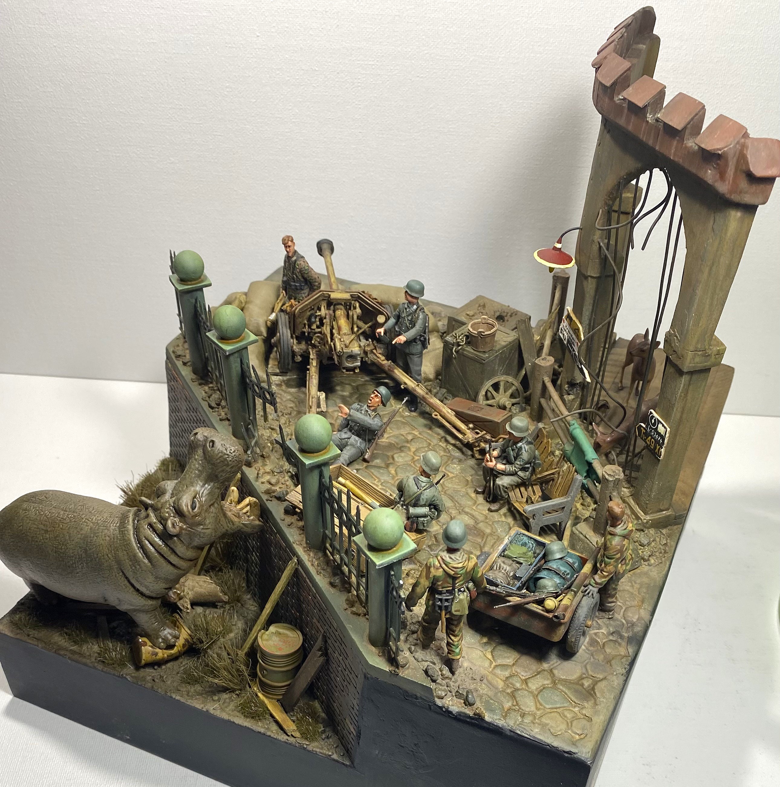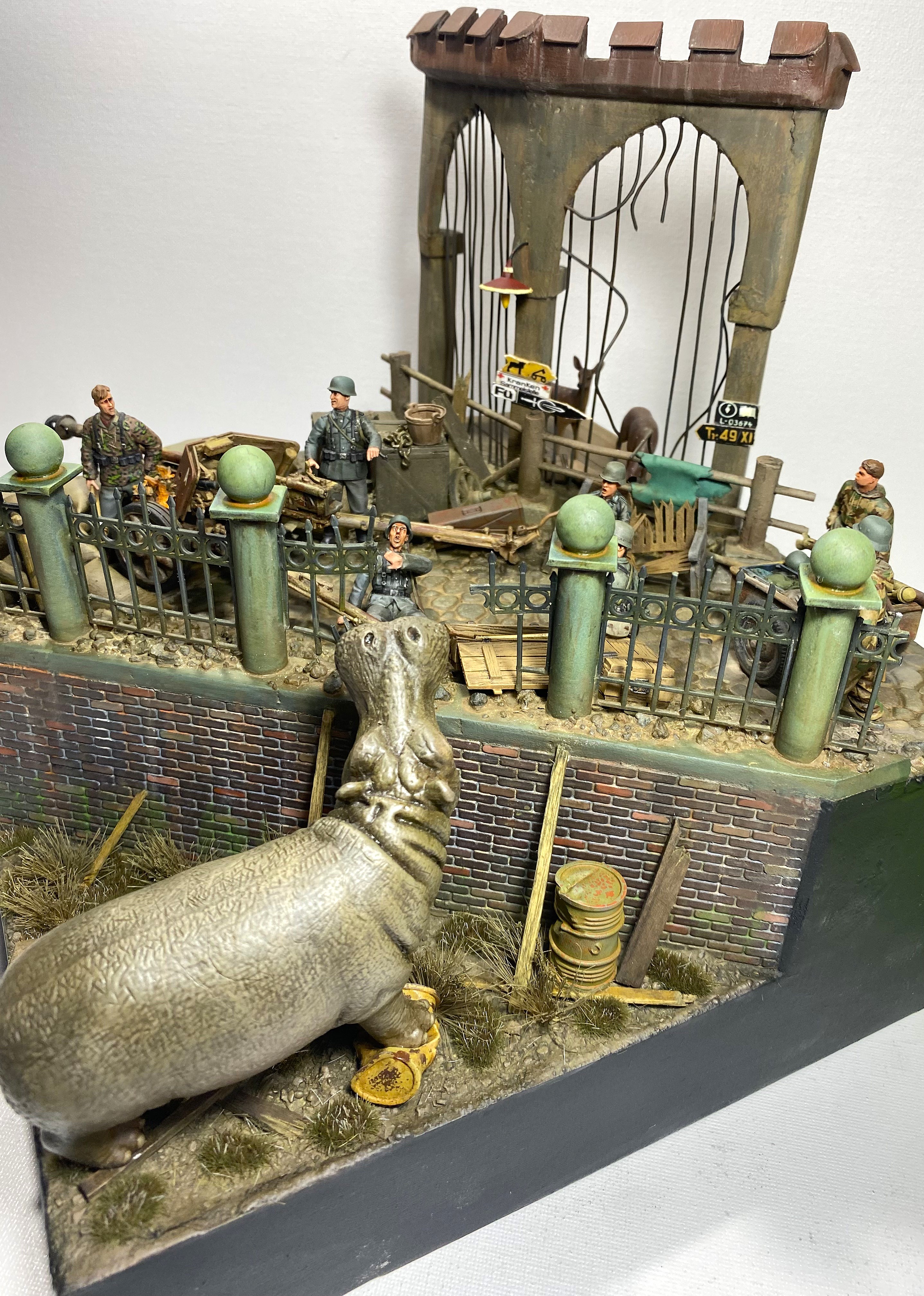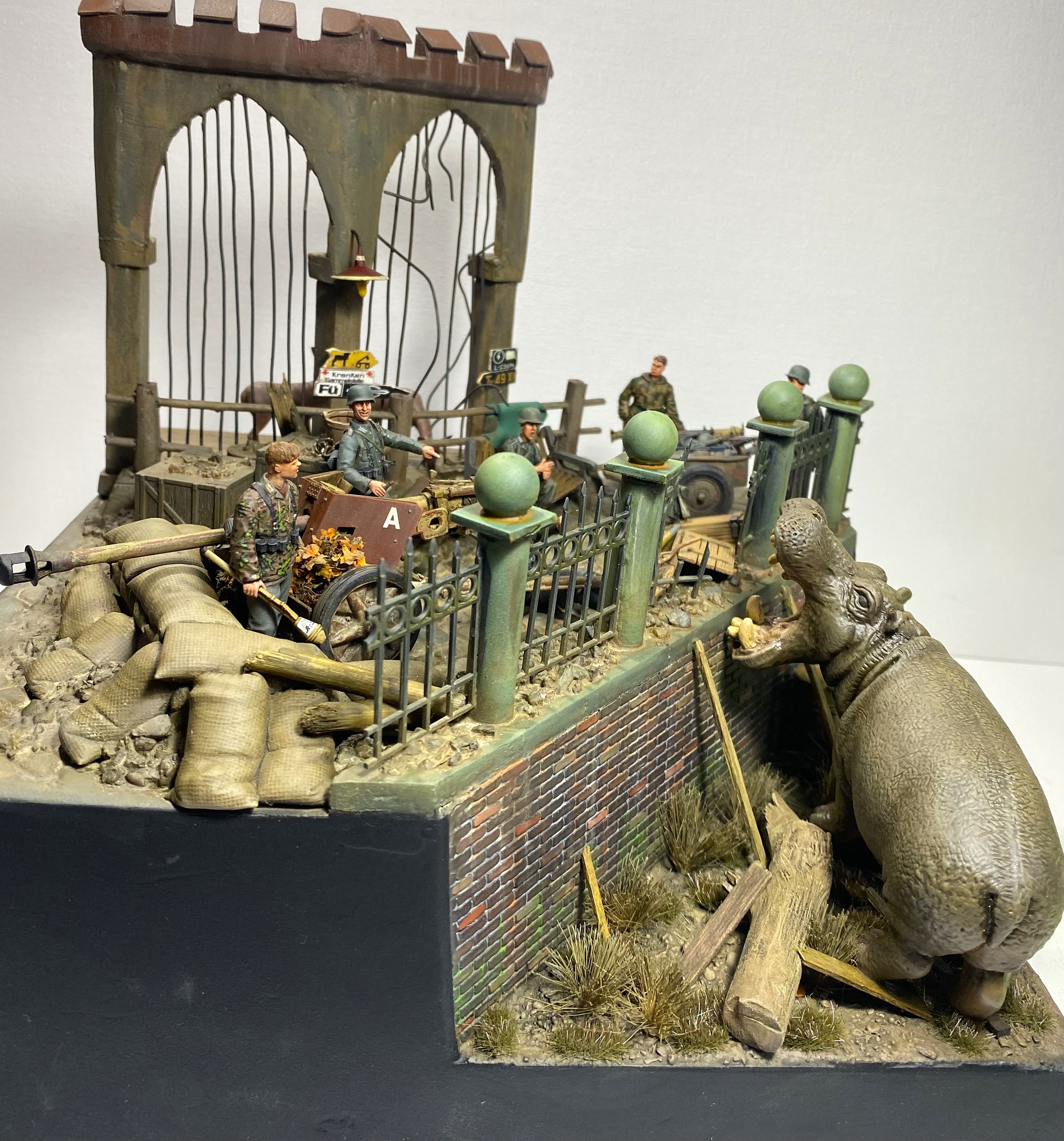 Момент бегства Ганса из зоопарка я и решил изобразить на своей диораме. Немецкие солдаты, неспешно занимающие укрепленную позицию, точно не ожидают от «местного жителя» динамичного перфоманса. Ганс пугает солдат и пользуясь их растерянностью покидает опасную зону.