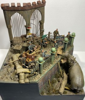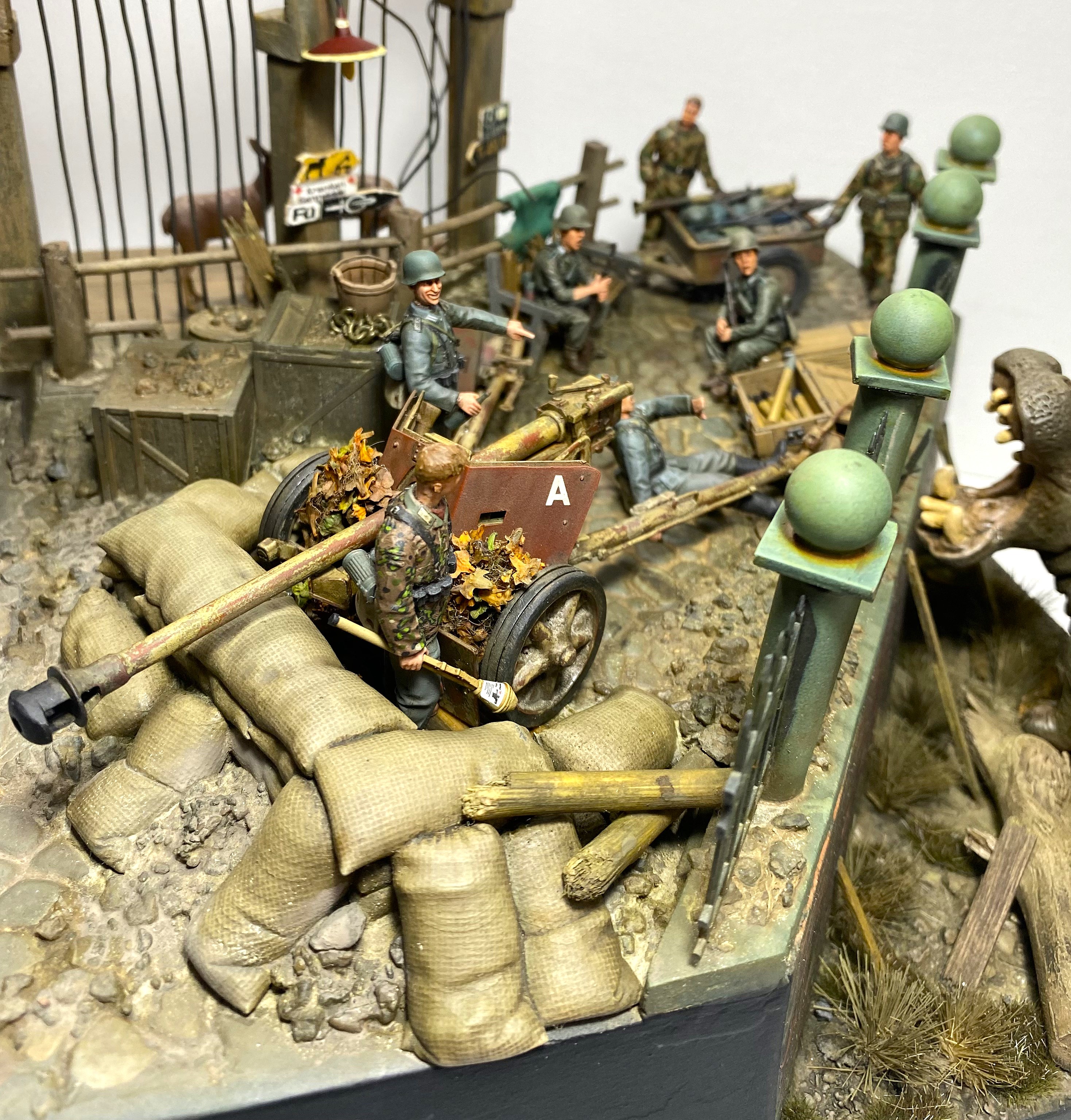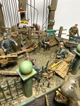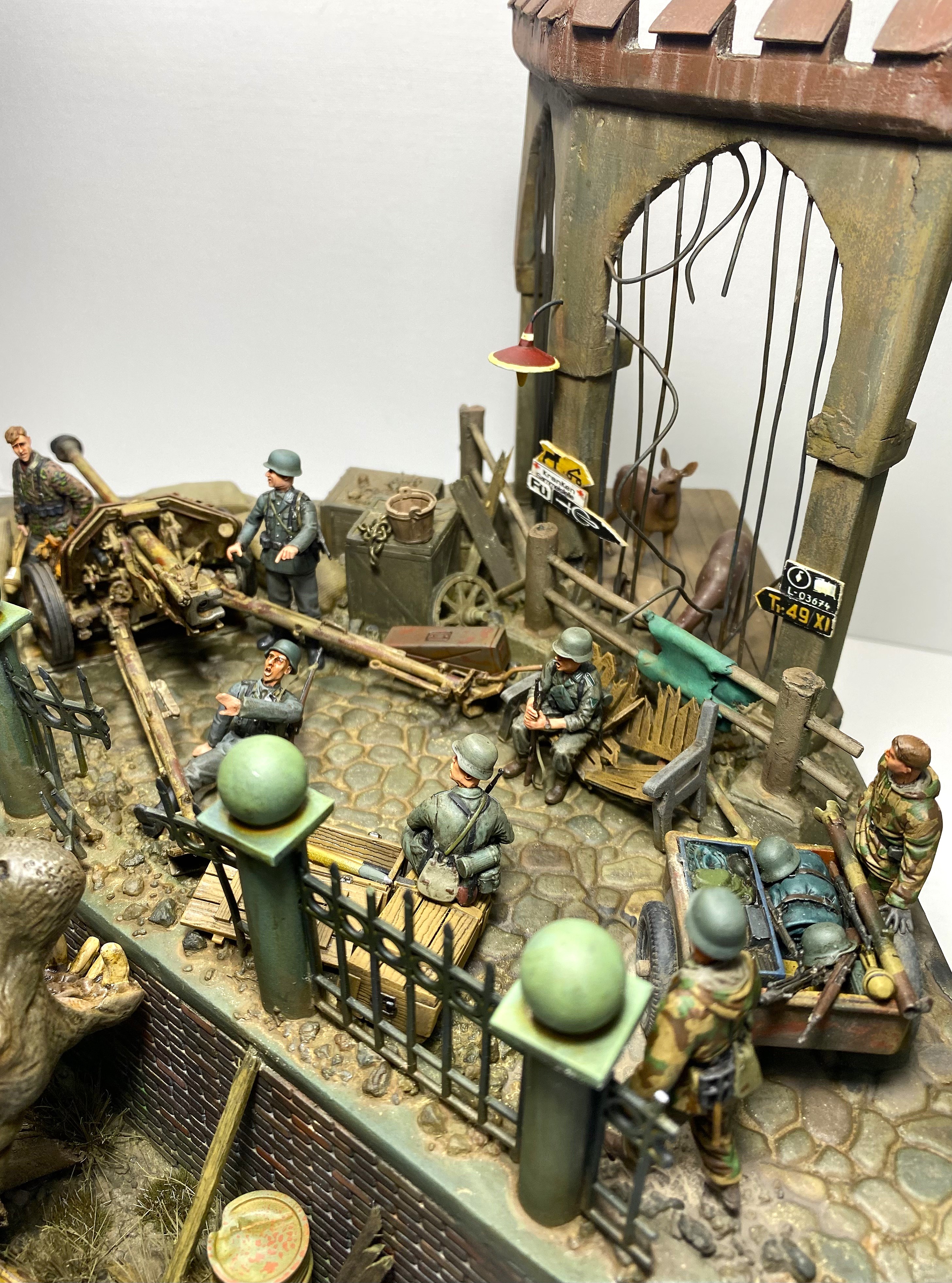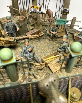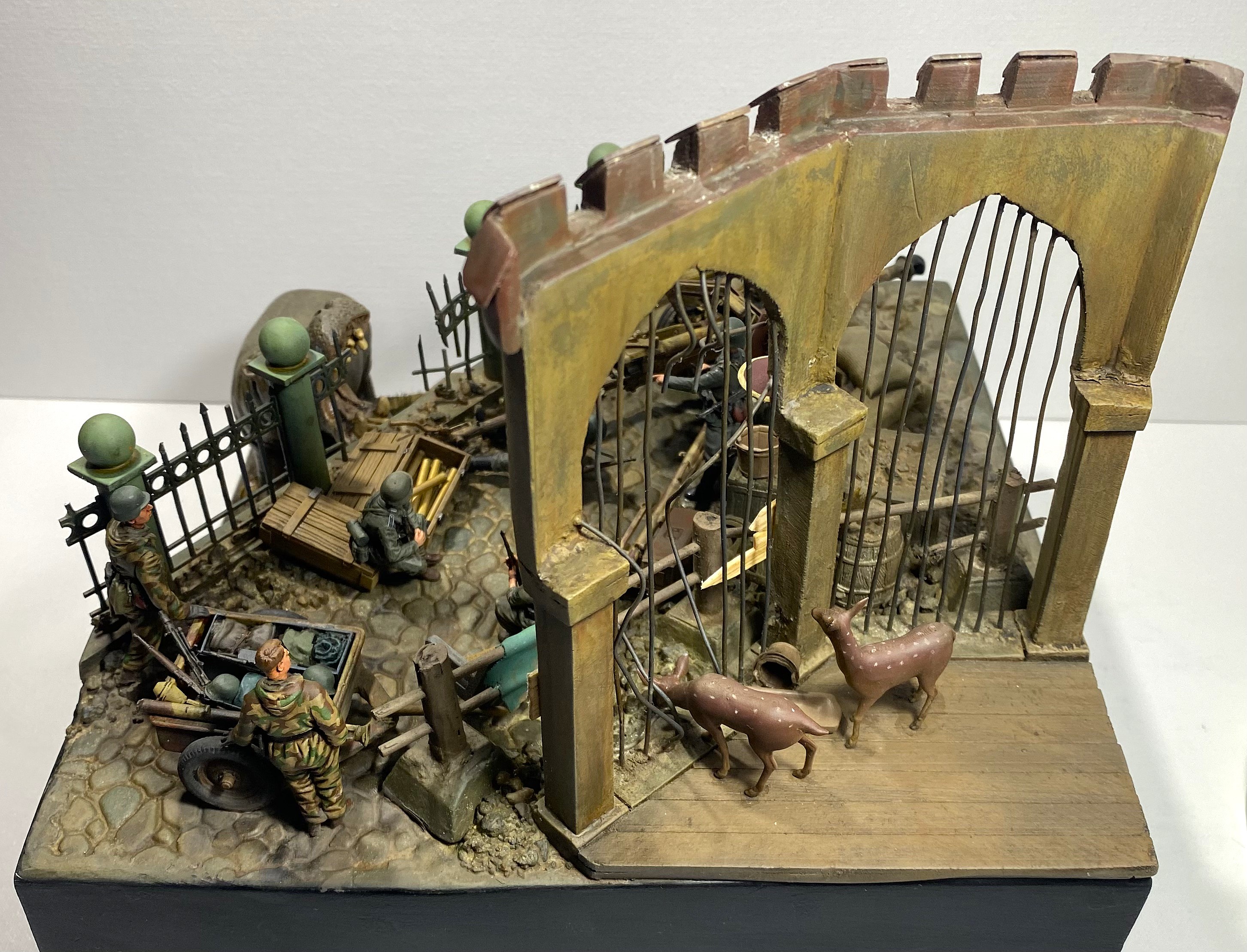 Момент бегства Ганса из зоопарка я и решил изобразить на своей диораме. Немецкие солдаты, неспешно занимающие укрепленную позицию, точно не ожидают от «местного жителя» динамичного перфоманса. Ганс пугает солдат и пользуясь их растерянностью покидает опасную зону.