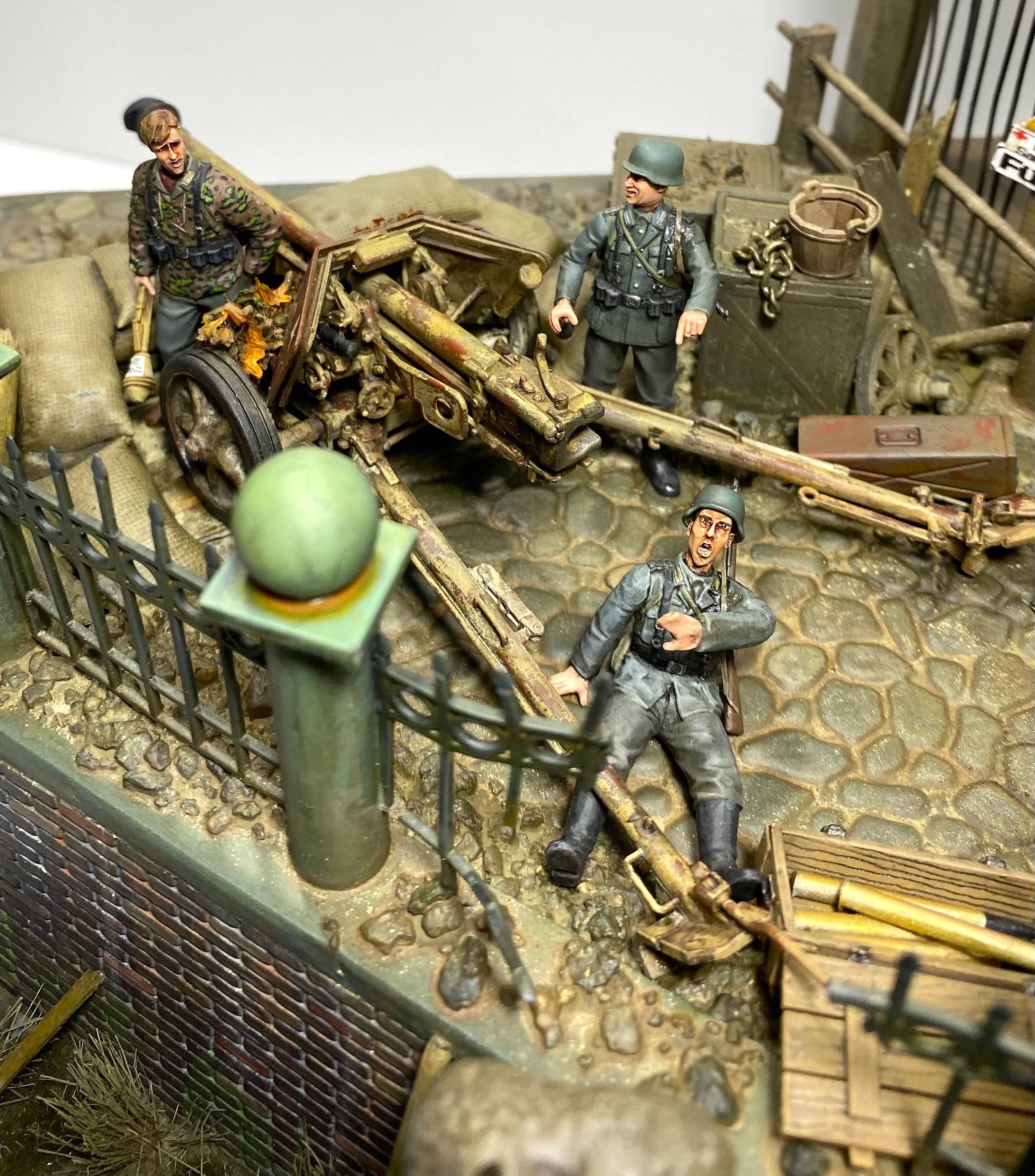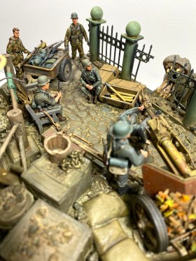Что касается пехоты, то тут сборная «солянка». Я использовал сразу три набора. «Немецкие охотники на танки» от Masterbox после легкой конверсии заняли позиции около орудия. В центре расположились два сидячих панцергренадера из набора от Miniart. Правее - два гренадера в камуфляжной форме от Hobby Boss. Все солдаты получили новые, печатные головы с выразительными лицами. Ручная тележка изготовлена мной упрощенно, буквально из обрезков пластика, алюминиевой проволоки и остатка каких-то колес.