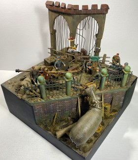 Теперь о самой диораме. В основе работы - база, выполненная из пенопласта и обшитая тонким листовым пластиком. Земля под бегемотом симитирована из структурной пасты ZIP, растительность сделана из ворса малярной кисти и окрашена. Структура кирпичной кладки из набора собственно кирпичных стен от Tamiya. Ограда выполнена из круглого пластикового профиля, листового пластика и шариков для подшипников. Между столбами забор из набора для диорам от Miniart. Мостовая под орудием это пластиковый структурный лист формата А4 от фирмы Mоrrison. Деревянная ограда и фрагмент вольера выполнил самостоятельно из листового пластика разной толщины. По месту использовал проволоку, круглые деревянные палочки, рейки, мелкую гальку, камешки, модельный песок.