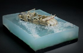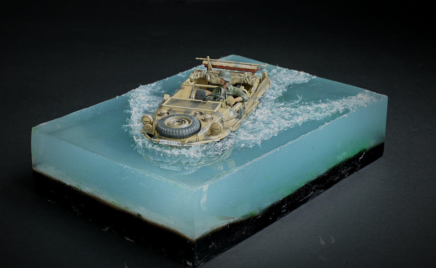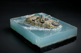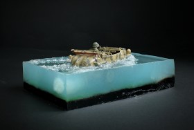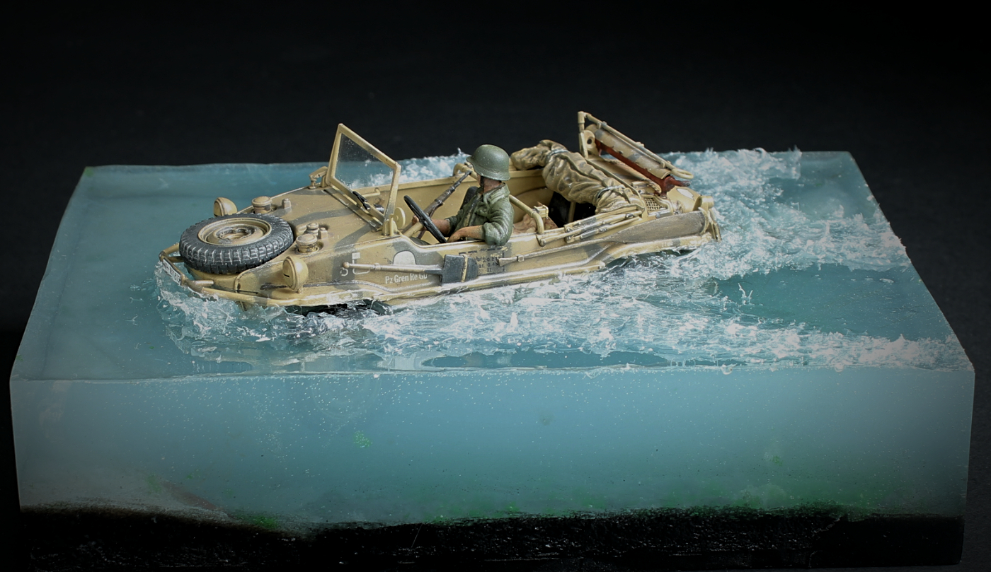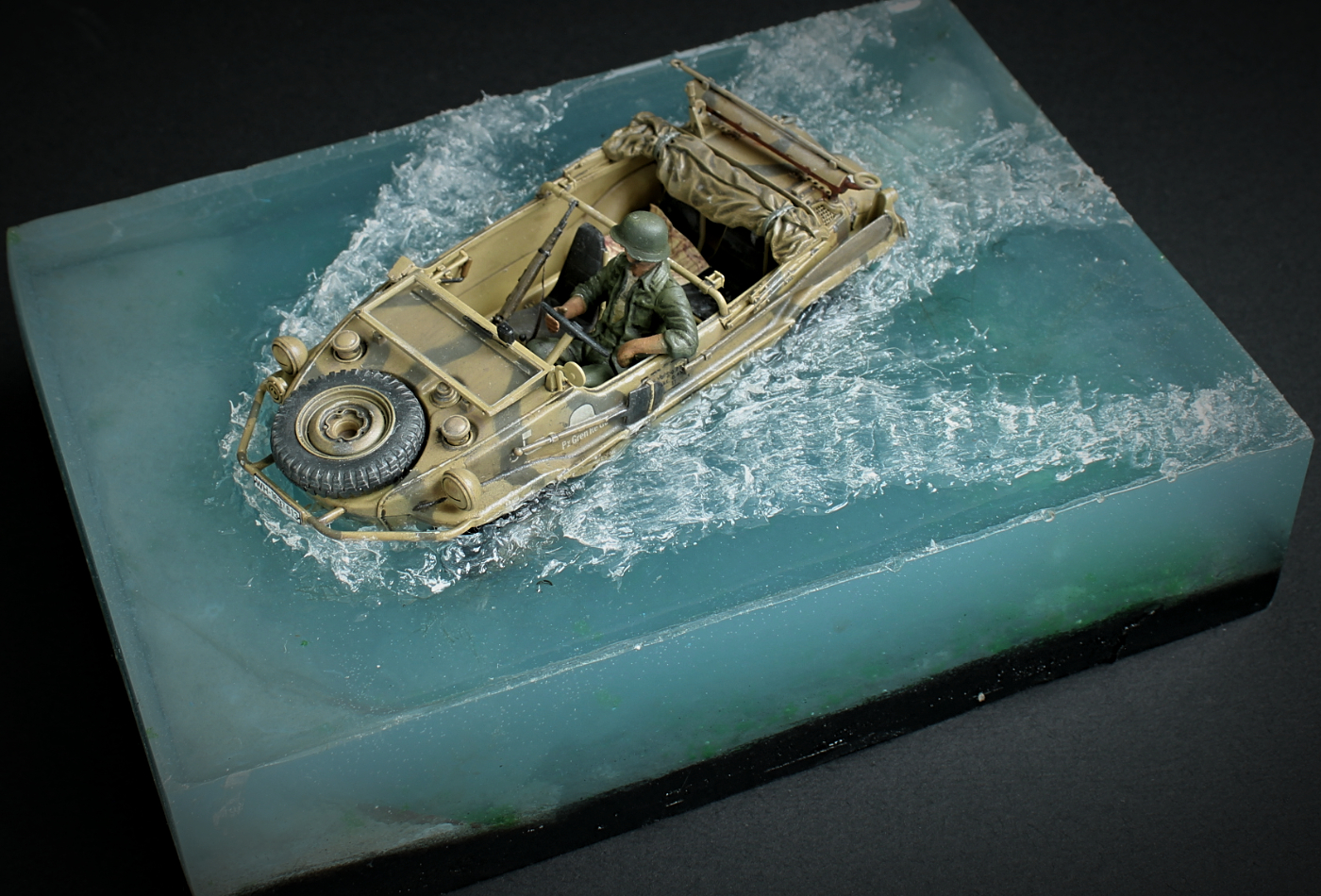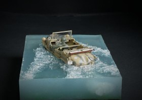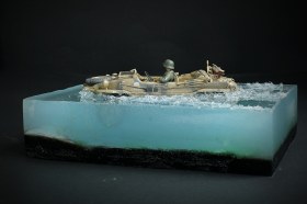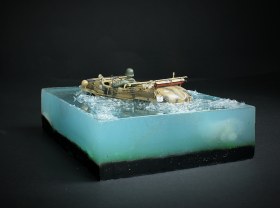 Модель в сборке простая,собирается на ура,из дополнений декали от Кванты.В салон кинул винтовку и карту,что бы небыло совсем пусто.Уже после сборки и окраски решил сделать модель на воде,это первый опыт,но вроде получилось более менее.Немного перелил краски в смолу,основание получилось не совсем прозрачное.Думаю надо было оставить просто чистую смолу.