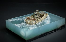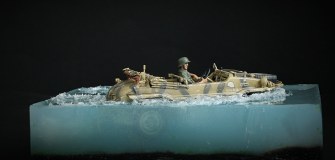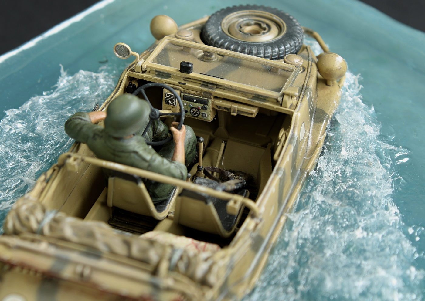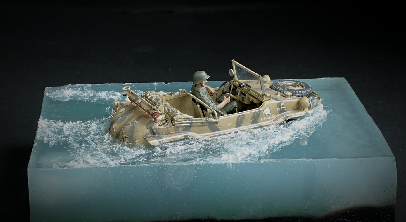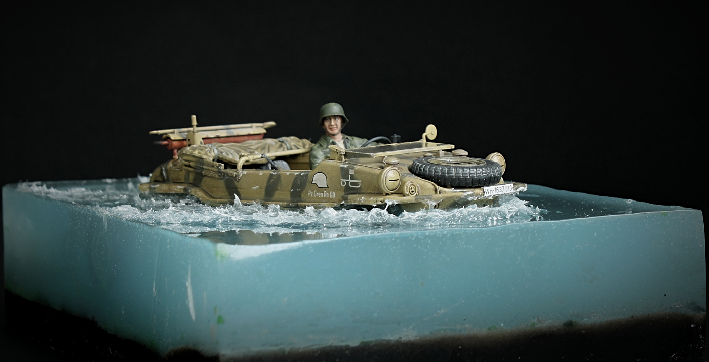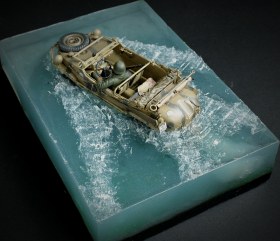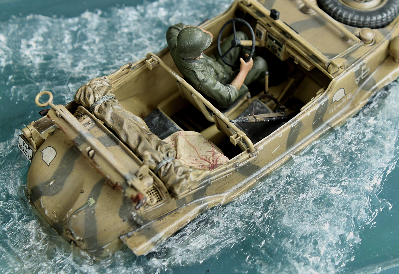 Модель в сборке простая,собирается на ура,из дополнений декали от Кванты.В салон кинул винтовку и карту,что бы небыло совсем пусто.Уже после сборки и окраски решил сделать модель на воде,это первый опыт,но вроде получилось более менее.Немного перелил краски в смолу,основание получилось не совсем прозрачное.Думаю надо было оставить просто чистую смолу.