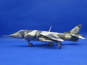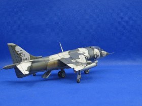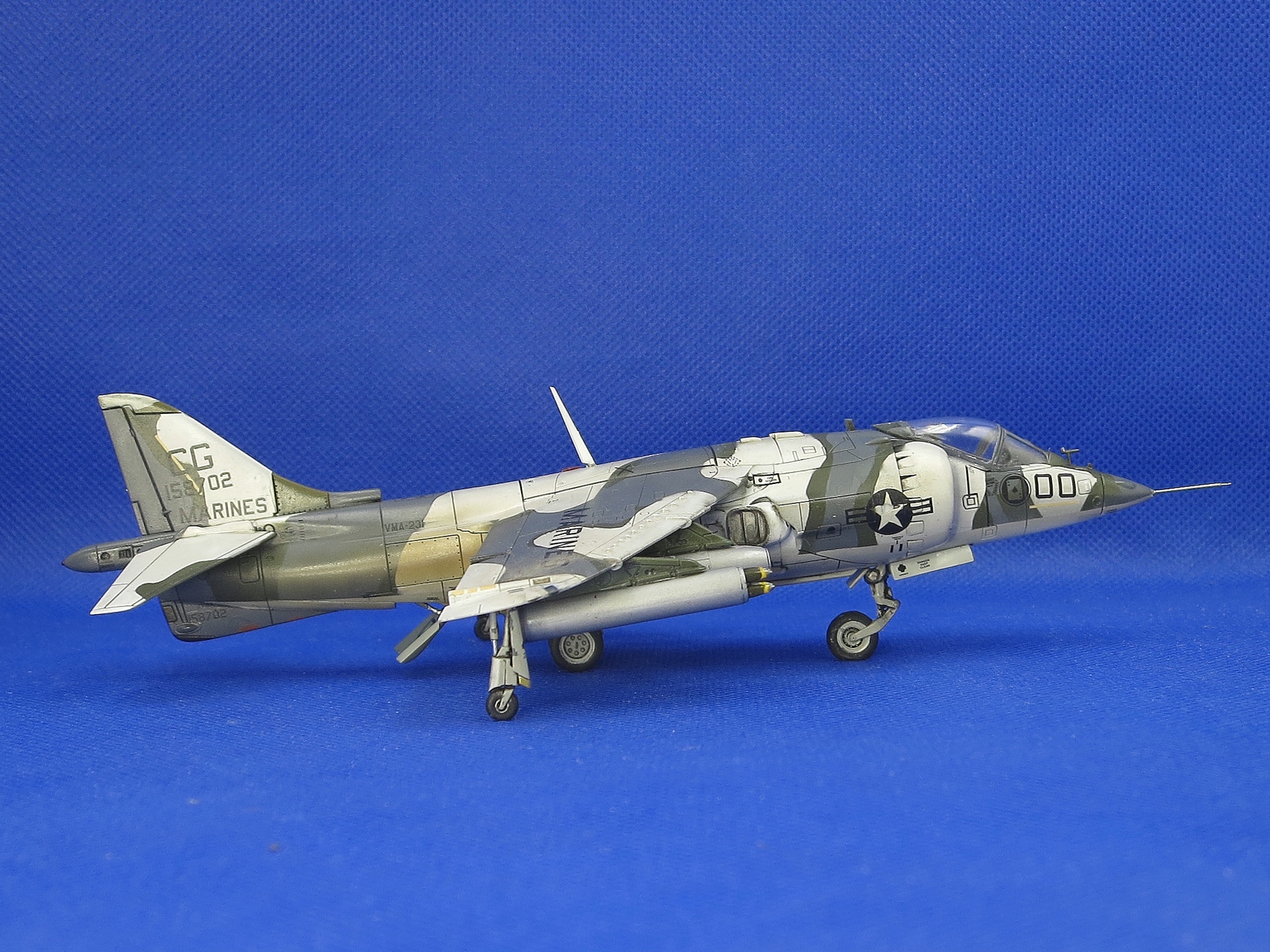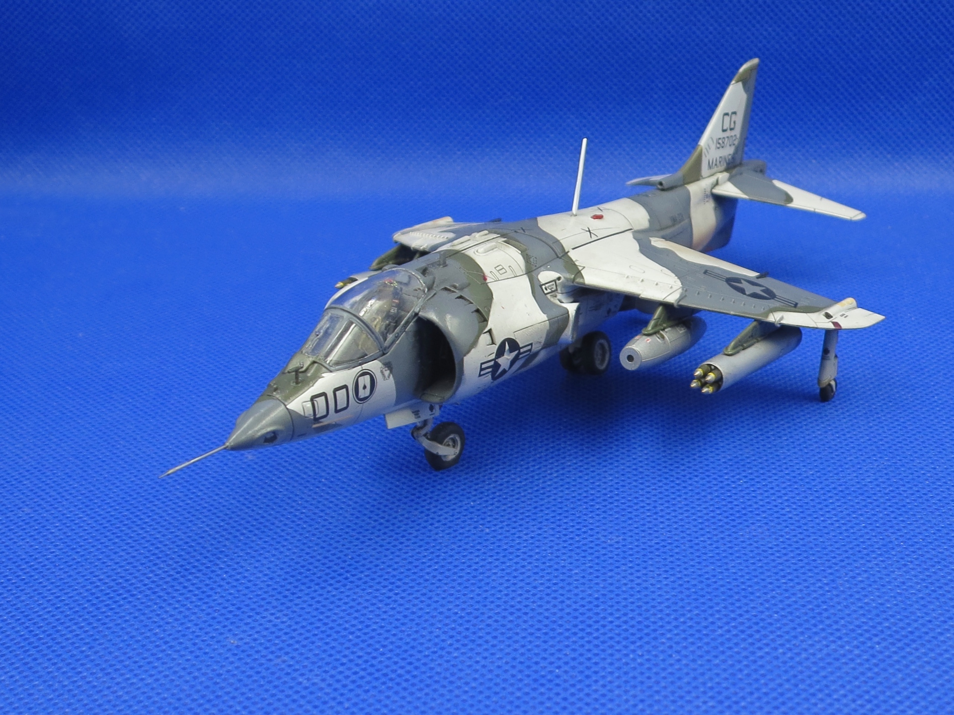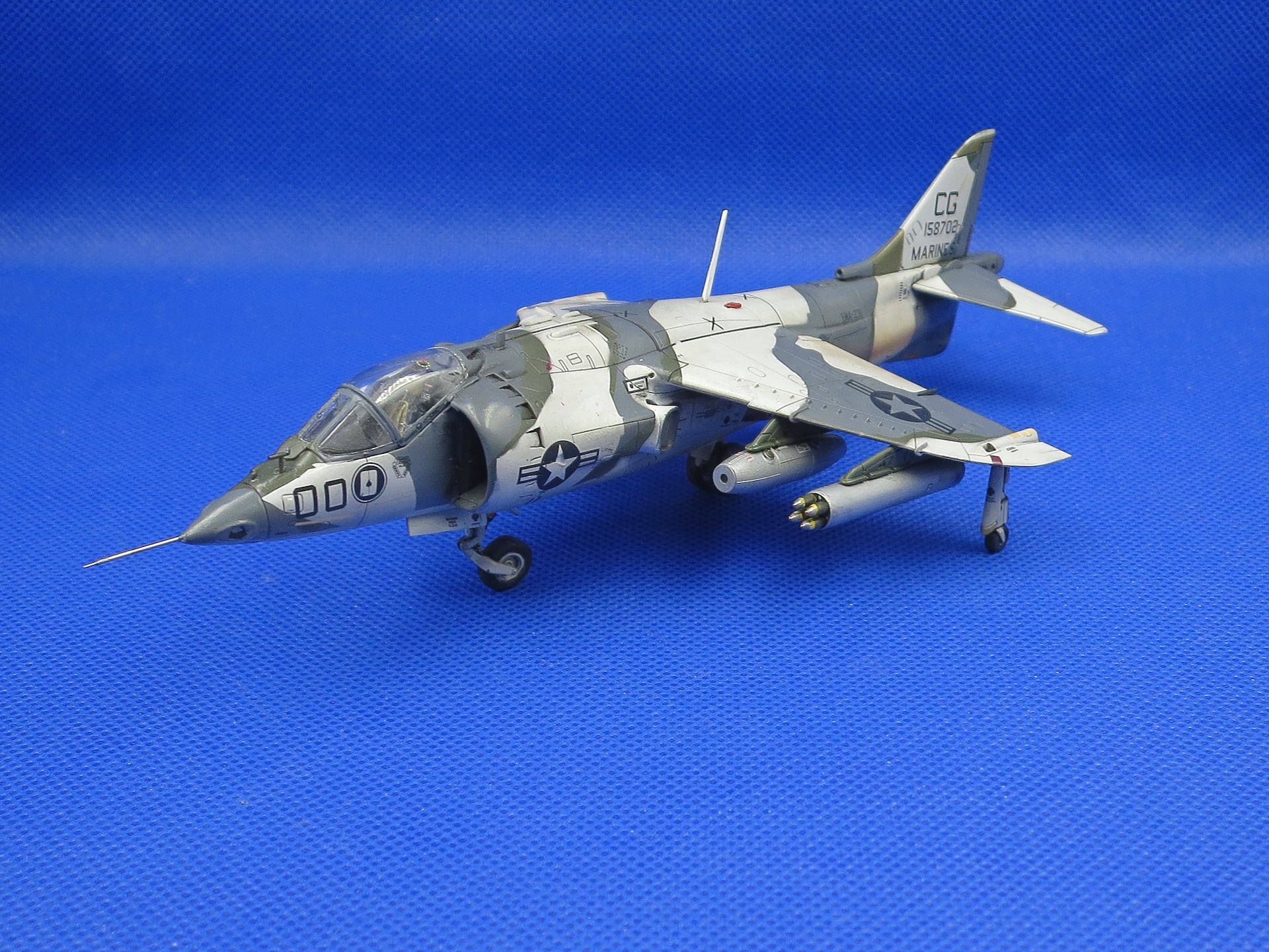 Airfix в этом наборе предлагает два варианта: обычный британский серо-зеленый GR1 и нестандартный камуфляж AV-8A, который, тем не менее многие любят делать, если верить фотографиям в интернете. В сети существует буквально пара фотографий исходного борта, из которых можно сделать вывод. что дело происходило в Неваде, а камуфляж нанесли не очень аккуратно по зеленому фону стандартного британского камуфляжа, пару раз перекрыв и серый цвет. Загадку зачем данный вариант нужен был в пустынной Неваде разгадать так и не удалось. Цифры 00 обычно соответствуют командному составу, но опять же "вроде бы" на нем летали многие. Данный борт был списан в 1986 году.