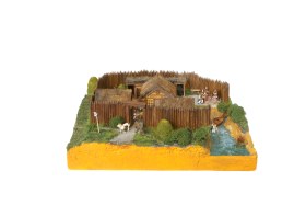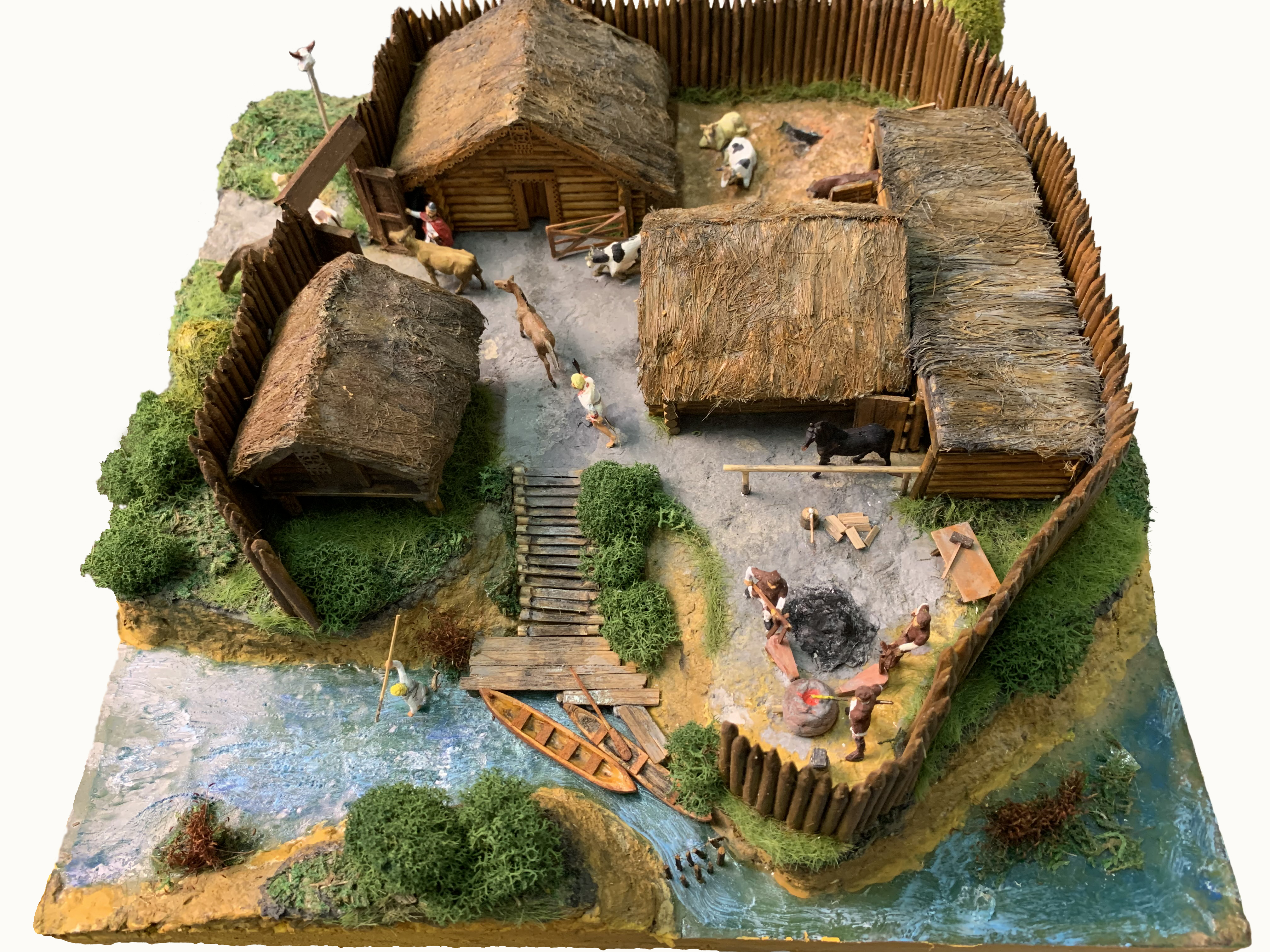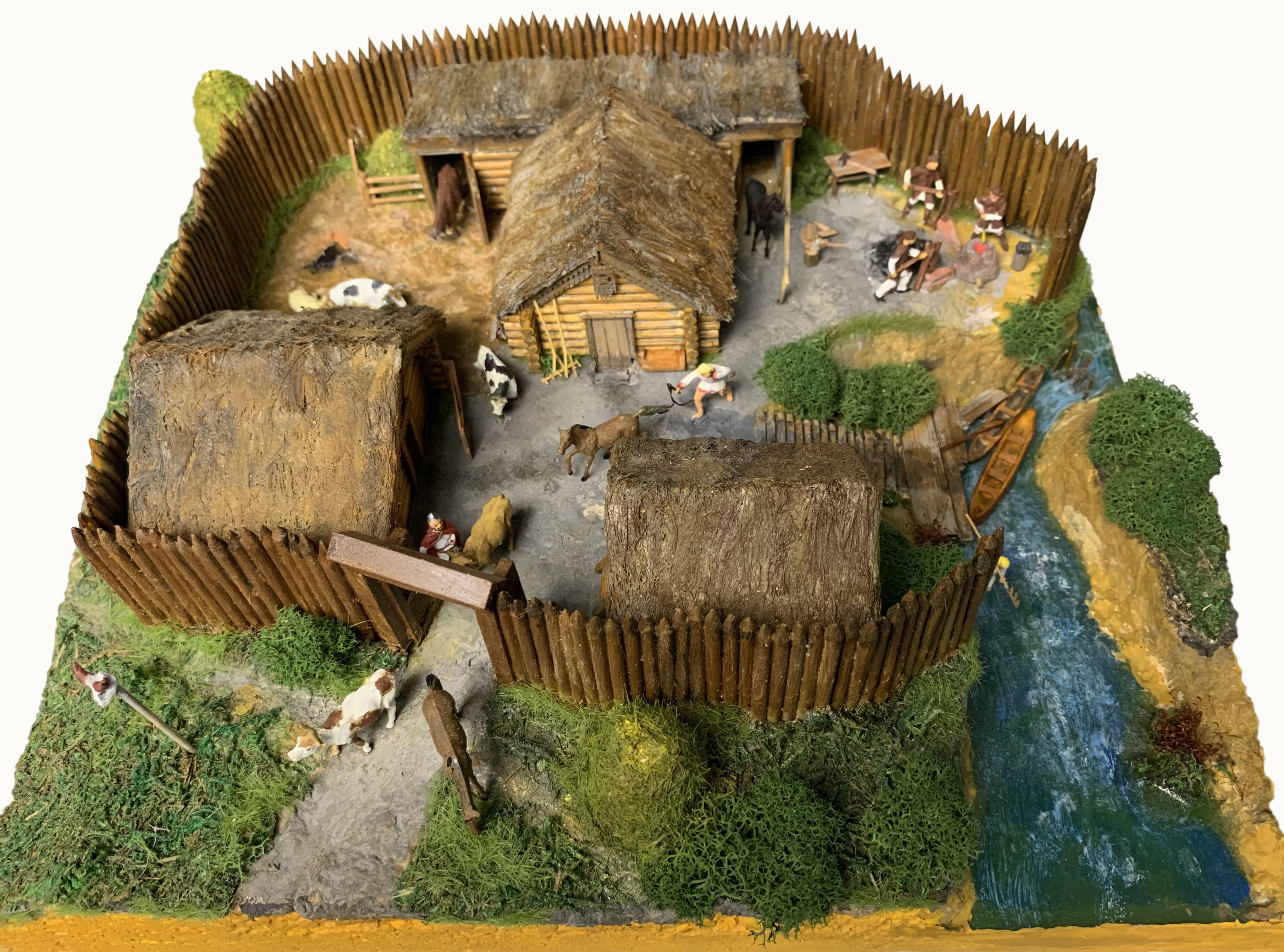 Когда я делал свои модели и макеты для кабинета истории 6-ой языковой гимназии города Пензы, то изначально выбор был за мной, поскольку все они готовились еще и для книги «История своими руками». Но встретил я как-то учителя истории А.В.Деревянко, кстати, когда-то ученицу из моего подшефного класса, а она мне и говорит: «Нужен макет славянского поселка. Древнего. Потому, как иллюстрация в учебнике плохая. И чтобы не очень большой он был, чтобы было удобно хранить в шкафу и передавать по классу на уроке!». Так вот и родился этот макет. Понятно, что в реальном поселке дома стояли на большем расстоянии друг от друга, но и не так, чтобы уж на очень большом потому, как тогда и забор должен быть много длиннее. Здесь поселок совсем маленький, наверное, были и такие, и расположен он на берегу реки. Так что ограда его даже не замкнута, да и зачем, ведь преградой к нему со стороны реки была сама река. Внутри две жилых полуземлянки, и амбар на стойках из бревен. Позади одного из домов конюшня и коровник, а рядом с ним скотский загон. На краю обрыва у реки стоит домница, и здесь же мастера куют крицу. К реке идет лестница из плах, русло ее перегорожено кольями, а у небольшого причала стоял лодки. Здесь же один из обитателей поселка бьет острогой рыбу. Возле землянки стоят грабли и прочий «инструмент». Пастух кнутом выгоняет лошадей и коров за ворота пастись, а рядом с ними стоит охранник с копьем. По-видимому, утро очень раннее, но работа в поселке уже идет. Фигурки – переделки набора с египтянами и средневековыми воинами. Коровы и кони – присланы Али-Экспрессом также, как и трава и прочая «зелень». Череп на столбе у ворот – обработка коровьей головы. Отделка жилищ – детали наборов АВ-модель. Крыши –чесанка для посадки водопроводных кранов. Ограда из палочек для шашлычков. Весь макет окрашен акриловыми красками. Теперь школьники 6-7 класса могут себе наглядно представить, как жили наши далекие-далекие предки.
