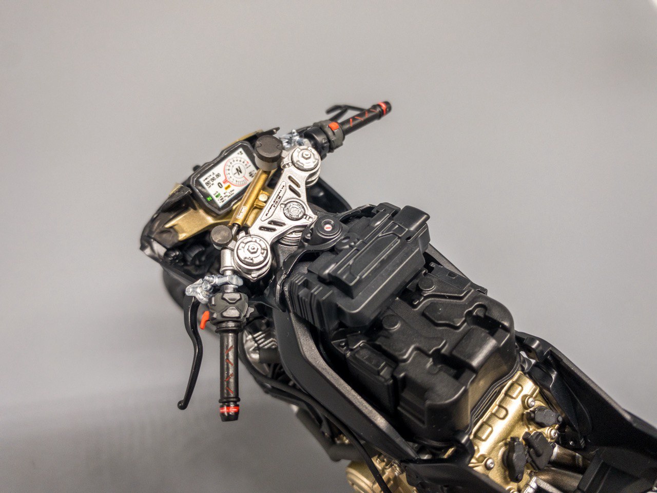 Впечатления от постройки модели - очень положительные. Мотоциклы 1/12 - это оказывается так интересно :) Модель большая получается, красивая, необычно очень ощущается на фоне более привычных масштабов :) Особенно конечно современная Tamiya в этом плане это просто сплошное удовольствие без утяжин, следов толкателей, щелей, короче говоря, реально очень легкая прогулка получилось. Сама версия модели - с гоночным комплектом, т.е. с "сухим" сцеплением, Акраповичем титановым, с убранными поворотниками и лопатой под номер.