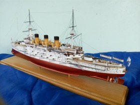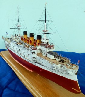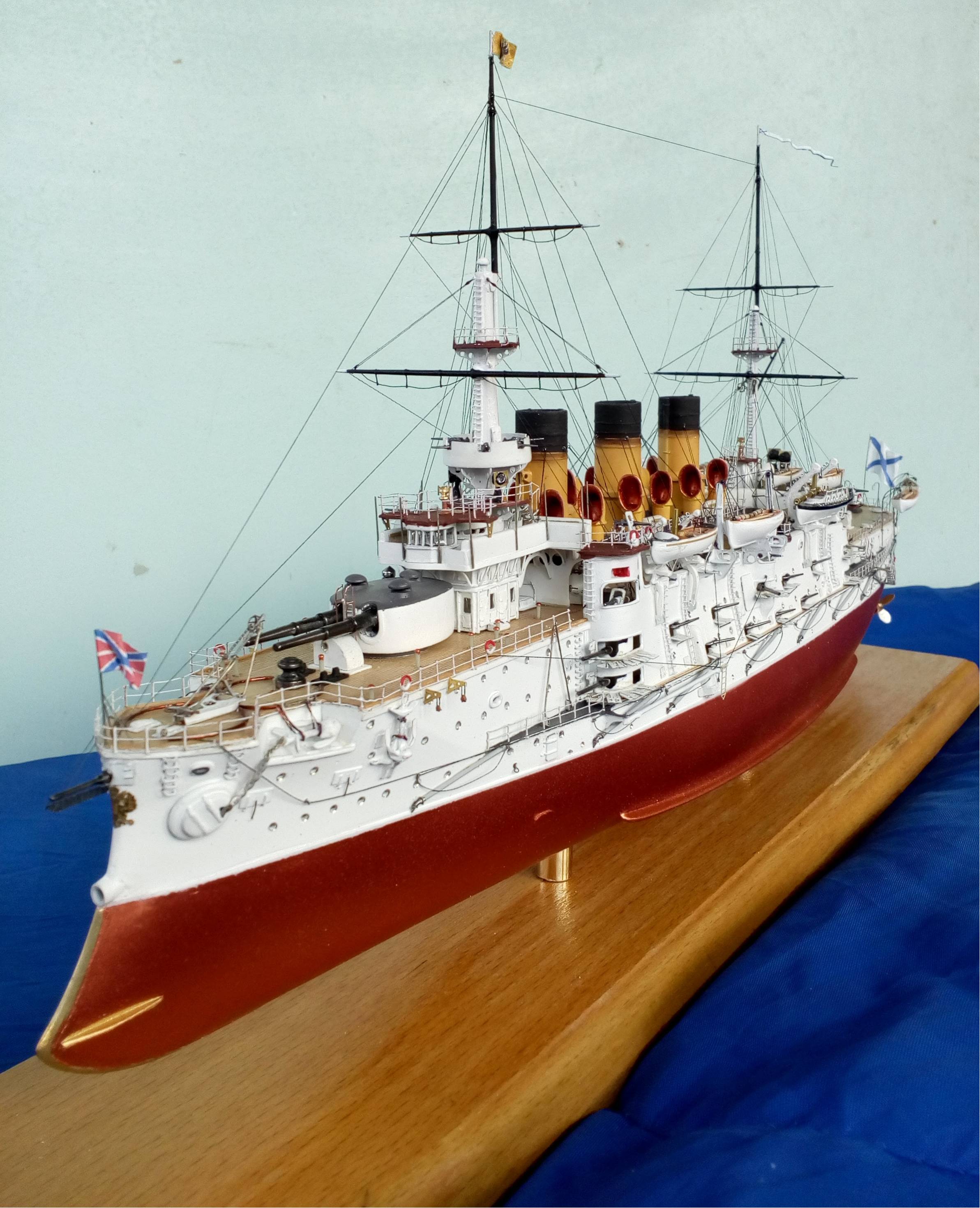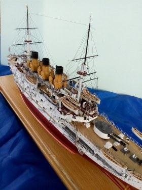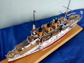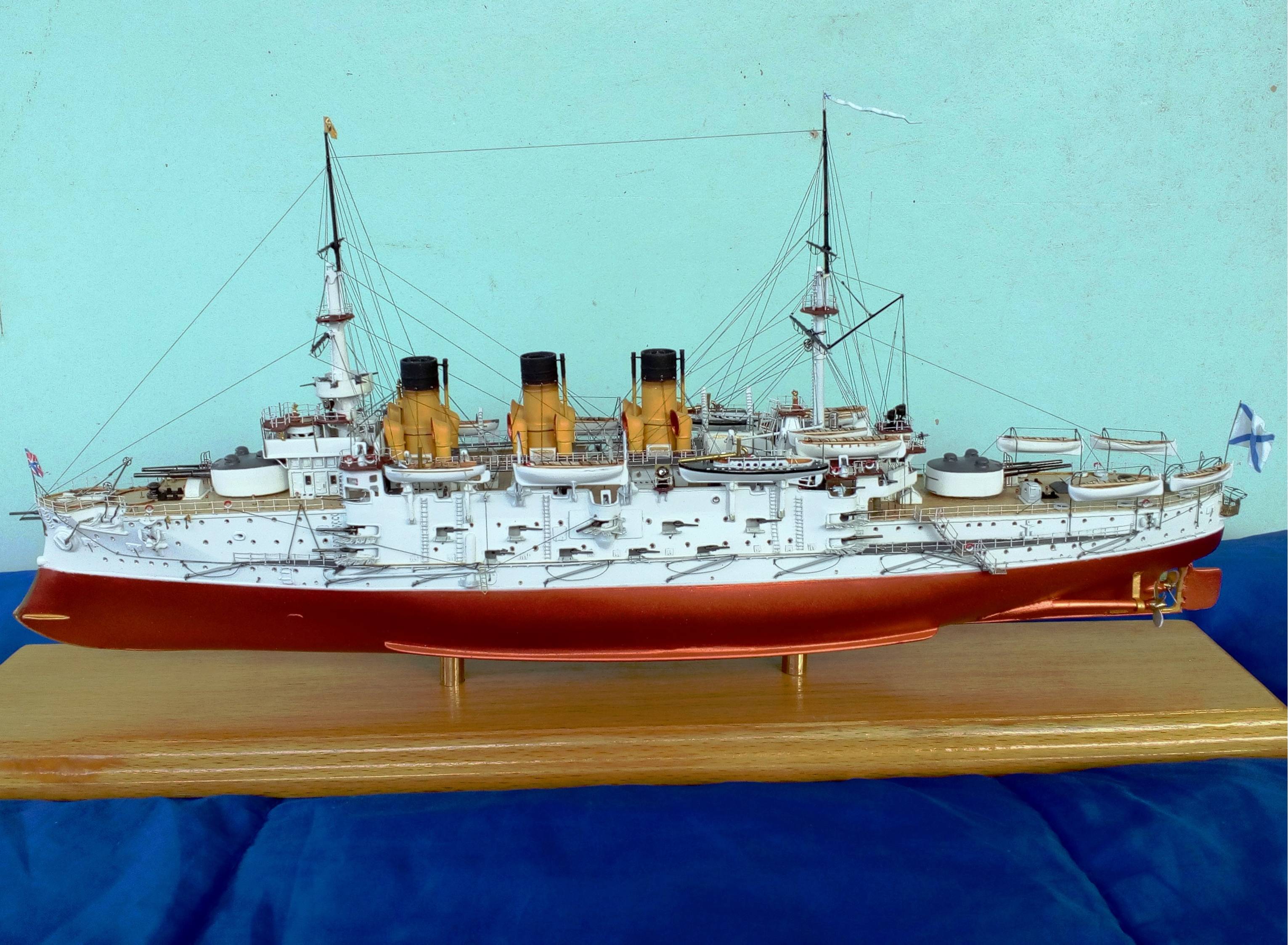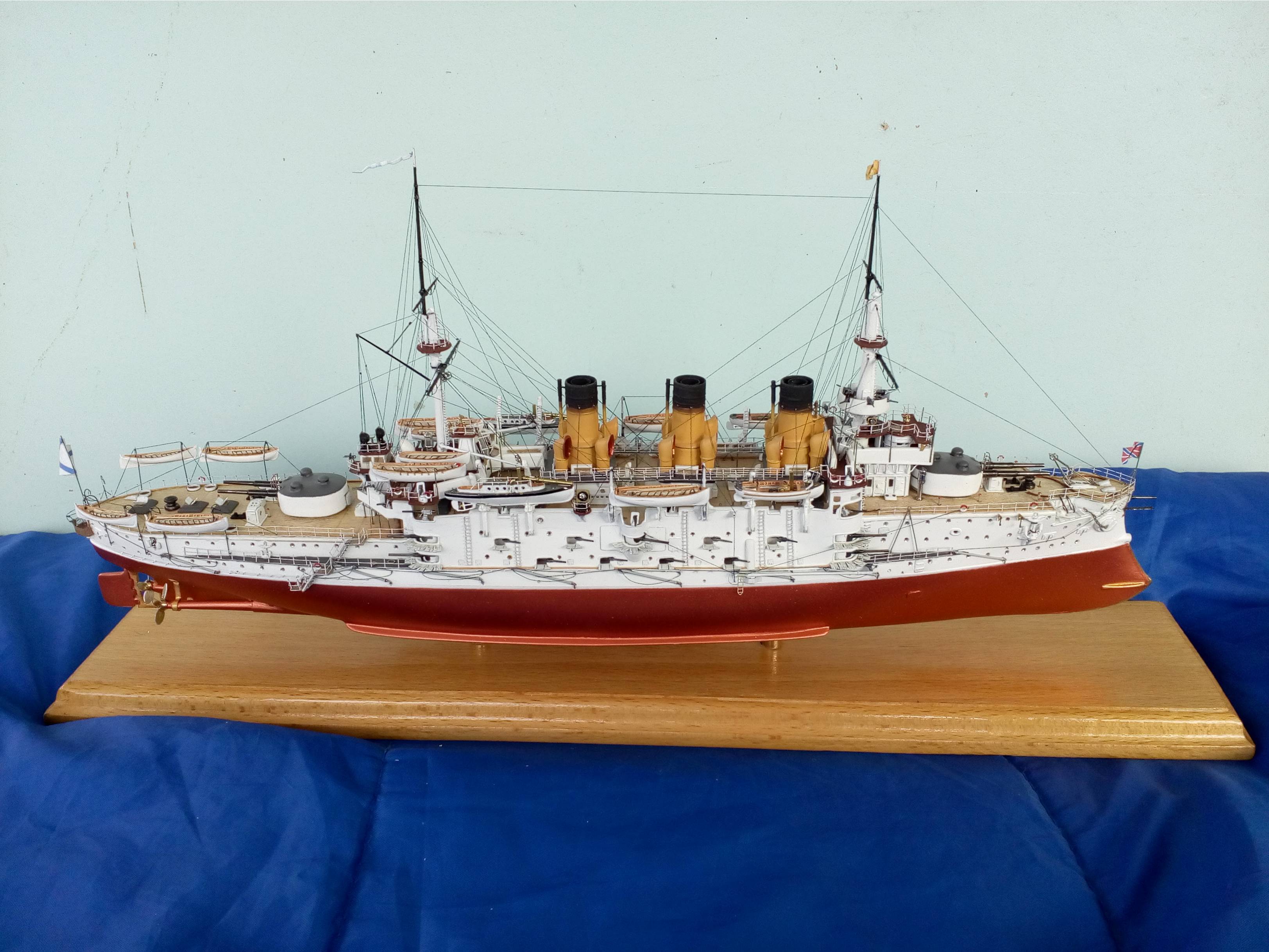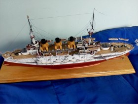 О модели, то технологии все мои старые из 80-х. Корпус -деревянный, палуба из березовой 1мм фанеры, расчерченной иголкой. Все остальное сделано из жалюзей,проволоки и пластмассы от старого холодильника. Окрашено художественной акриловой краской. Приятного просмотра.