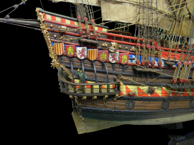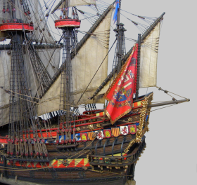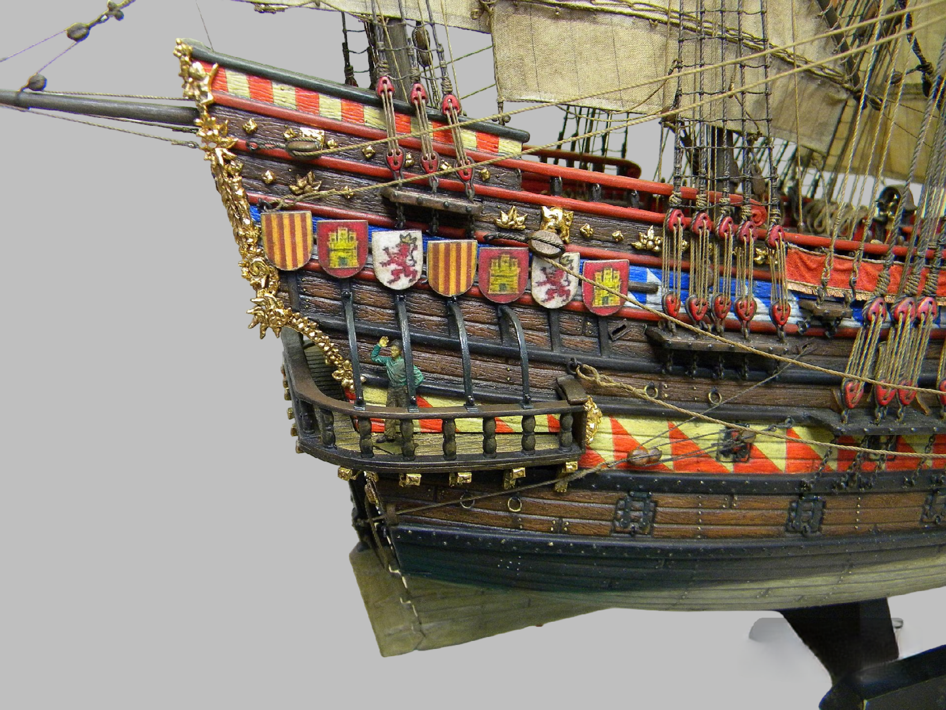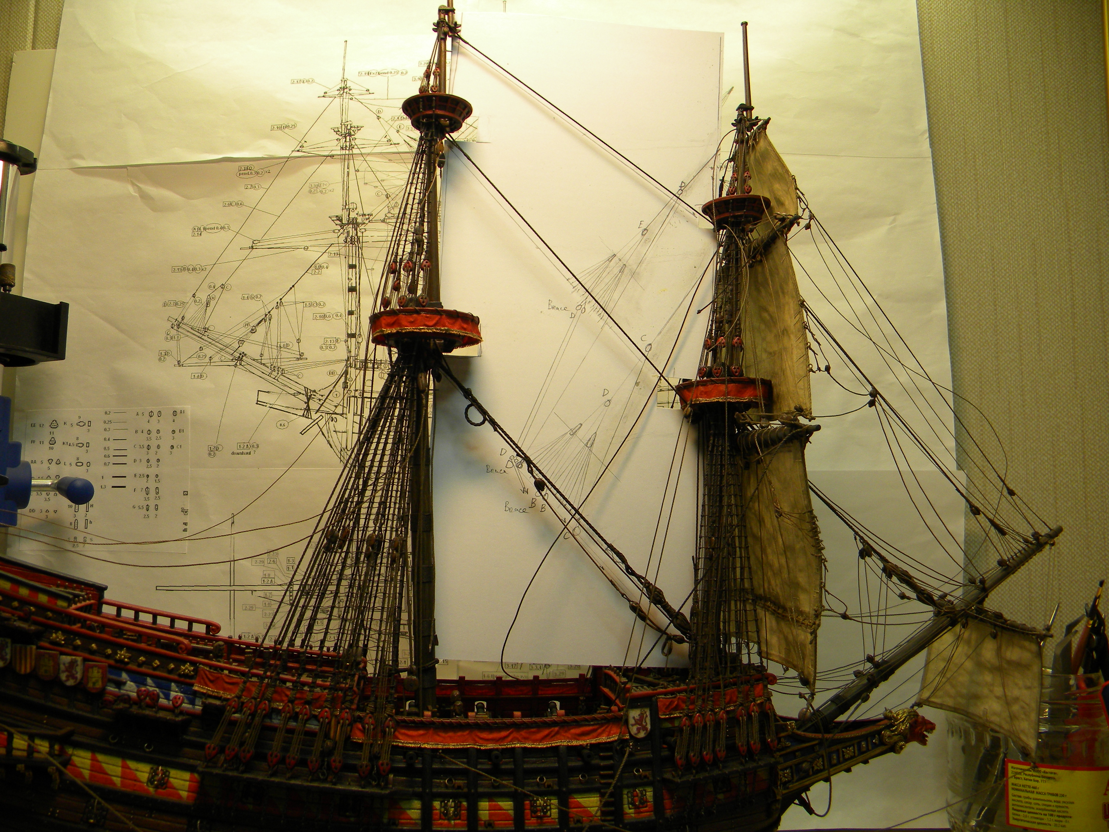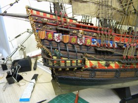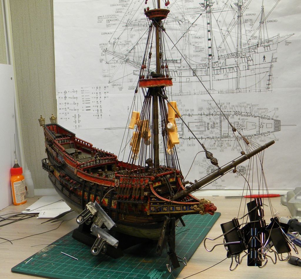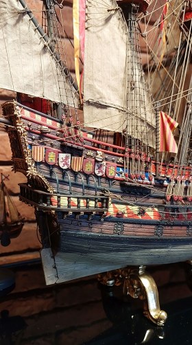 Этот пластиковый набор - от китайского производителя Lee 1:100, оригинал был, если не ошибаюсь , японский Aoshima, эту же модель на нашем рынке сейчас выпускает Моделист, а прототипом для этого пластикового набора послужила реконструкция "испанского галеона 1607" известного в прошлом моделиста Винченцо Лусци, это его реконструкция испанского галеона 1607 , как он его назвал, еще 60 х годов прошлого века... реконструкция в некоторых моментах довольно спорная, и по корпусу много несуразностей и ошибок , да и по рангоуту с такелажем, но я не ставил целью затевать какие то глобальные перепилы, просто собрал что было в наборе, добавил немного декора и попытался сделать более сложный такелаж чем предполагал набор.