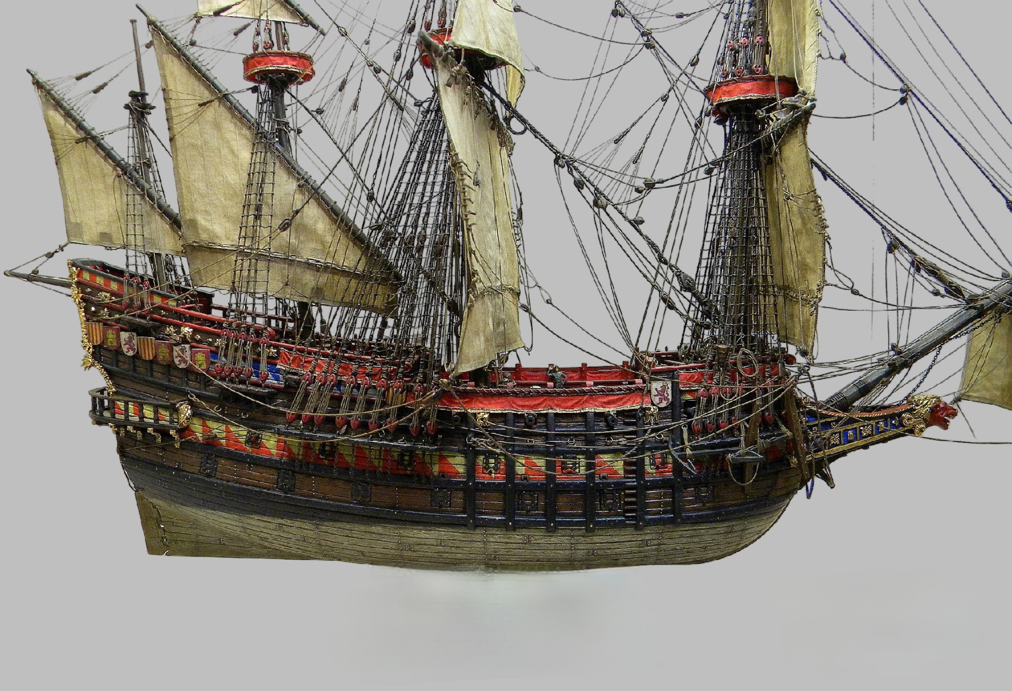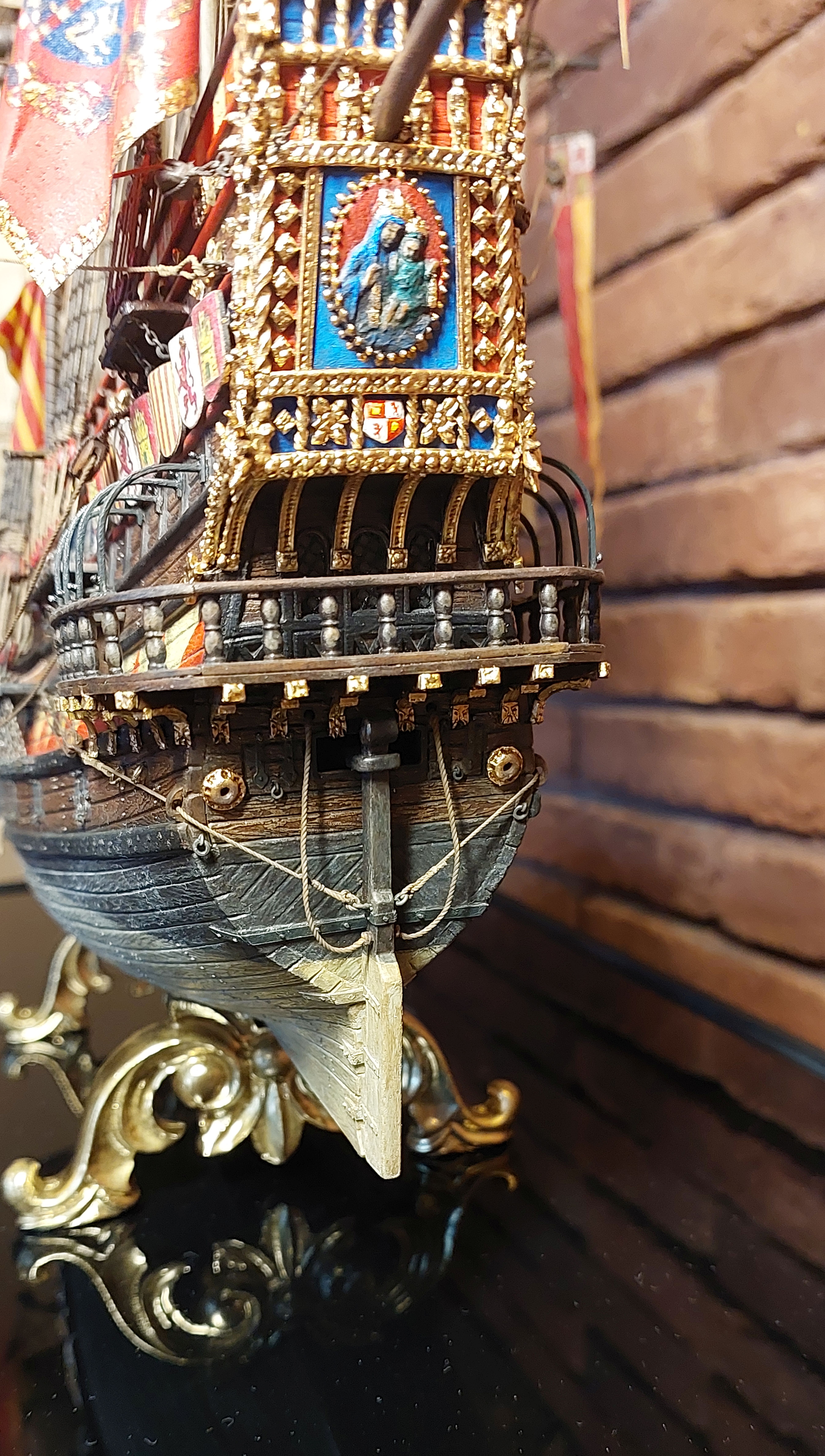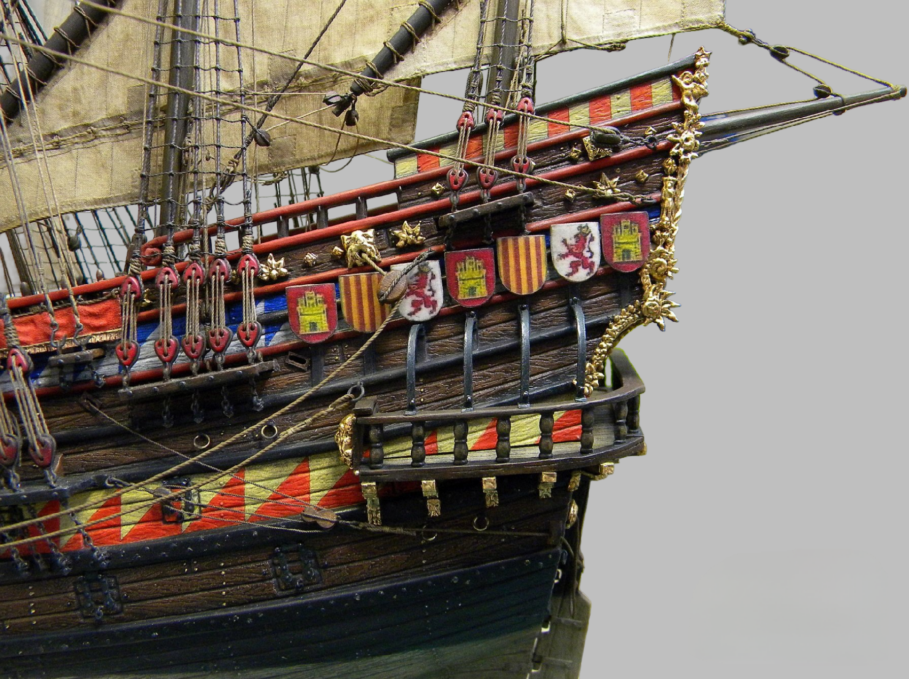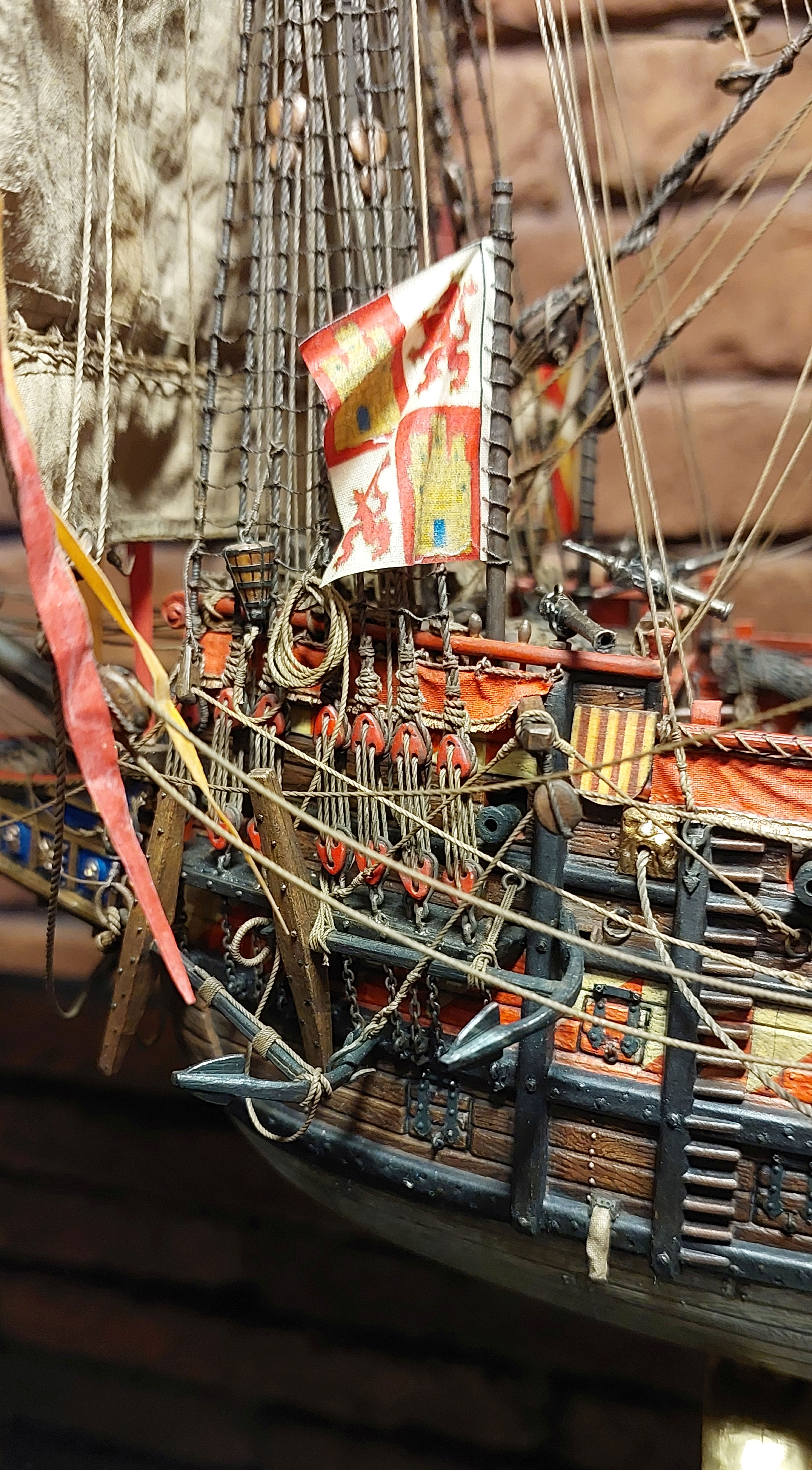 Этот пластиковый набор - от китайского производителя Lee 1:100, оригинал был, если не ошибаюсь , японский Aoshima, эту же модель на нашем рынке сейчас выпускает Моделист, а прототипом для этого пластикового набора послужила реконструкция "испанского галеона 1607" известного в прошлом моделиста Винченцо Лусци, это его реконструкция испанского галеона 1607 , как он его назвал, еще 60 х годов прошлого века... реконструкция в некоторых моментах довольно спорная, и по корпусу много несуразностей и ошибок , да и по рангоуту с такелажем, но я не ставил целью затевать какие то глобальные перепилы, просто собрал что было в наборе, добавил немного декора и попытался сделать более сложный такелаж чем предполагал набор.