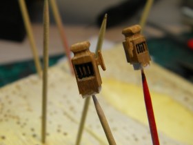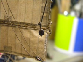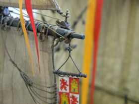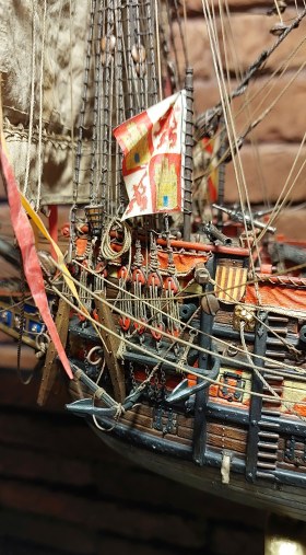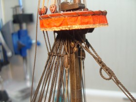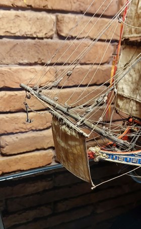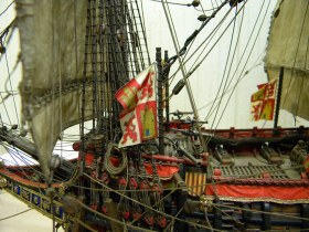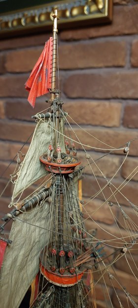 Вымпелы сделать элементарно,но не стоит. И это бы не украсило модель. Корабль изображён в безветрие,обвисли флаги,паруса и,соответственно,вымпелы и это смотрится органично.