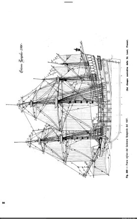 В дальнейшем галеон становится основой флотов испанцев и англичан. Форштевень, сильно изогнутый и вытянутый вперёд, имел украшения и по форме напоминал таковой у галер. Длинный бушприт нёс парус — блинд. Носовая надстройка была отодвинута назад и не нависала над форштевнем, как у каракки. Кормовая надстройка, высокая и узкая, размещалась на срезанной корме. Надстройка имела несколько ярусов, в которых размещались жилые помещения офицеров и пассажиров. У сильно наклонённого ахтерштевня был транец выше грузовой ватерлинии. Корма украшалась резьбой и балконами...."