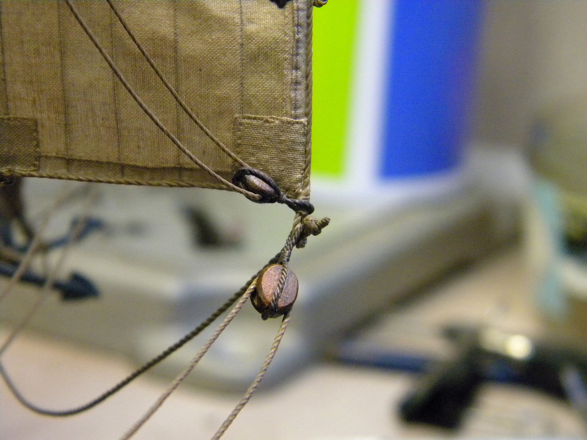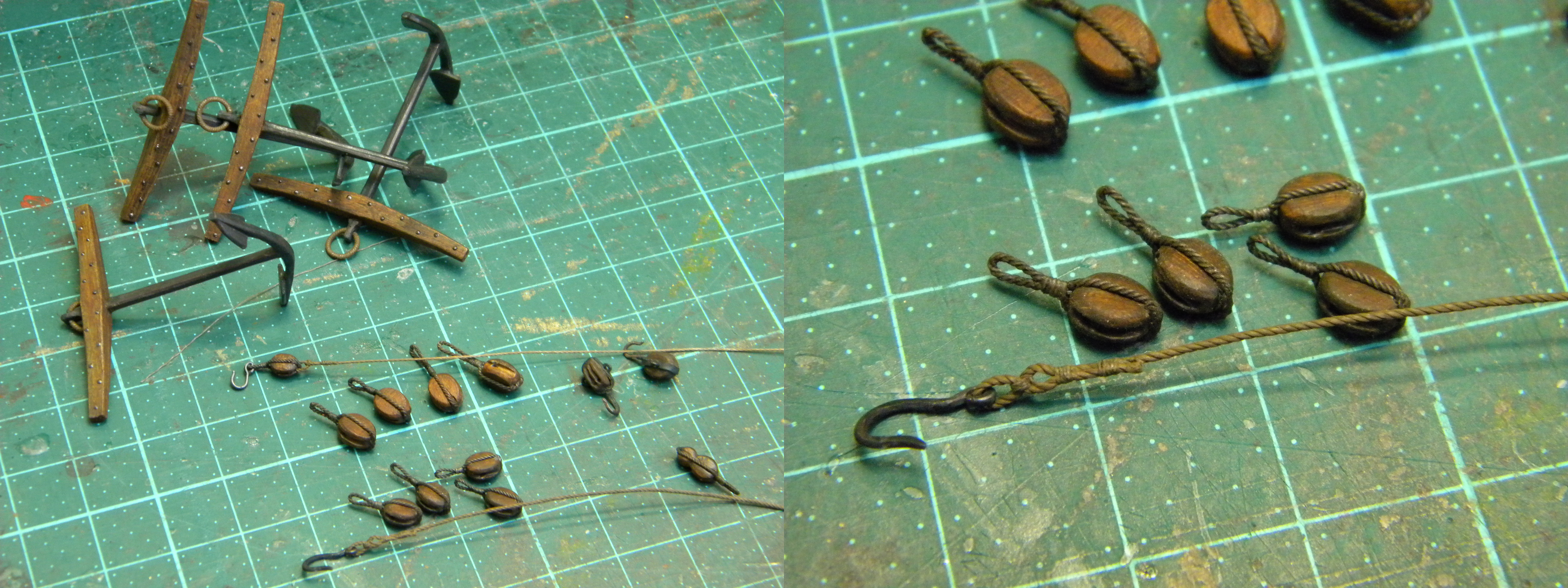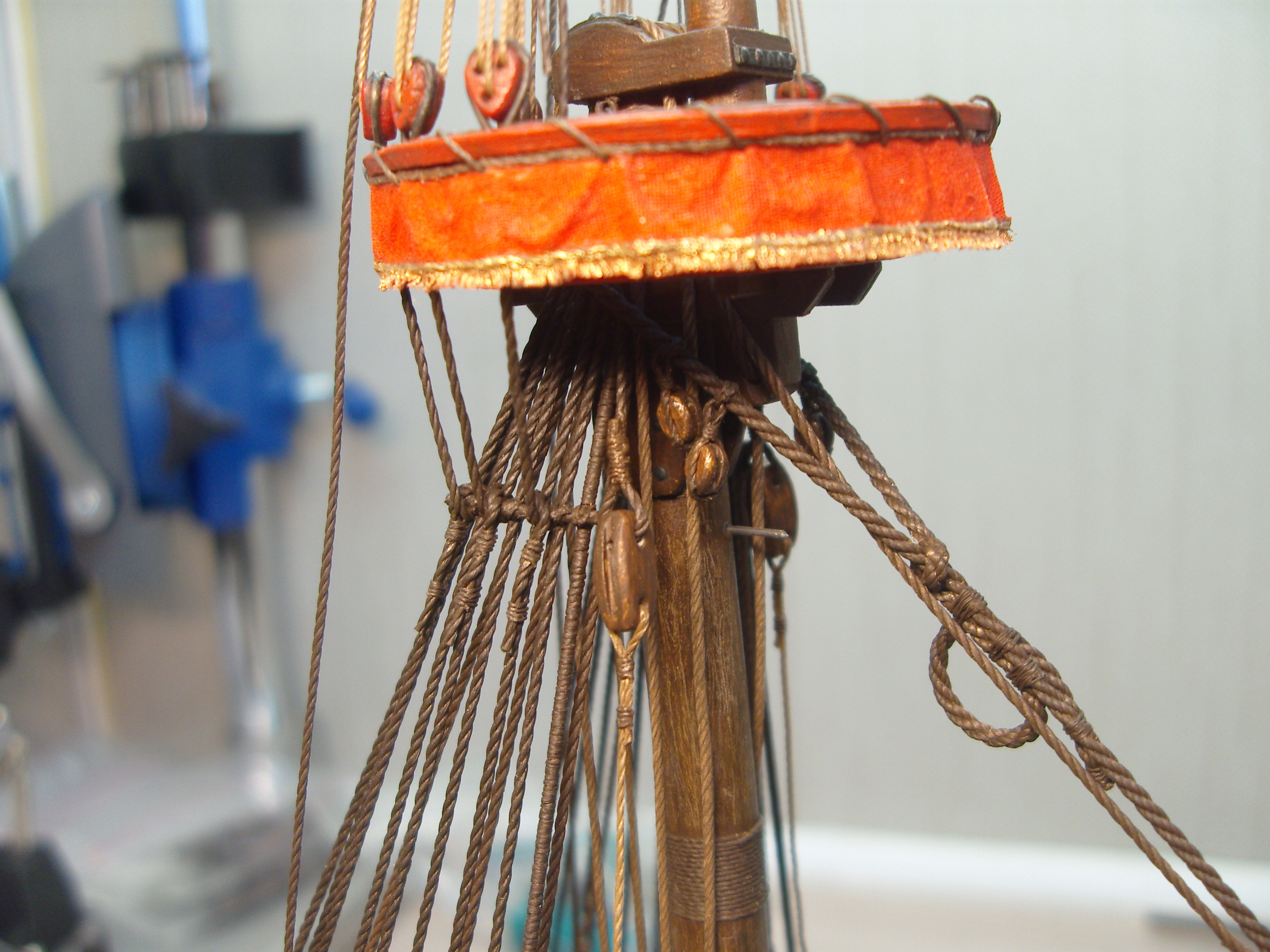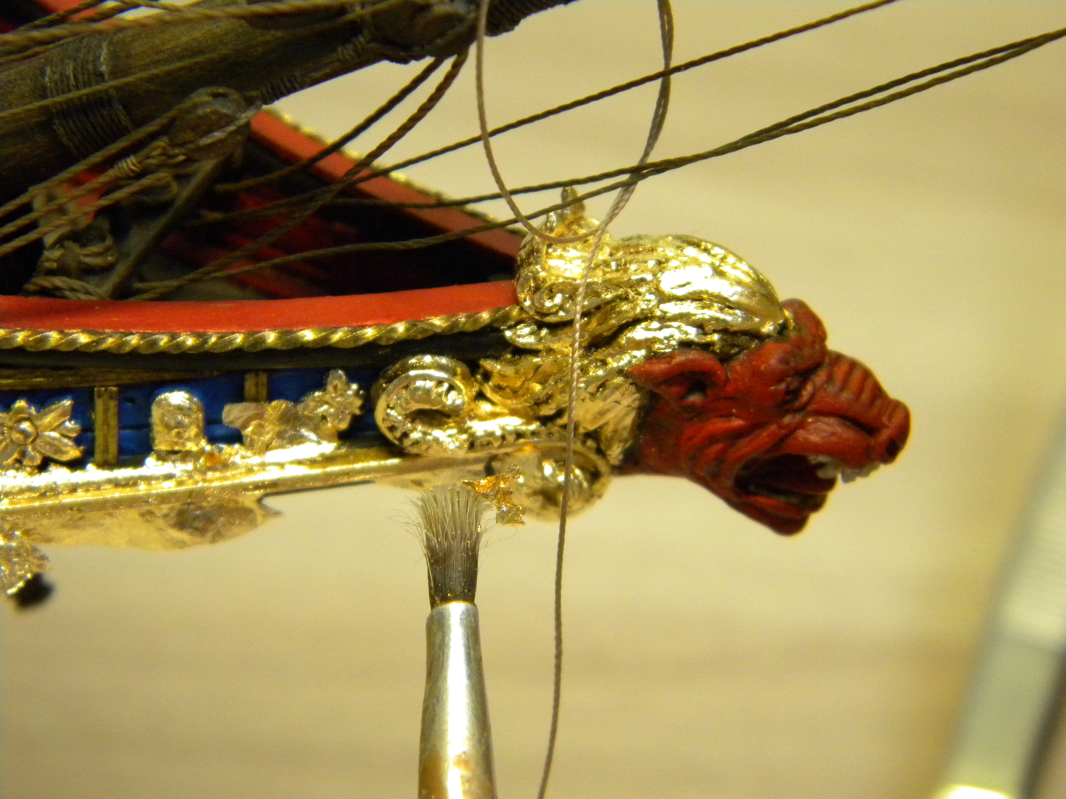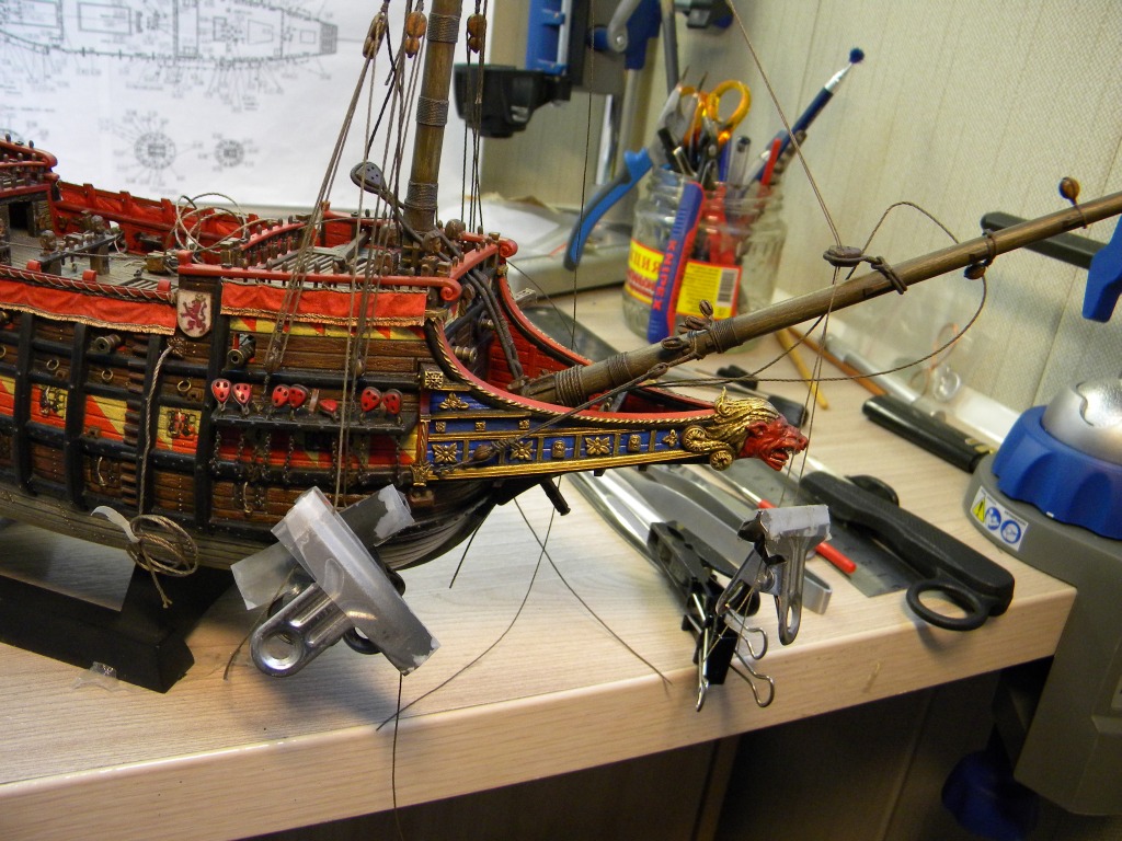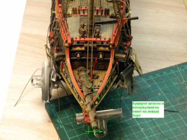 Единственный деревянный элемент здесь - бушприт из кисточки... родной пластиковый коротковат оказался и слишком гибкий что б удержать нагрузку 3х фор штагов... но все равно пришлось ставить оттяжку с правого борта что бы удержать его в позиции... как раньше обходились с мин.такелажа у бушприта на галеонах , для меня загадка... сравнивая с развитым такелажем бушприта 18 го века и далее...
