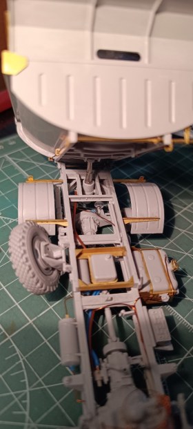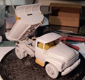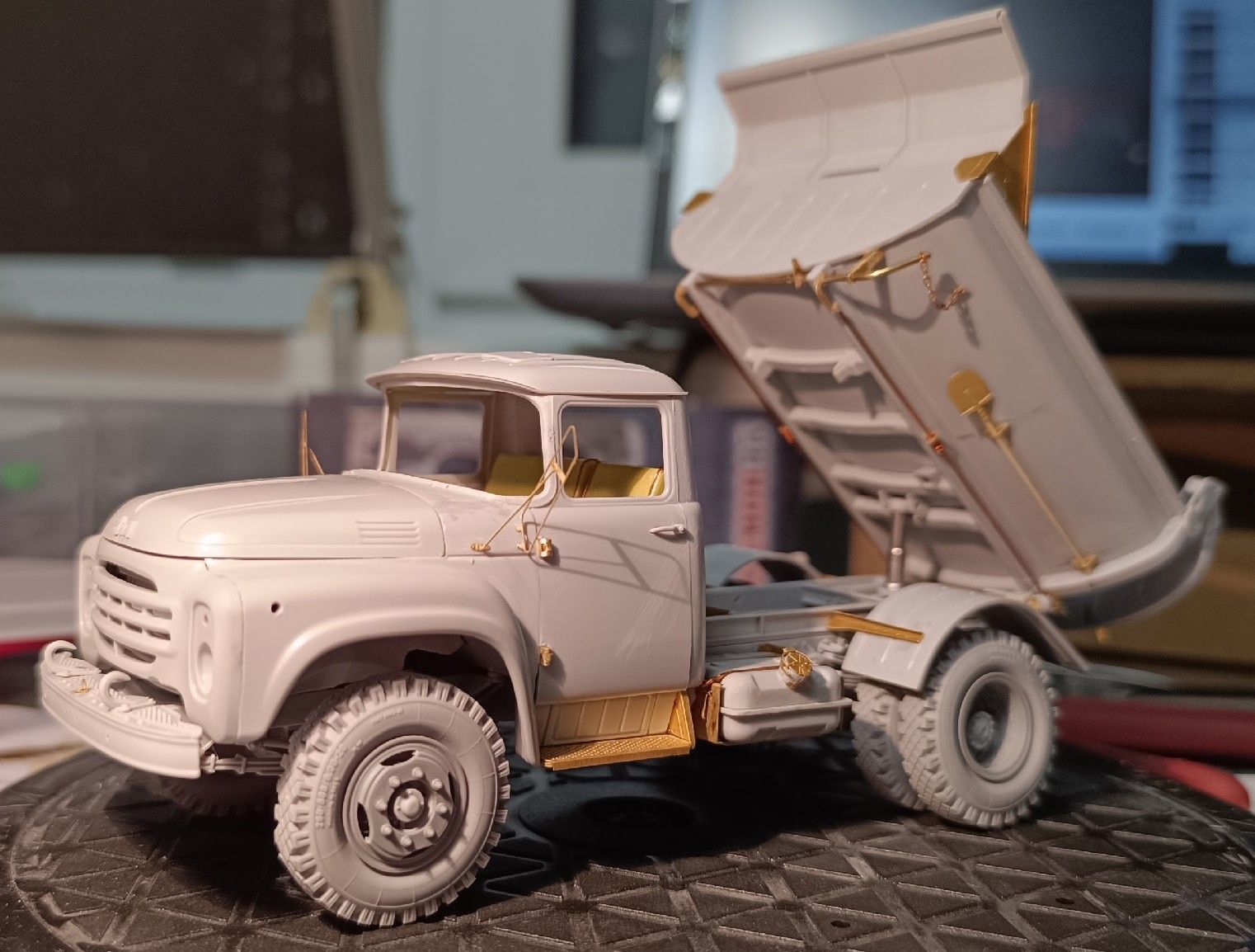 Невозможно было пройти мимо такого самосвала. Отличный набор. Добавил к нему фототравление Микродизайн и колеса Armor35. С колесами пришлось повозиться, тк они не предназначались для этого набора. Добавил трубки и шланги пневмо-, гидро-, электро- и топливной систем. Сначала хотел и двигатель доработать, но там увяз. Решил его просто спрятать.