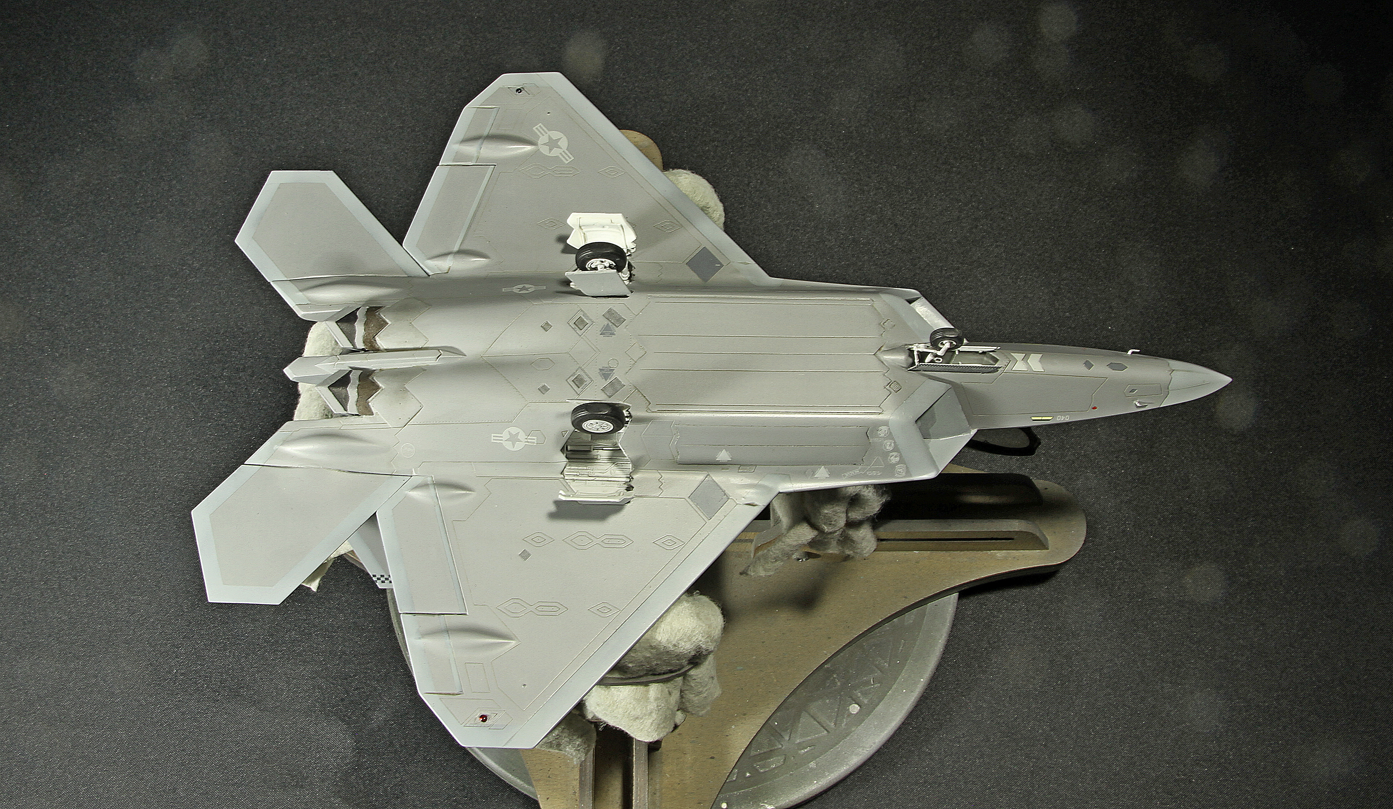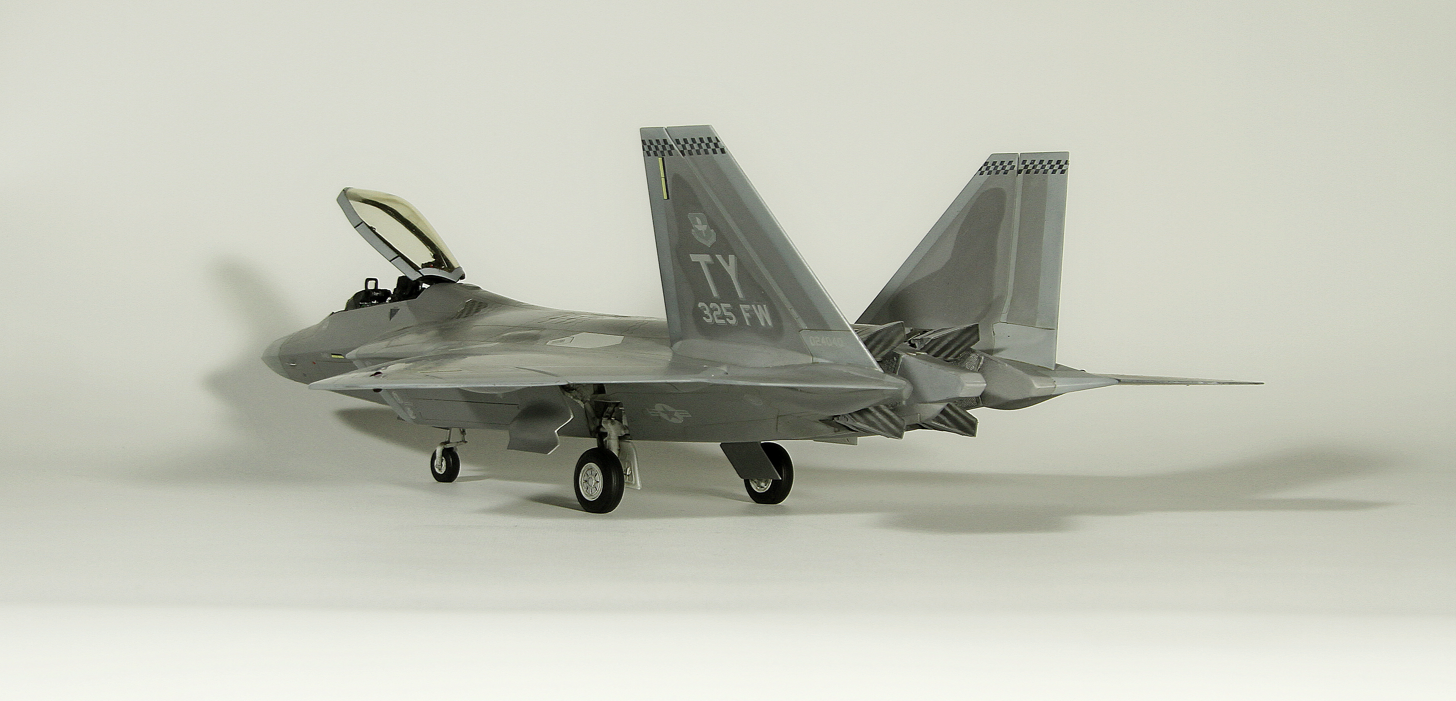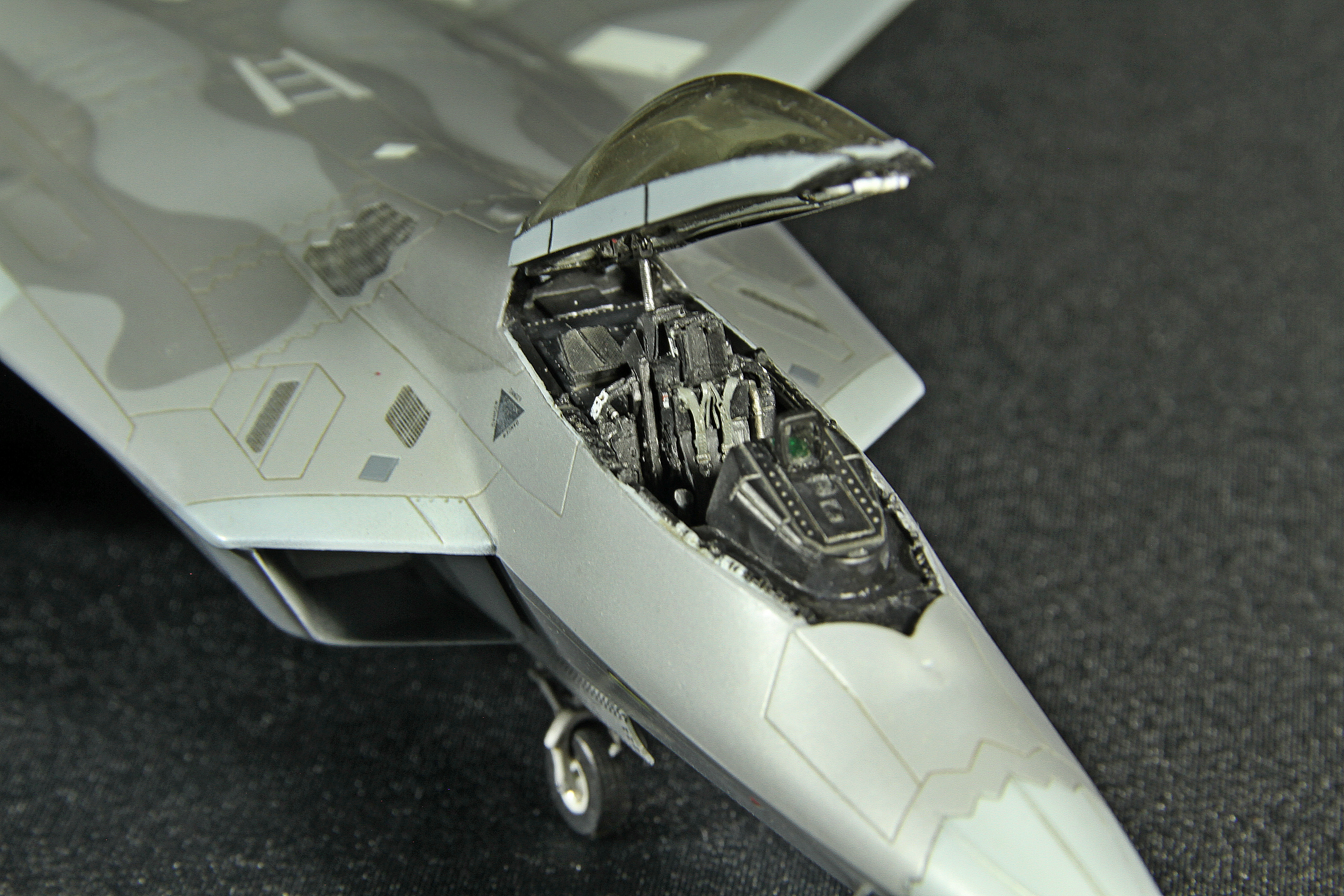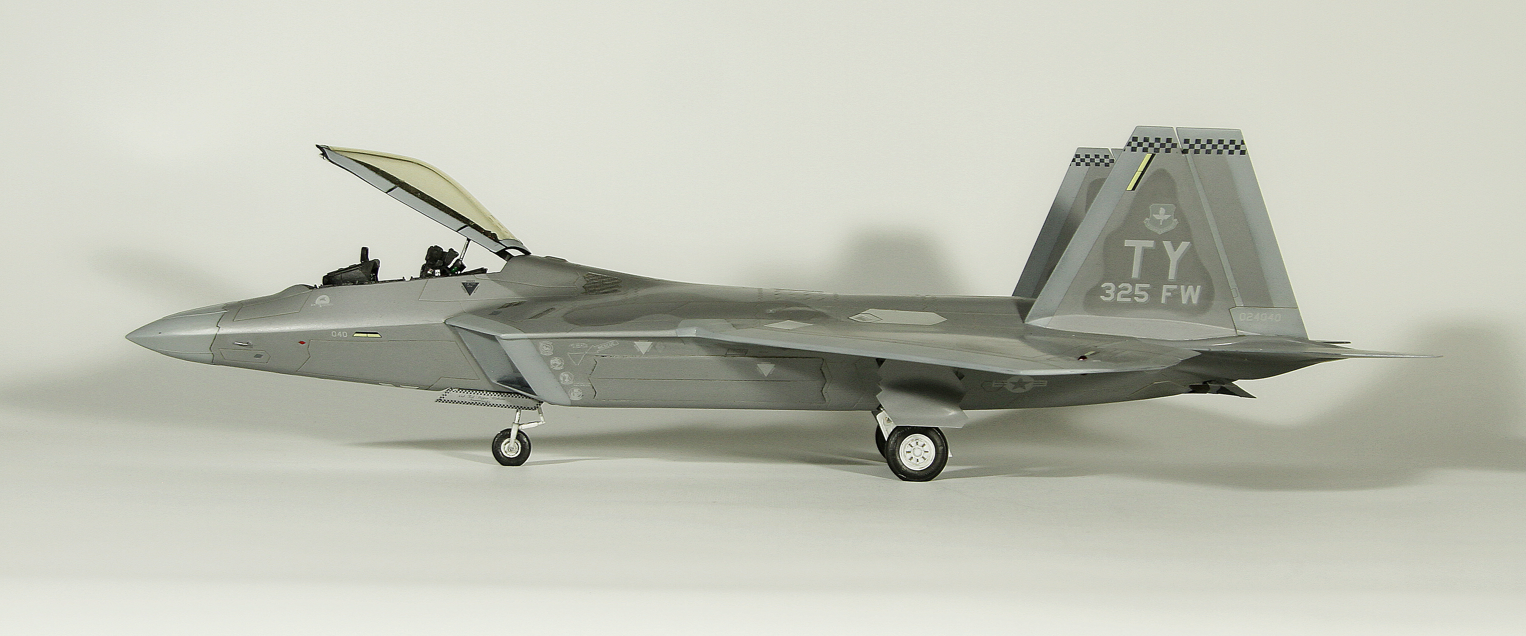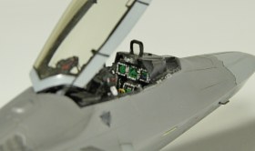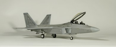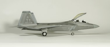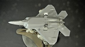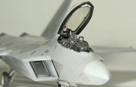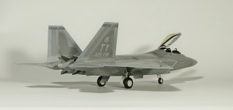 Итак, F-22A от Academy. Буду краток. Модель, в общем, приятная в сборке. Пластик хороший, есть неточности, а куда без них? Но сборка особых проблем не доставила, за исключением вживления смоляных двигателей Aires. Тут пришлось немного попотеть, хотя заявлены они именно для академовского изделия. Со смоляным кокпитом от этого же производителя проблем было поменьше. У китового фонаря пришлось срезать слишком тонкую юбку, потому что если этого не делать, то при покраске более широкой юбки она была бы выпуклая, а этого на Рапторе нет. К тому же аиресовская внутренняя рамка фонаря нуждается в сокрытии следов склейки, что прямо укладывается в концепцию более широкой юбки фонаря. Тому, кто будет делать эту модель с допами, следует знать, что ИЛС от Аиреса не подойдет. Он переразмерен примерно в два раза, поэтому был оставлен стоковый. Еще одно дополнение-это колеса от Reskit. И последнее-это декаль Two Bobs Accurate Colorful для варианта Tyndall AFB июль 2006г. Декаль очень тонкая и очень классная, но требует большой осторожности, потому что из-за своей тонкой душевной организации имеет склонность к сморщиванию и скручиванию, но тут я, вроде, справился. Кстати стоковые декали тоже очень хороши. Самое интересное, конечно, покраска. Ведь надо было как-то показать тот самый металлический блеск. Путем смешивания в разных пропорциях алюминиевой и базовых цветов, что-то показать все же удалось. Хотя лаки, как и положено, сделали свое дело. Блеск сильно поубавился. На фото, вы, скорее всего, этого блеска не увидите, но стоит поместить модель под лампу, как все становится на свои места. Сильно пачкать модель я не стал.