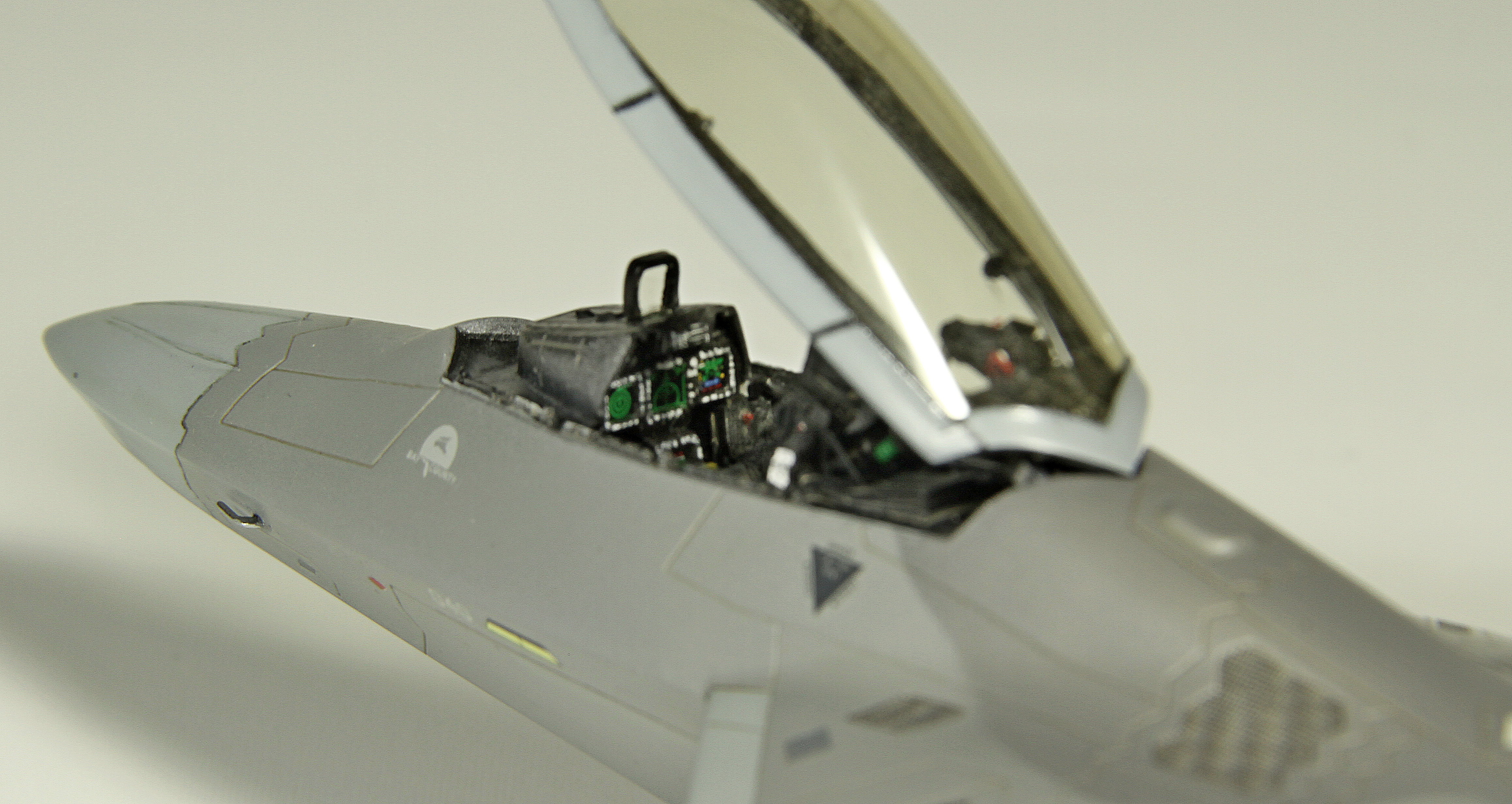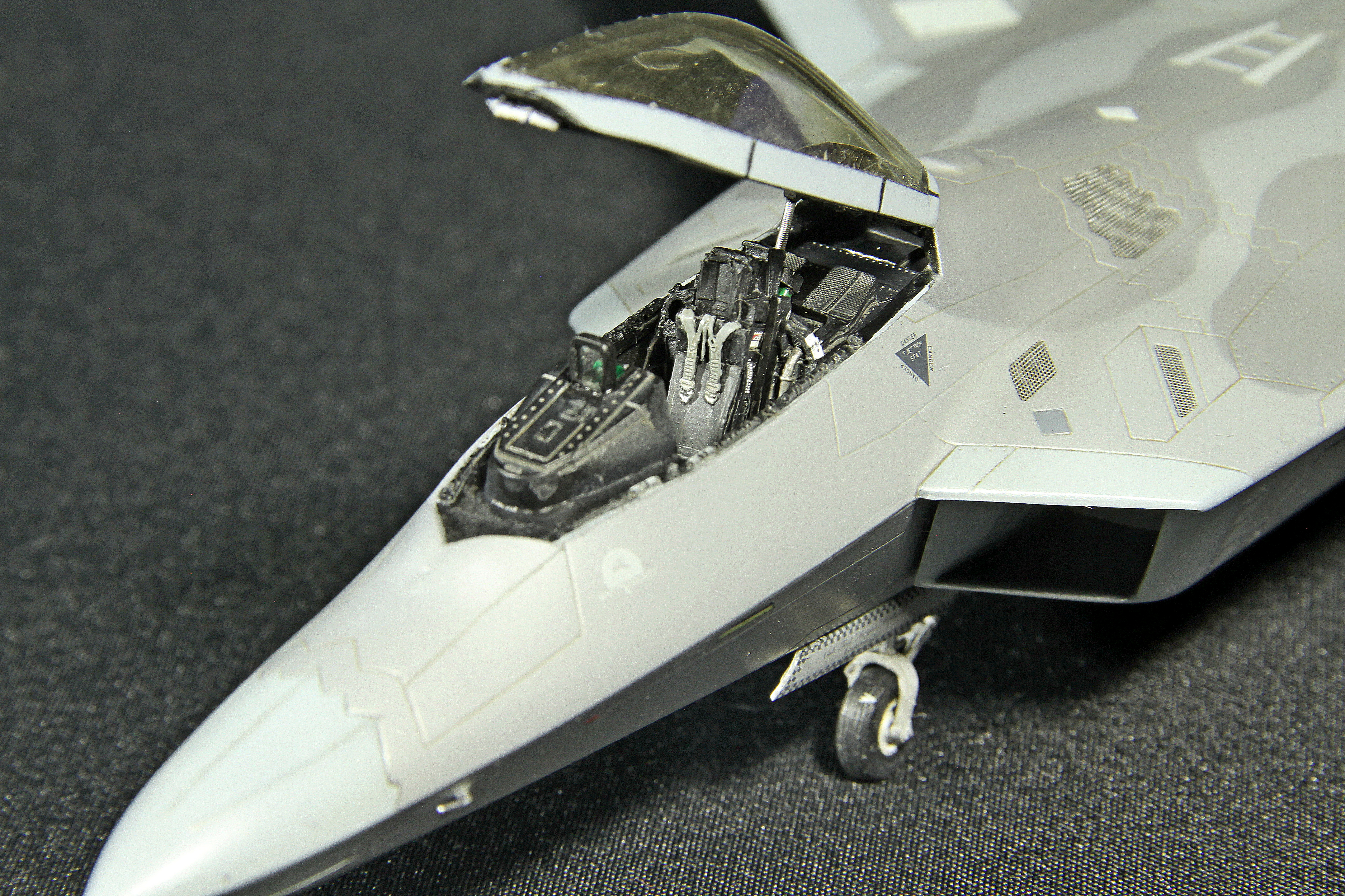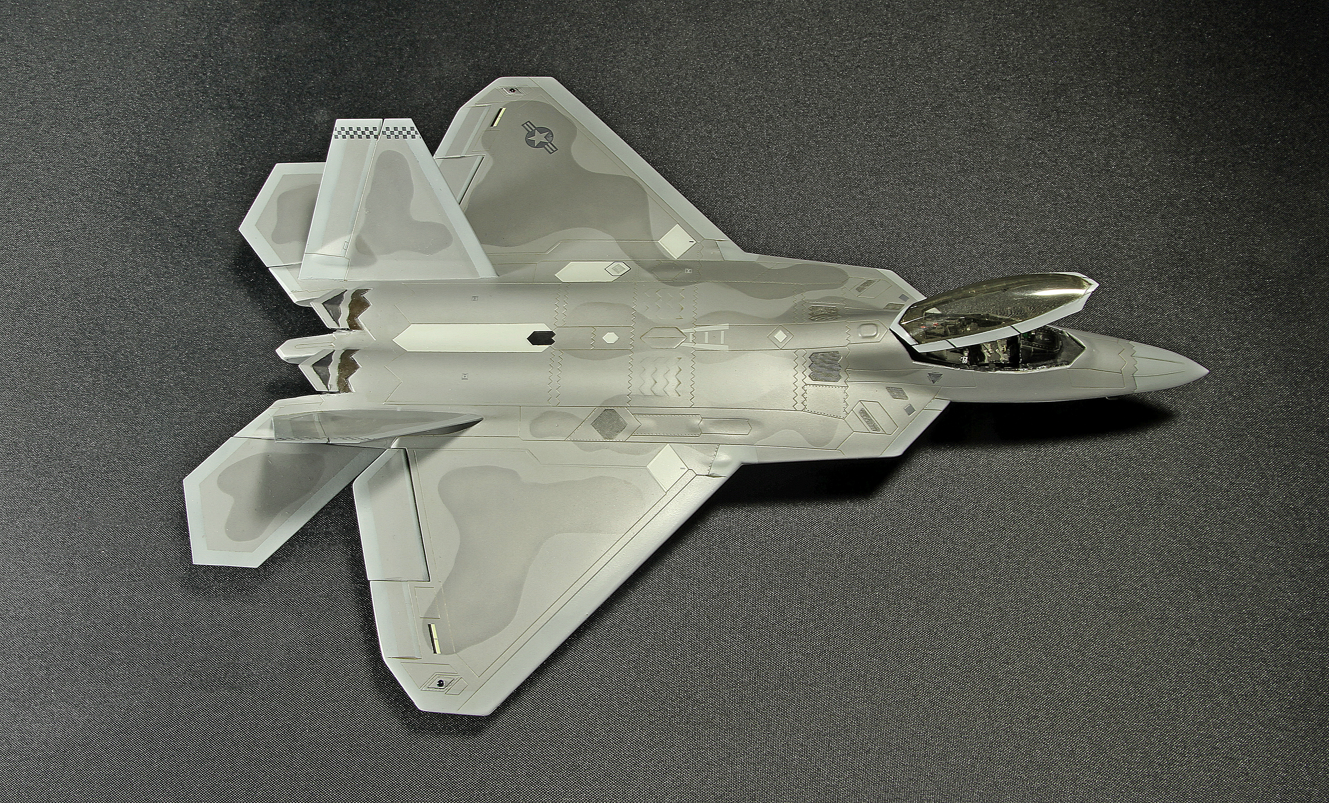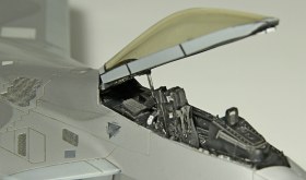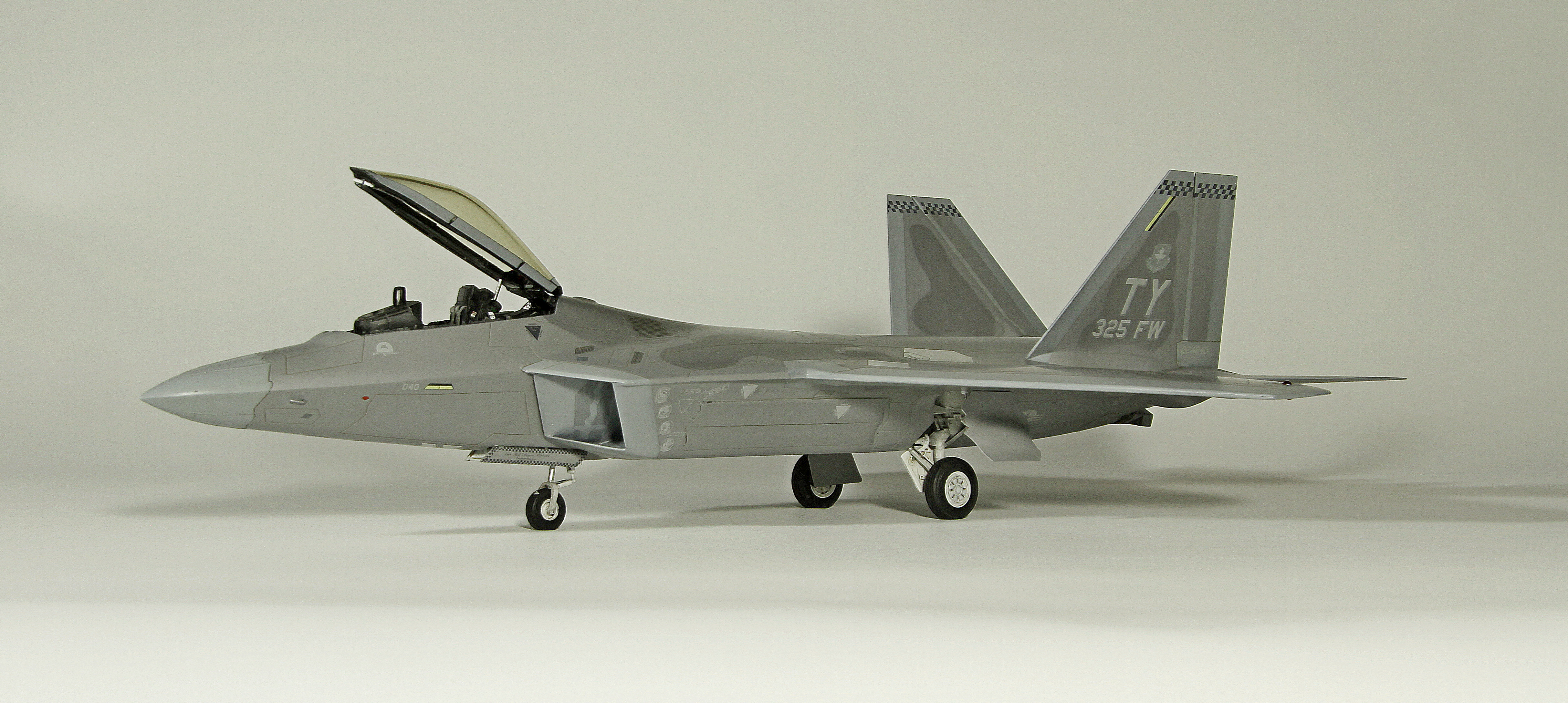 Итак, F-22A от Academy. Буду краток. Модель, в общем, приятная в сборке. Пластик хороший, есть неточности, а куда без них? Но сборка особых проблем не доставила, за исключением вживления смоляных двигателей Aires. Тут пришлось немного попотеть, хотя заявлены они именно для академовского изделия. Со смоляным кокпитом от этого же производителя проблем было поменьше. У китового фонаря пришлось срезать слишком тонкую юбку, потому что если этого не делать, то при покраске более широкой юбки она была бы выпуклая, а этого на Рапторе нет. К тому же аиресовская внутренняя рамка фонаря нуждается в сокрытии следов склейки, что прямо укладывается в концепцию более широкой юбки фонаря. Тому, кто будет делать эту модель с допами, следует знать, что ИЛС от Аиреса не подойдет. Он переразмерен примерно в два раза, поэтому был оставлен стоковый. Еще одно дополнение-это колеса от Reskit. И последнее-это декаль Two Bobs Accurate Colorful для варианта Tyndall AFB июль 2006г. Декаль очень тонкая и очень классная, но требует большой осторожности, потому что из-за своей тонкой душевной организации имеет склонность к сморщиванию и скручиванию, но тут я, вроде, справился. Кстати стоковые декали тоже очень хороши. Самое интересное, конечно, покраска. Ведь надо было как-то показать тот самый металлический блеск. Путем смешивания в разных пропорциях алюминиевой и базовых цветов, что-то показать все же удалось. Хотя лаки, как и положено, сделали свое дело. Блеск сильно поубавился. На фото, вы, скорее всего, этого блеска не увидите, но стоит поместить модель под лампу, как все становится на свои места. Сильно пачкать модель я не стал.