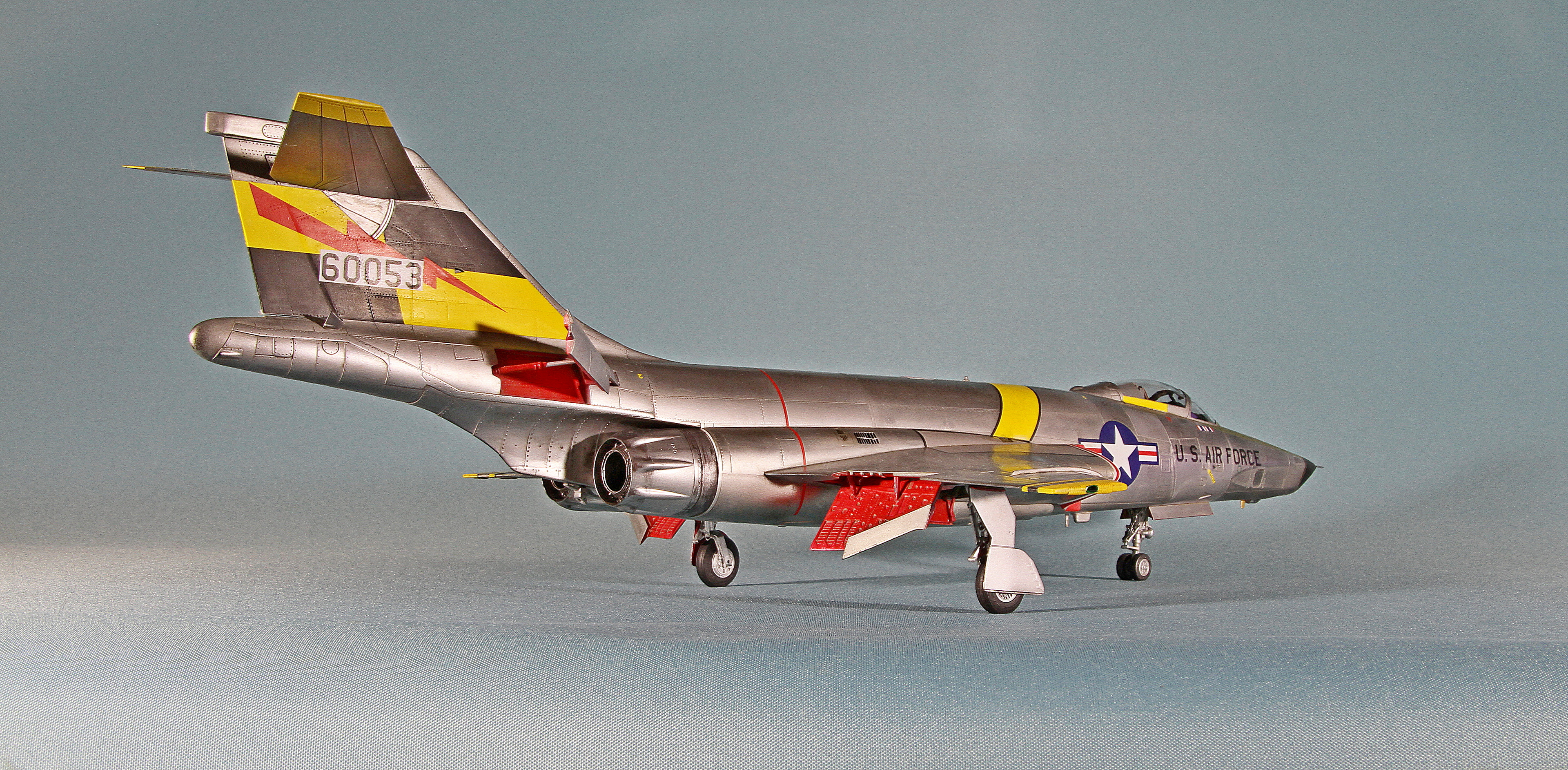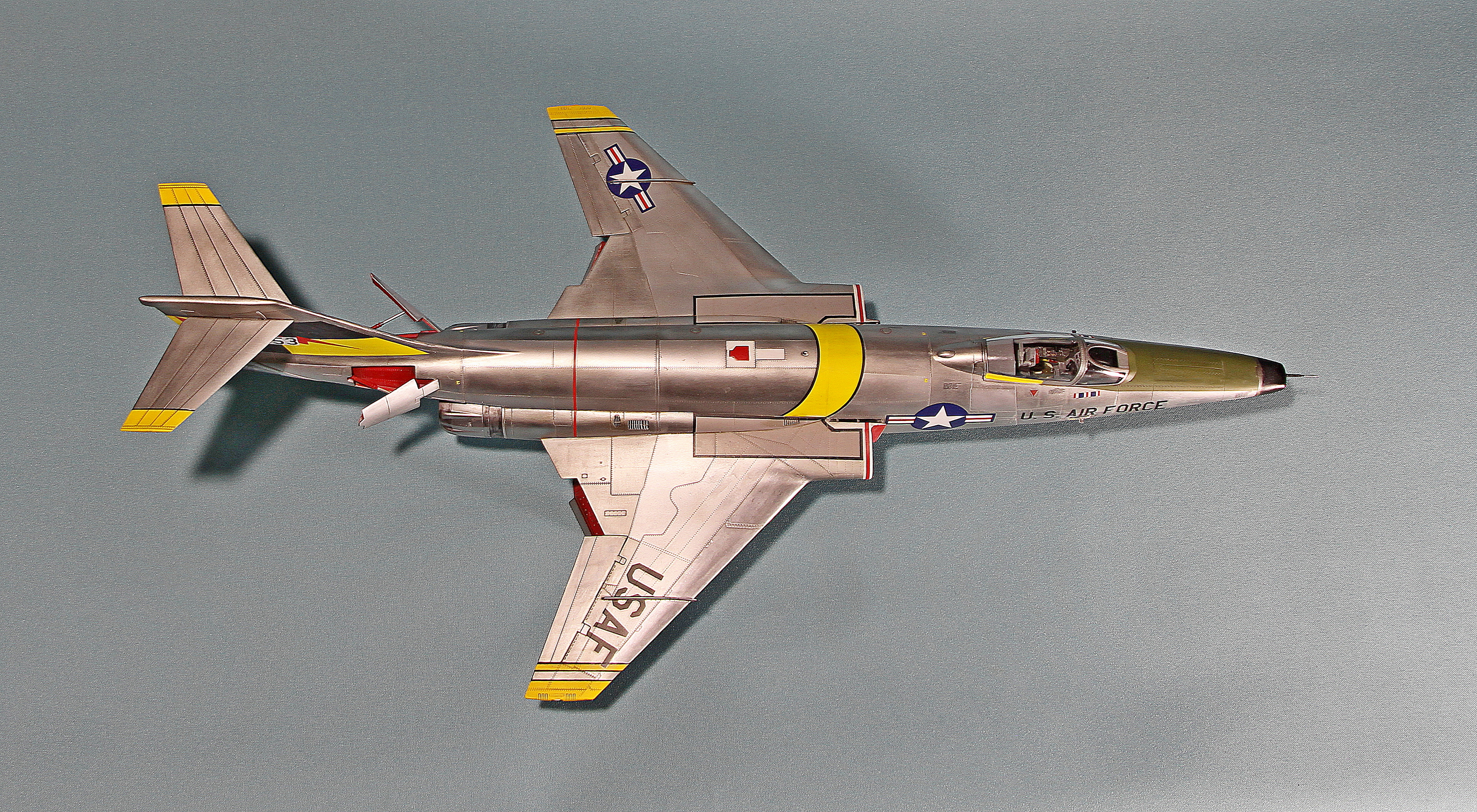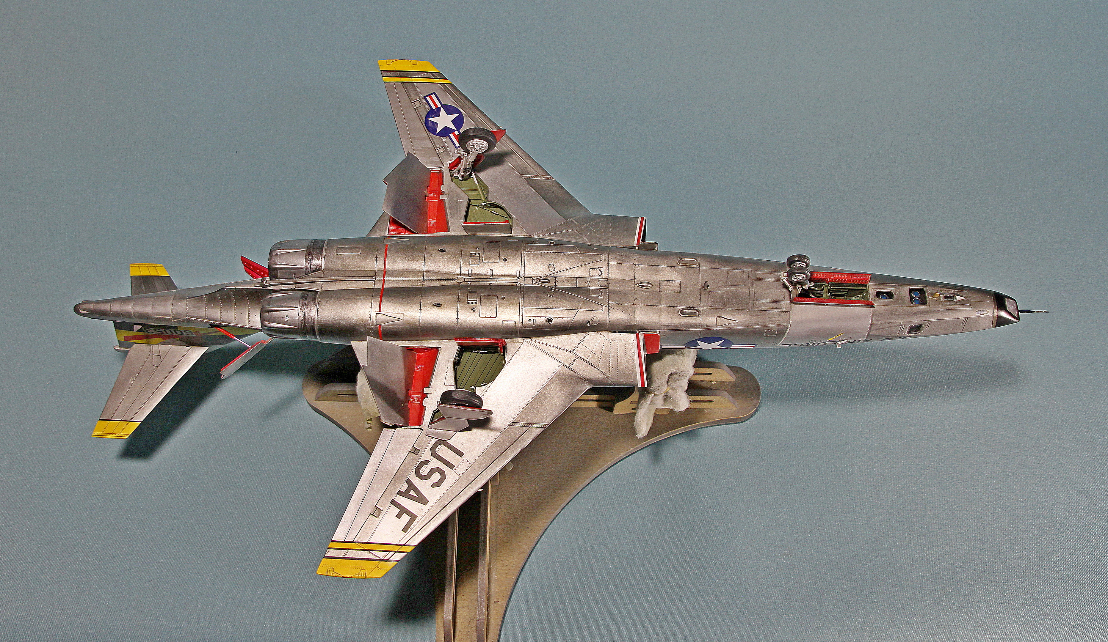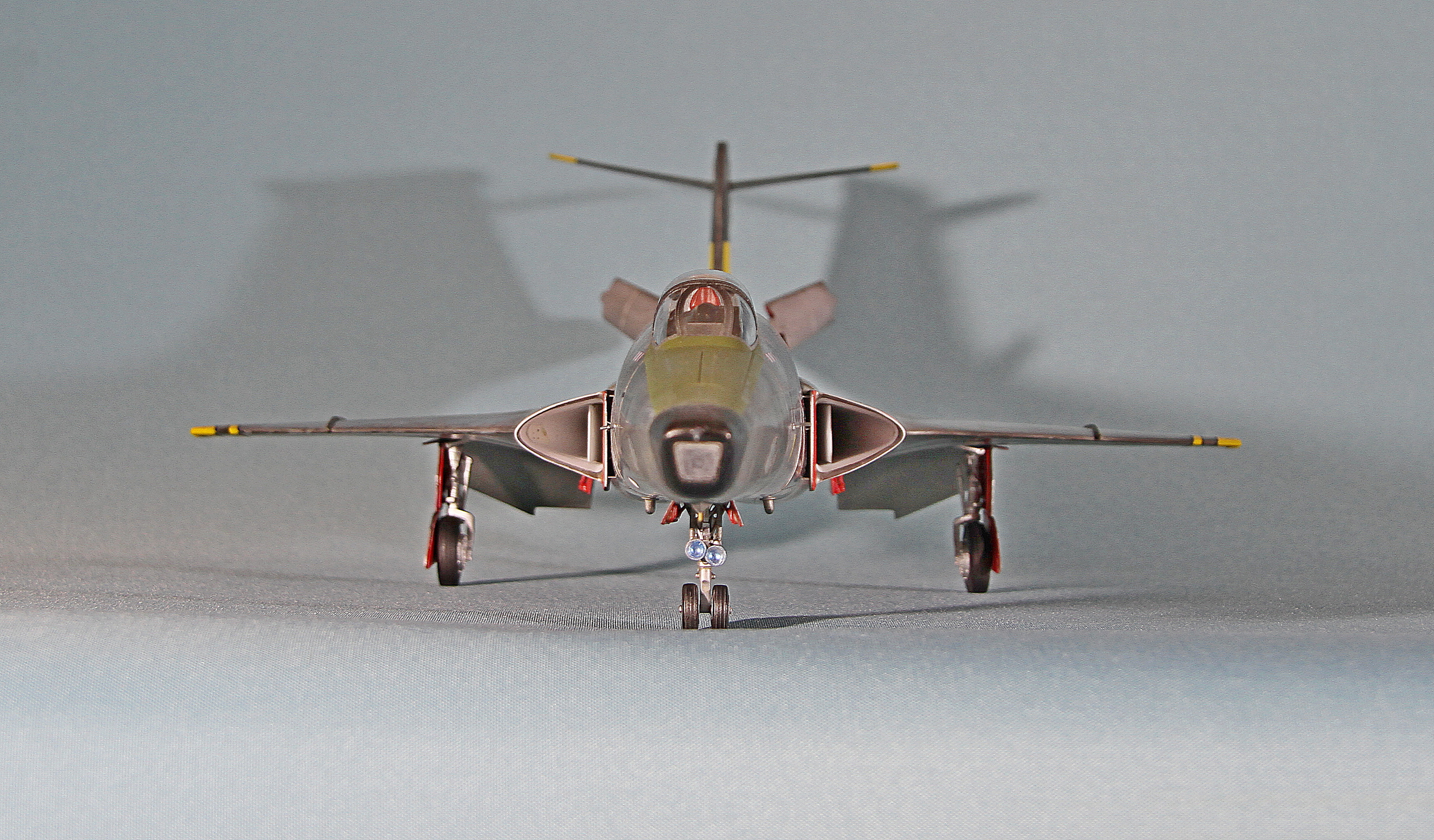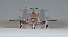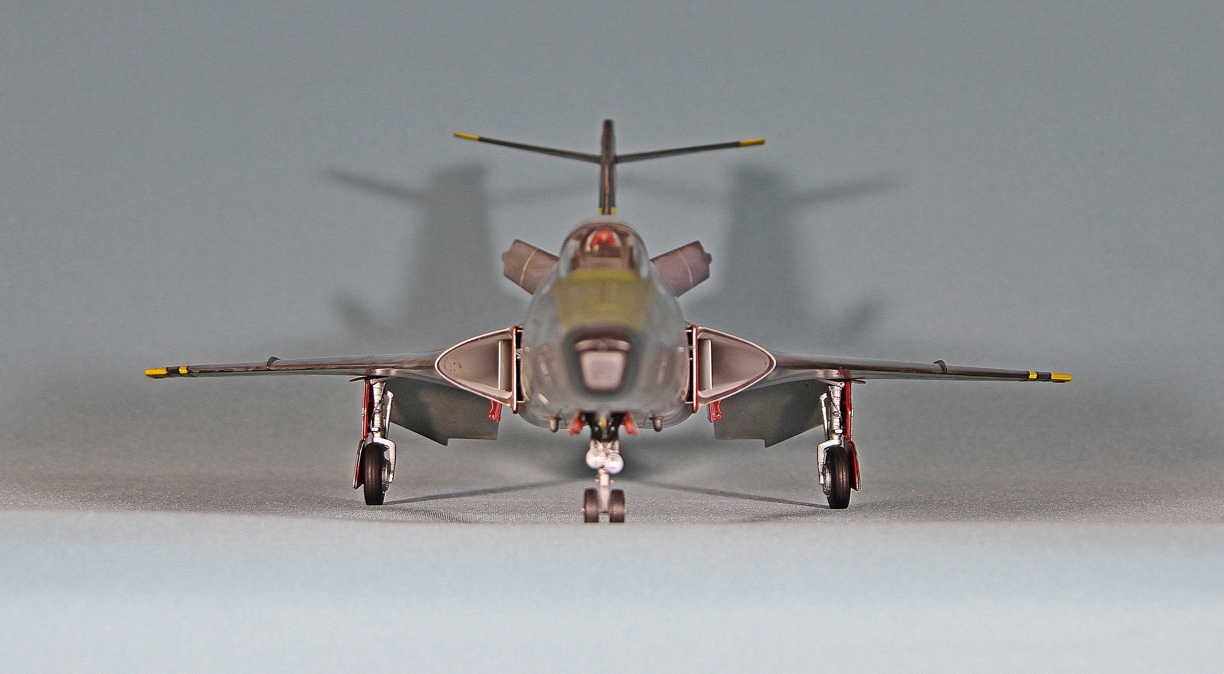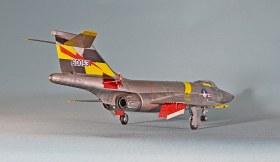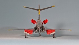 Еще несколько замечаний по сборке. У потенциального сборщика этого кита могут возникнуть следующие проблемы: большая ступенька при стыковке носового обтекателя, большая ступенька при присоединении хвостовой части, сложности при установке больших панелей под кабиной. Они никак не хотят клеиться без ступенек. Также стыковка панелей двигателя является проблемной. Слишком толстые стенки носовой части не позволят вклеить окошки камер заподлицо. Понадобится доработка стенок. Слишком толстая декаль не позволила мне, например, наклеить ее на законцовки крыльев. Пришлось накрашивать черно-желтые полосы. Также пришлось накрашивать и красно-белые полосы на воздухозаборниках, так как декаль имеет неправильную кривизну и ее невозможно использовать на воздухозаборниках новой формы. И вот только тогда, когда потенциальный сборщик перекидает весь этот вагон угля детским совочком, только тогда можно будет приблизиться к модели-копии этого самолета!