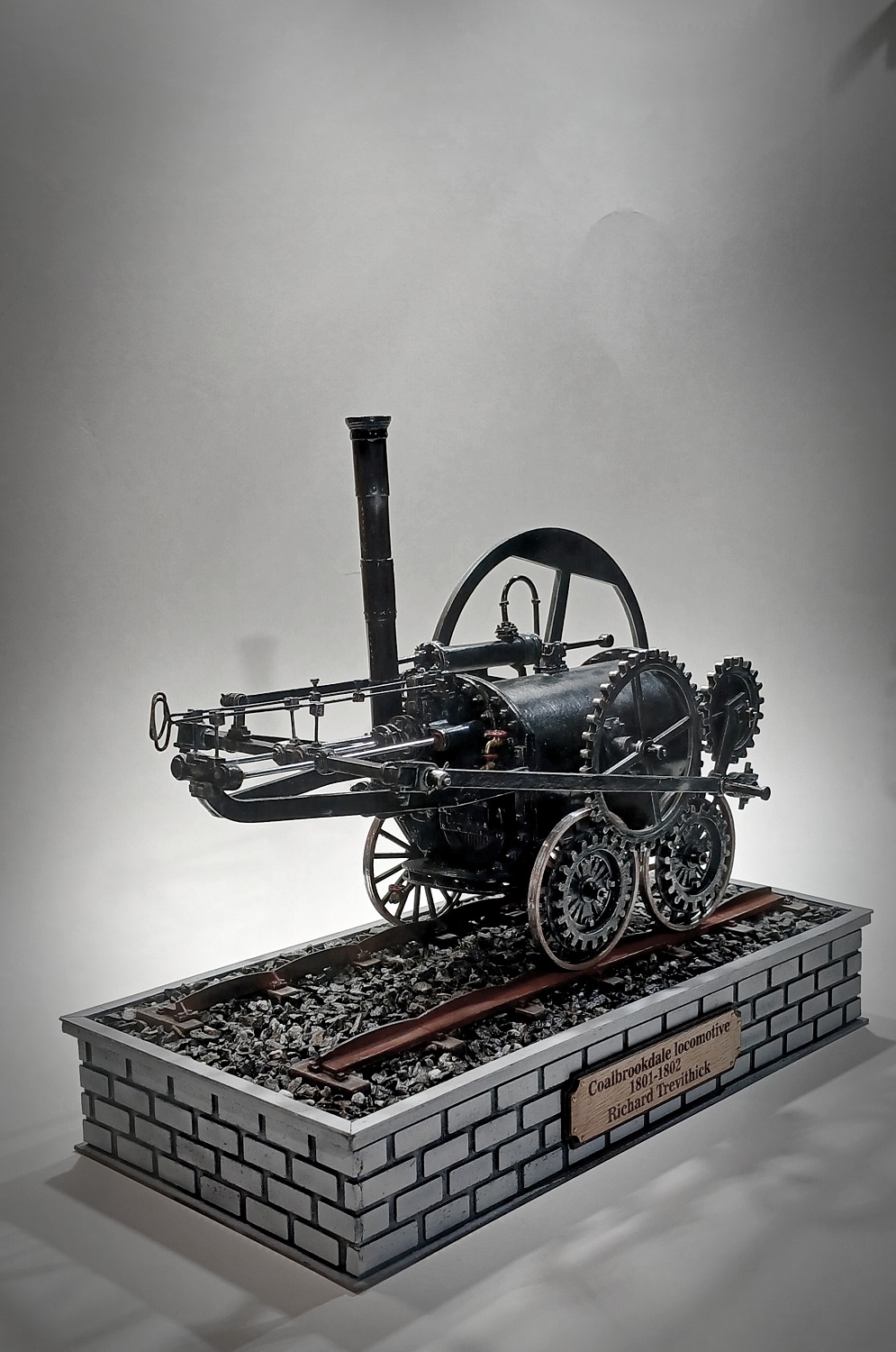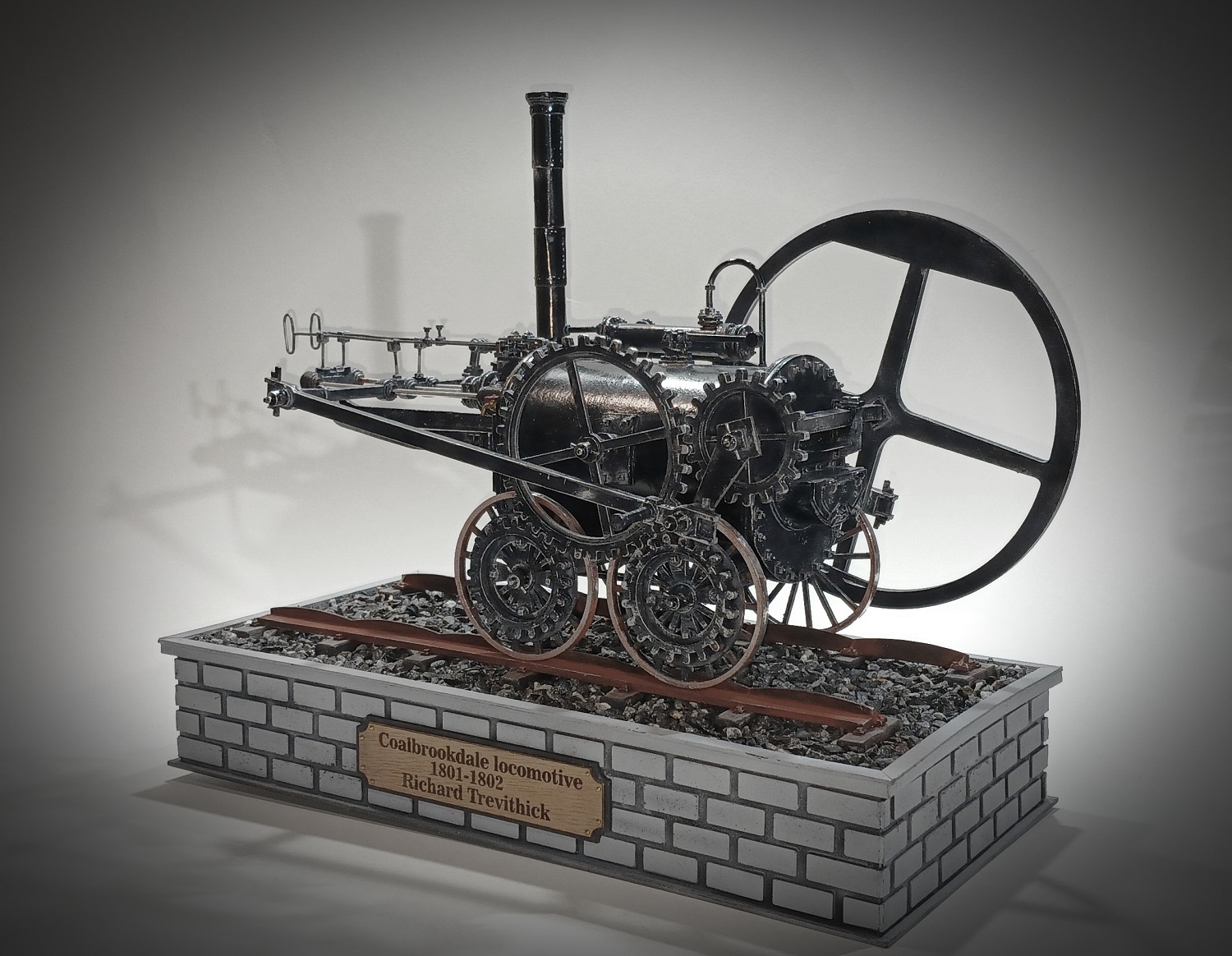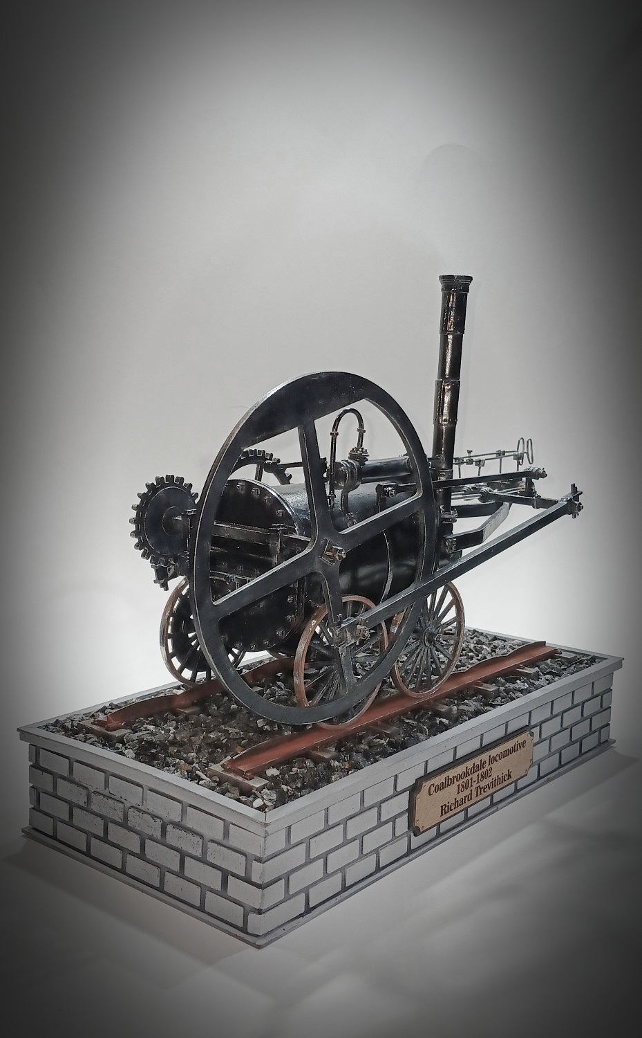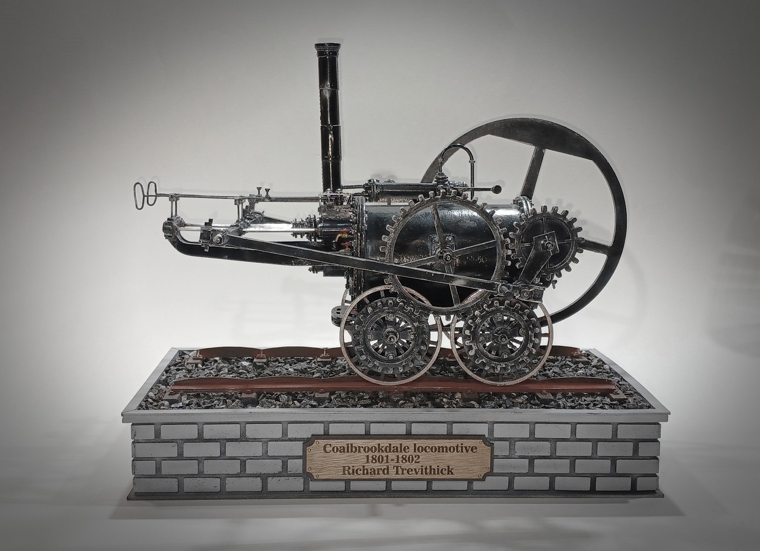 Coalbrookdale locomotive самый первый в мире рельсовый паровоз. Был построен в 1801 году (по другим данным в 1802-м), под руководством инженера Ричарда Тревитика в городе Колбрукдейл, в честь которого и получил название. Часто за паровоз «Колбрукдейл» принимают третий паровоз Тревитика — «Пенидаррен», который является самым первым в мире запатентованным паровозом, но чертежей которого не сохранилось. Основное отличие «Колбрукдейла» от «Пенидаррена» заключается в расположении дымовой трубы: у первого она располагалось со стороны выхода штока поршня, тогда как у второго её перенесли ближе к маховику, также была и "Invicta". Всем Добра! Вот что то захотелось мне сделать Паровоз! Масштаб 1:16 Модель полностью из картона разных толщин и ватмана, все шпильки из латунных прутков разной толщины, оси толкателей и колес из алюминиевого прутка, имитация клепок на дымоходной трубе из тонкого метала с расшивкой, все трубо-паро проводы из проволоки, шпалы из клееных палочек от мороженого, отсыпка полотна натуральная гранитная крошка для аквариума. Изначально модель окрасил в серый полуматовый шаровый цвет , сделал черную смывку, красиво вышло, вроде-бы все отлично,,,,,,но, не то, как какой-то РЖД! Паровозы всегда были черными!!!! Ну и пришлось перекрасить в черный, и снова делать уже серую смывку. Простите за некачественные фото, черное очень сложно фотографировать. Всем приятного просмотра!