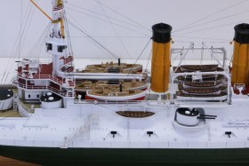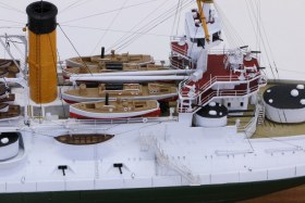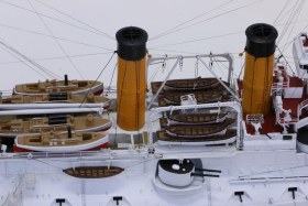 Я бы в иллюминаторы вставил тёмно-серый глянцевый Оракал или хотя бы капельки затемнённого лака. Ступеньки на трапах едва-ли были белые.