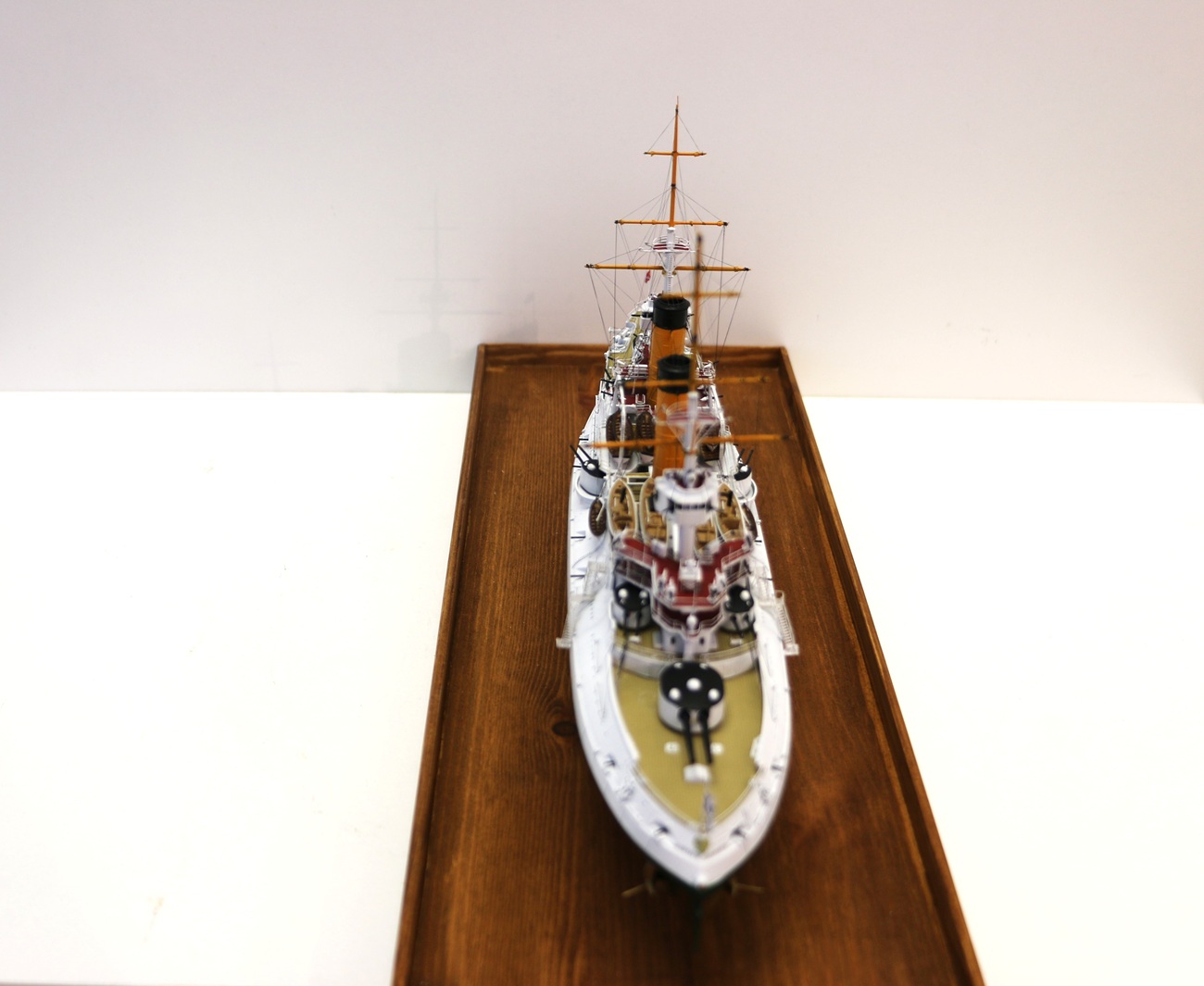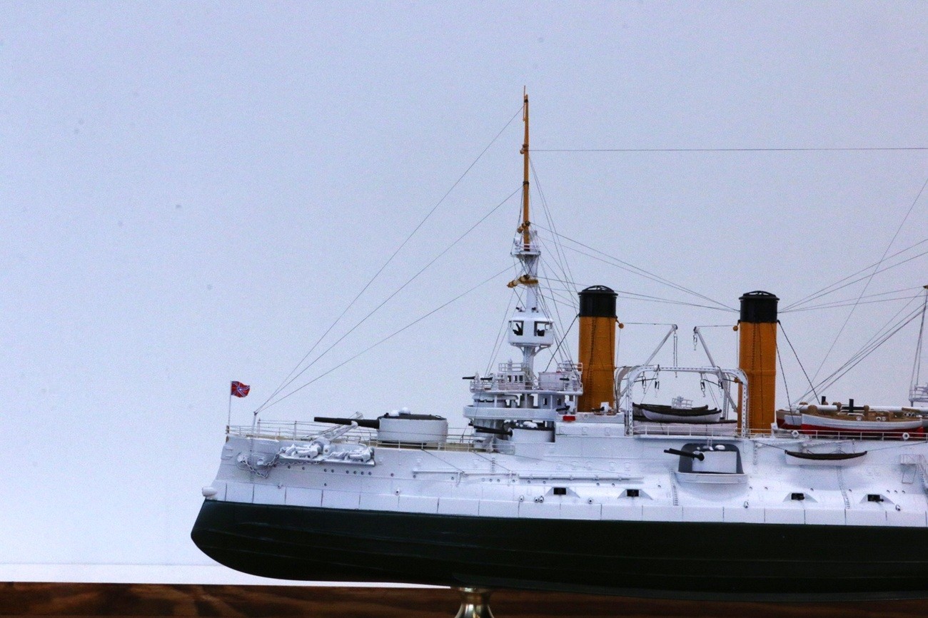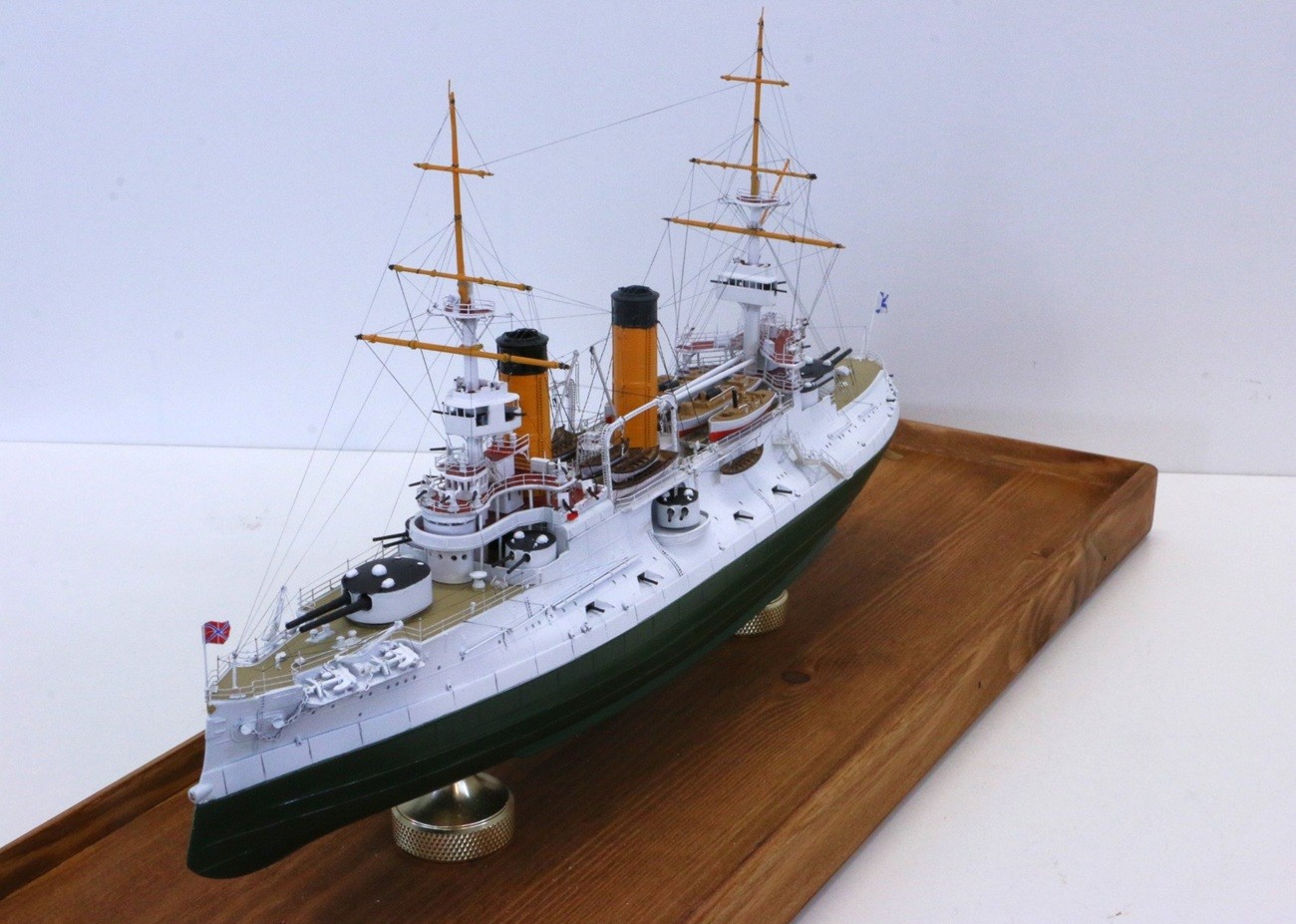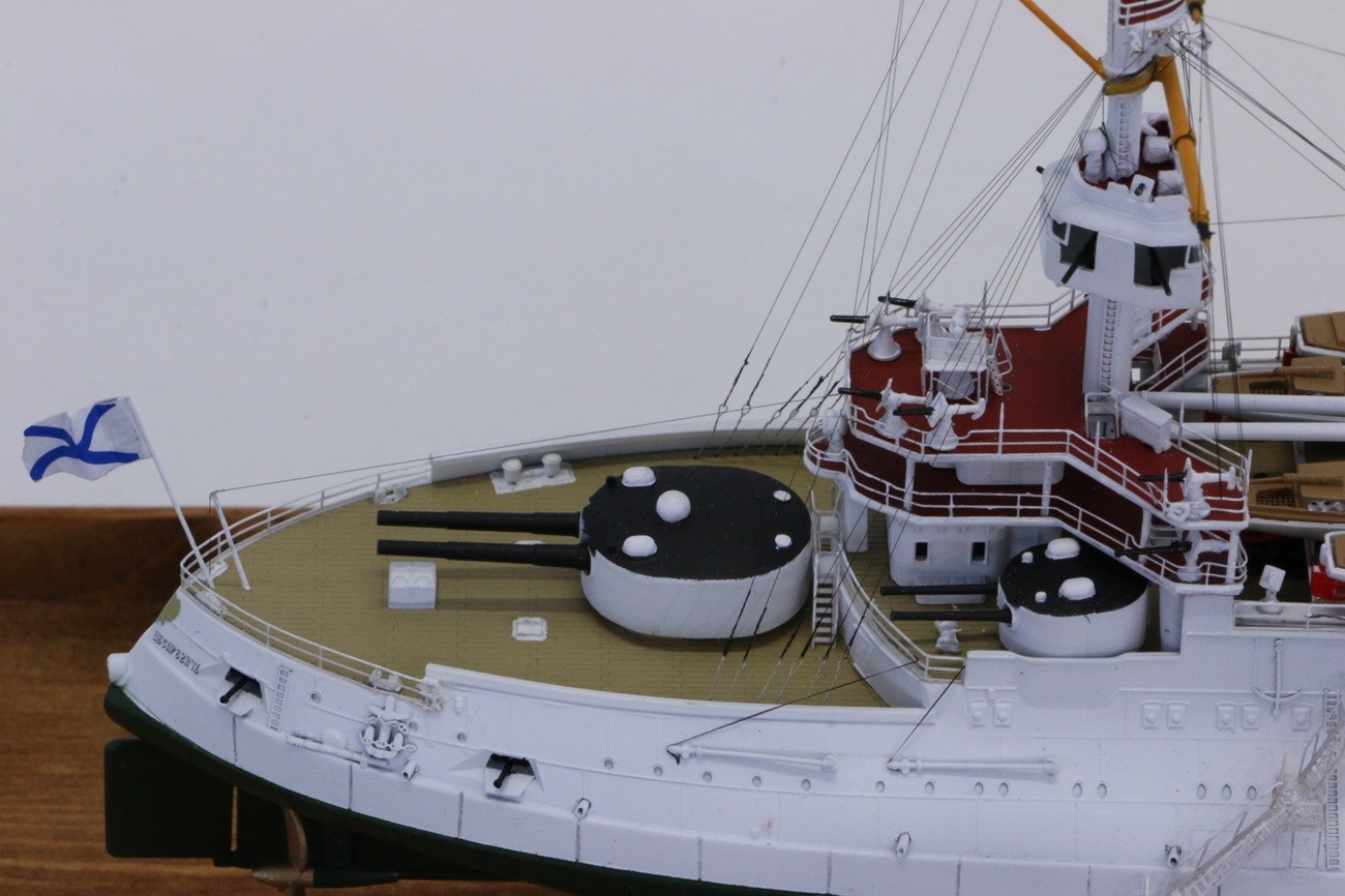 Представляю модель броненосца Цесаревич на 1903 год .Закончил стройку еще в прошлом году и не успел выложить. Не совсем уже помню всех деталей, но постараюсь по памяти и фотографиям описать переделки. Начал с корпуса и переделал нижнюю расшивку на внутреннюю. Верх не стал трогать. Добавил нижние пояса общивки -и 24 сливных труб. Доработал якорные полки и закрепил якоря. В боевой рубке прорезал смотровые щели. В ходовой добавил окно. Немного увеличил толщину стен мостика. Также наращивал основание мостика. Пластиковые мачты менял полностью по всей длине. Переделывал бронекатера, доработал крамбол. На кранах подьема и спуска плавсредств изобразил скобы.