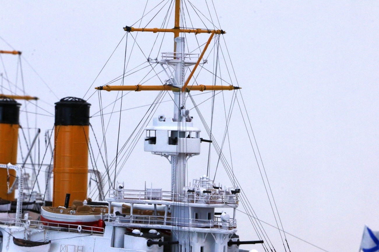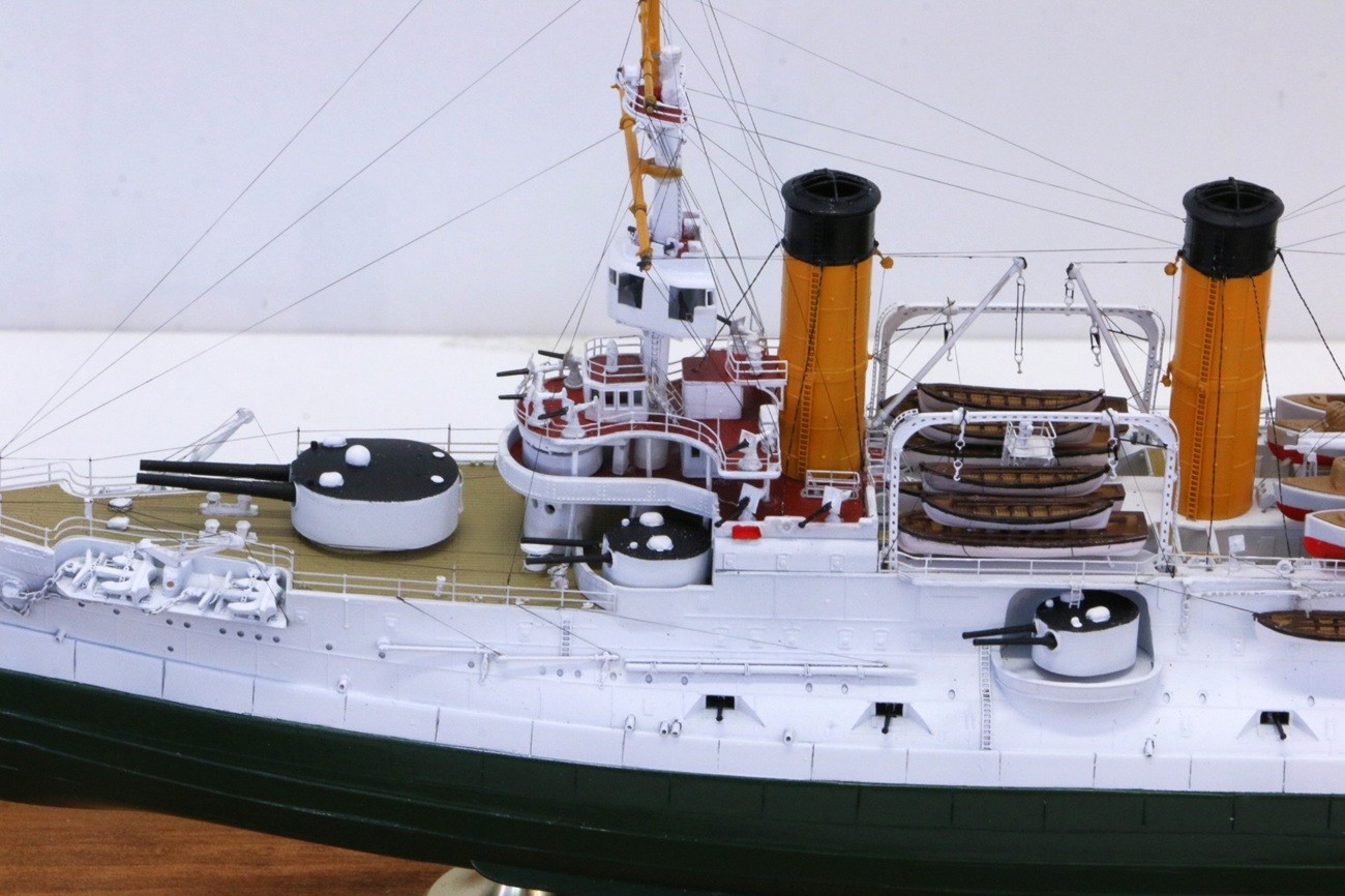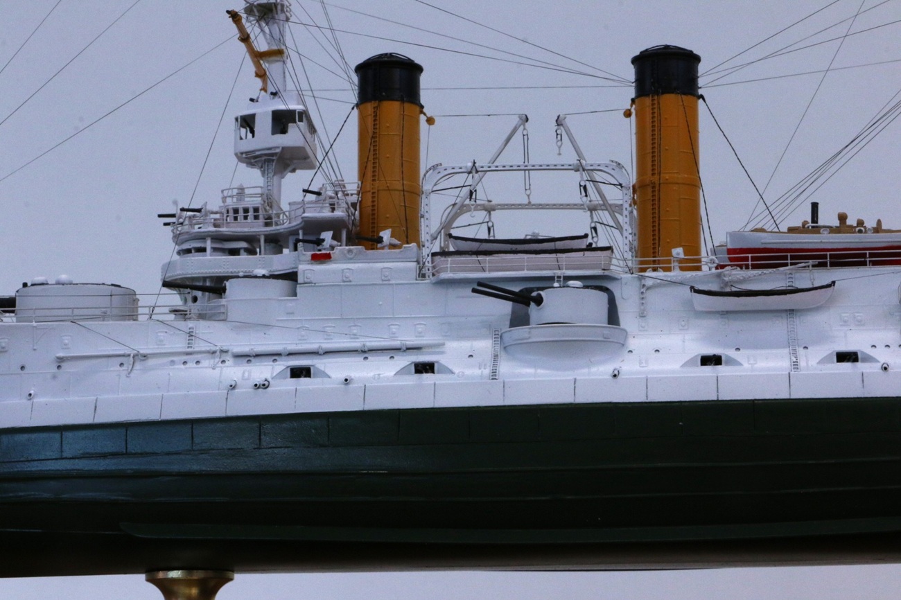 Представляю модель броненосца Цесаревич на 1903 год .Закончил стройку еще в прошлом году и не успел выложить. Не совсем уже помню всех деталей, но постараюсь по памяти и фотографиям описать переделки. Начал с корпуса и переделал нижнюю расшивку на внутреннюю. Верх не стал трогать. Добавил нижние пояса общивки -и 24 сливных труб. Доработал якорные полки и закрепил якоря. В боевой рубке прорезал смотровые щели. В ходовой добавил окно. Немного увеличил толщину стен мостика. Также наращивал основание мостика. Пластиковые мачты менял полностью по всей длине. Переделывал бронекатера, доработал крамбол. На кранах подьема и спуска плавсредств изобразил скобы.