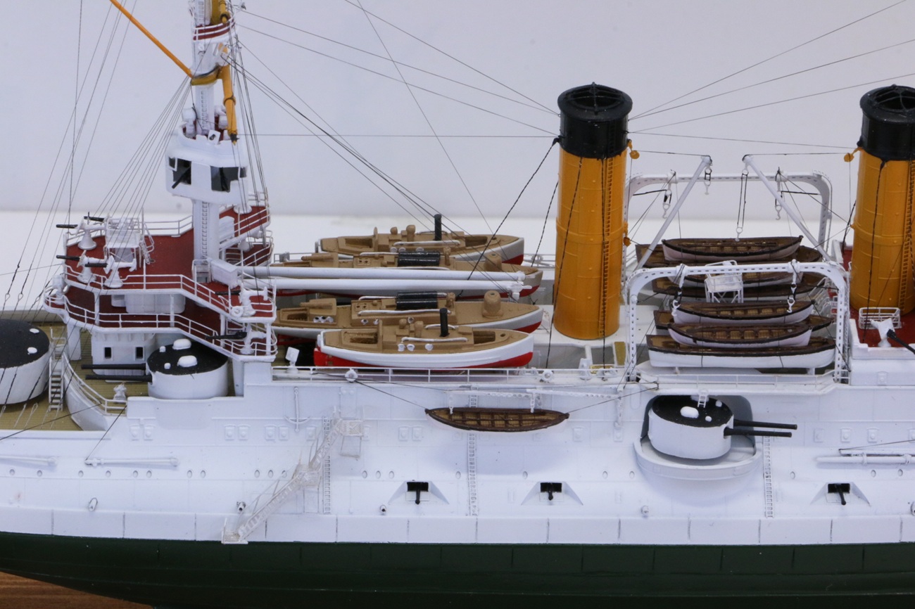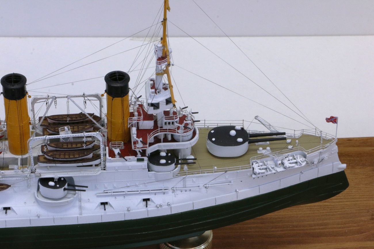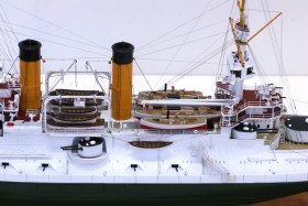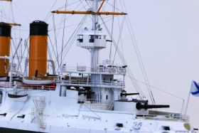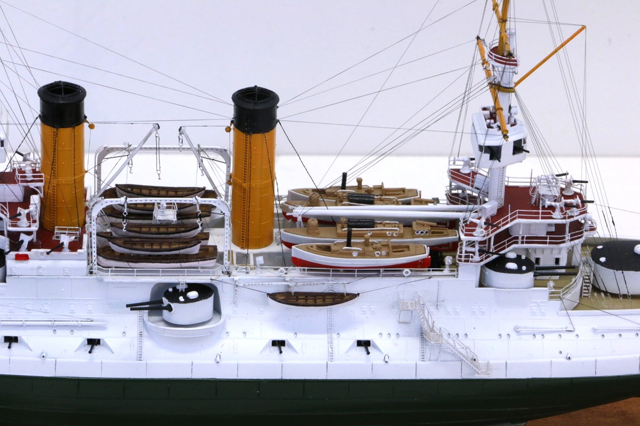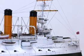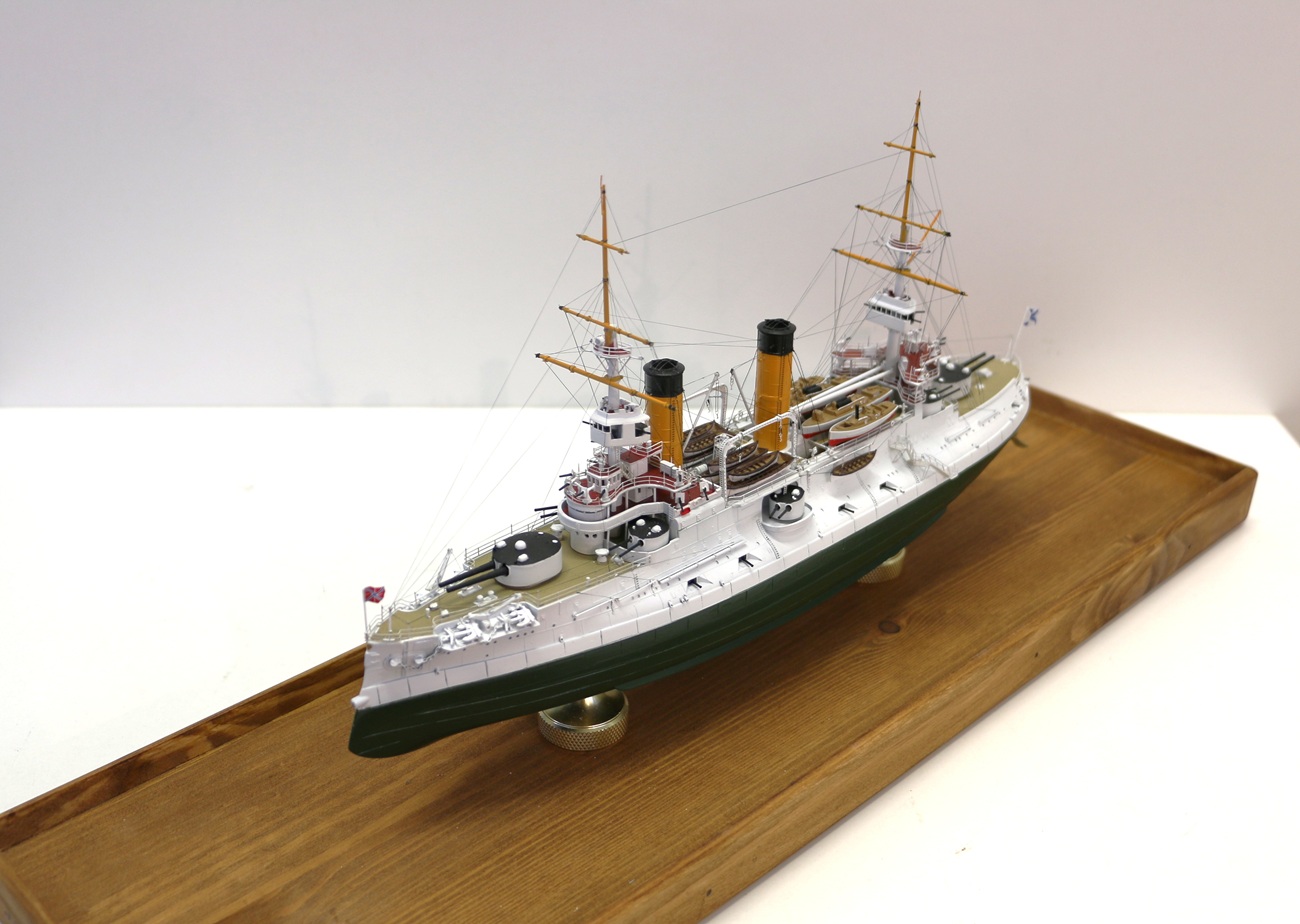 Представляю модель броненосца Цесаревич на 1903 год .Закончил стройку еще в прошлом году и не успел выложить. Не совсем уже помню всех деталей, но постараюсь по памяти и фотографиям описать переделки. Начал с корпуса и переделал нижнюю расшивку на внутреннюю. Верх не стал трогать. Добавил нижние пояса общивки -и 24 сливных труб. Доработал якорные полки и закрепил якоря. В боевой рубке прорезал смотровые щели. В ходовой добавил окно. Немного увеличил толщину стен мостика. Также наращивал основание мостика. Пластиковые мачты менял полностью по всей длине. Переделывал бронекатера, доработал крамбол. На кранах подьема и спуска плавсредств изобразил скобы.