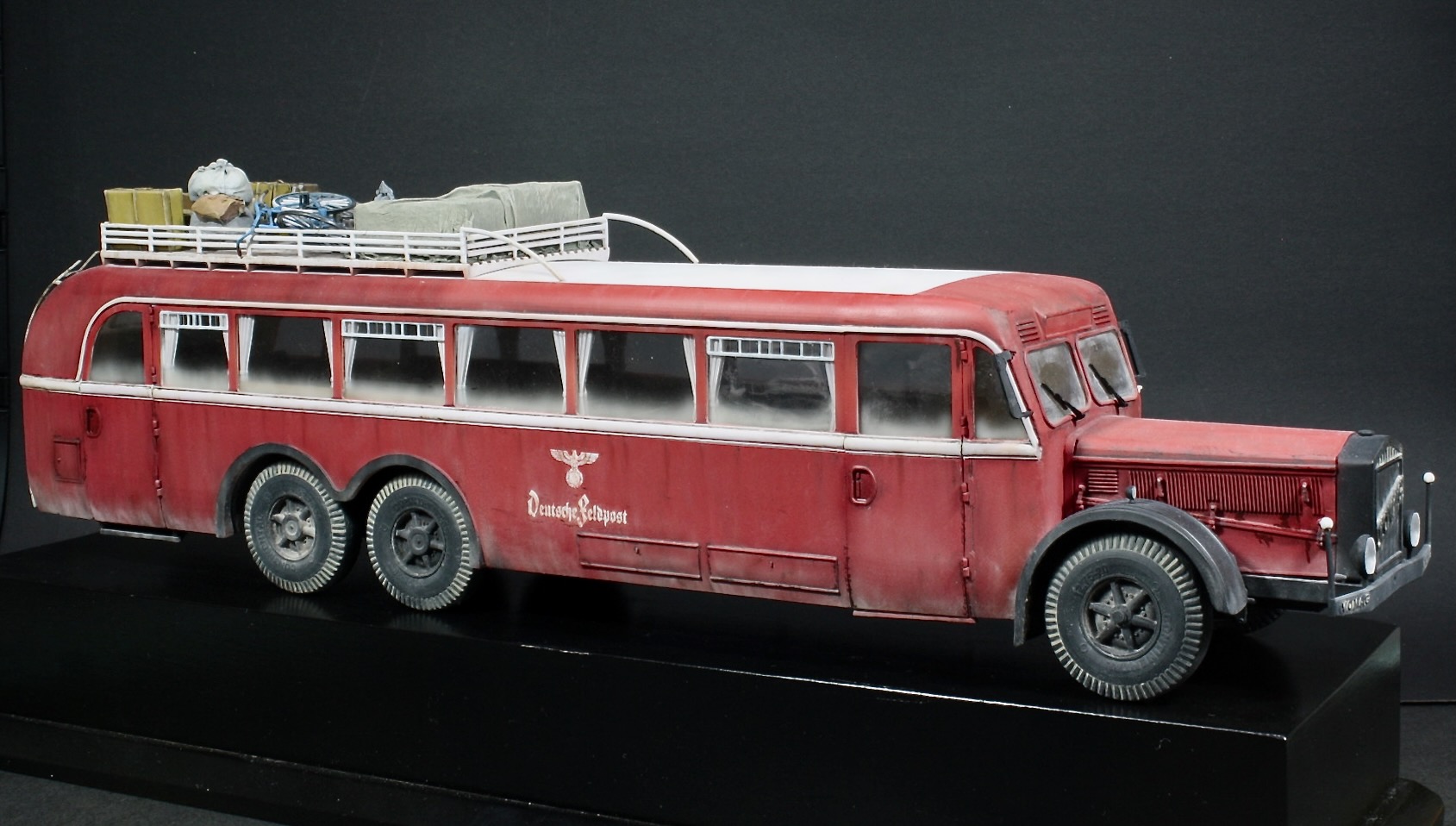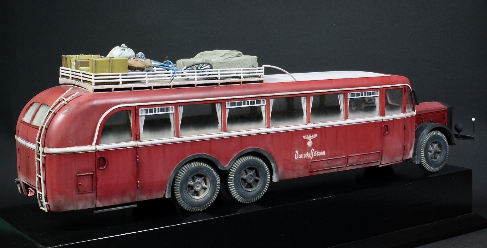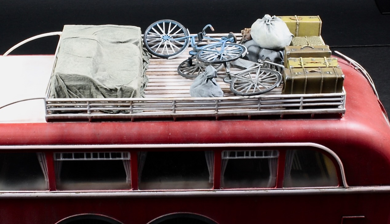 Модель собиралась целиком из коробки за исключением багажа на крыше. Чемоданы и тюки не понятно от кого,из смолы,велосипеды от Tamiya.