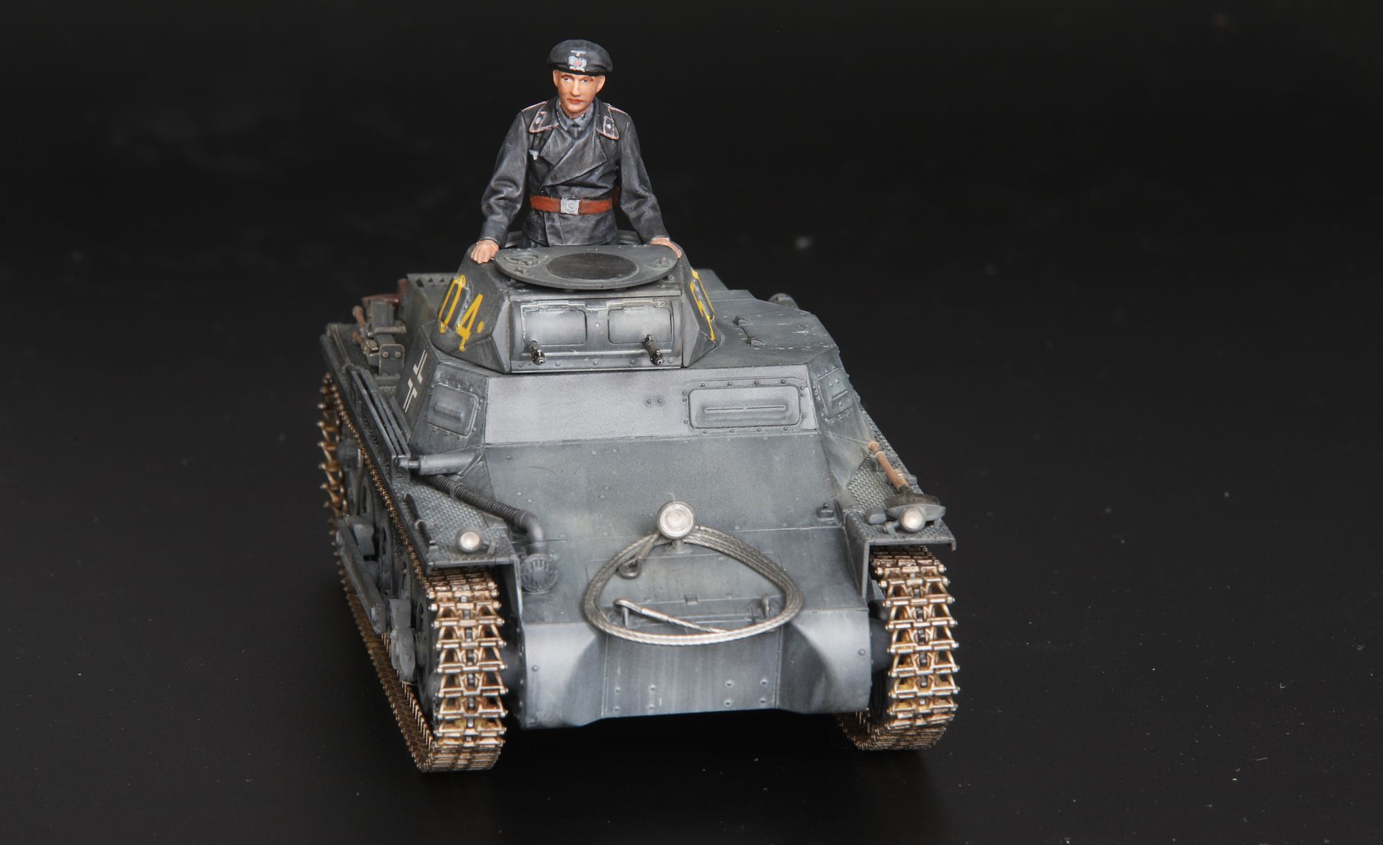 Когда-то была единичка от Звезды. Решил повторить танк, но уже от другого производителя. Модель «выходного дня». Собрал из коробки, стыкуемость идеальная. Вообще нигде и ничего не подгонял. Зачистил, примерил, приклеил. В этот раз попались очень дубовые декали. На танке кое- как приварил. А вот на фигурке кокарду, бляху и погоны приварить не получилось, пришлось изобразить красками что-то "по мотивам".