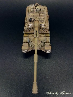 Из доработок модели кроме использования перечисленных выше наборов: срезал имитацию скоб и заменил на проволоку, из тянутого литника изготовил проводку к механизму подачи снарядов, в местах шлифовки соединений деталей ящиков на надгусеничных полках восстановил утраченные детали, удалили "юбки", тонким пластиком закрыл отверстия в надгусеничных полках, заменил на латунную трубку штыри крепления ведущих звездочек (исключается риск обломать штыри при установке звездочек после покраски), из двухкомпонентной шпаклевки TAMIYA изготовил тряпочки и разместил их на башне и корпусе.