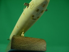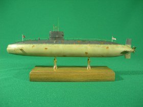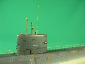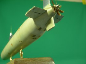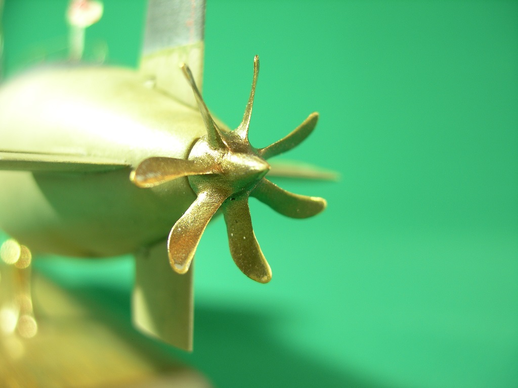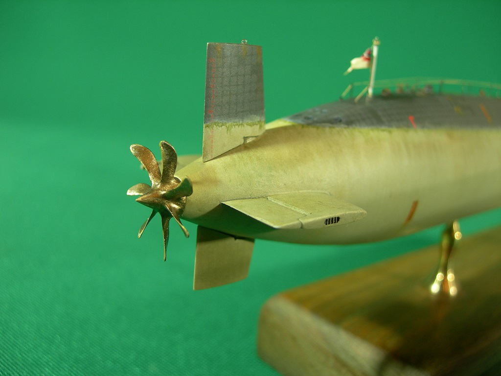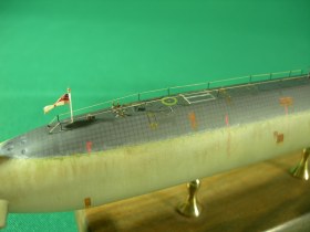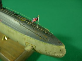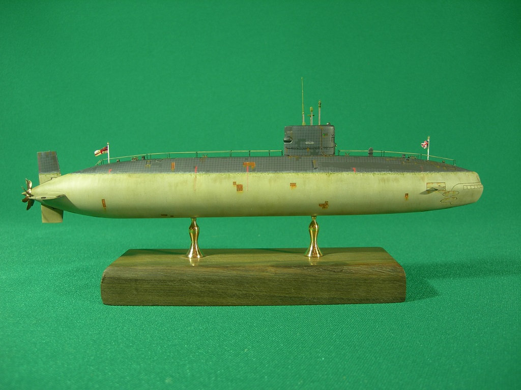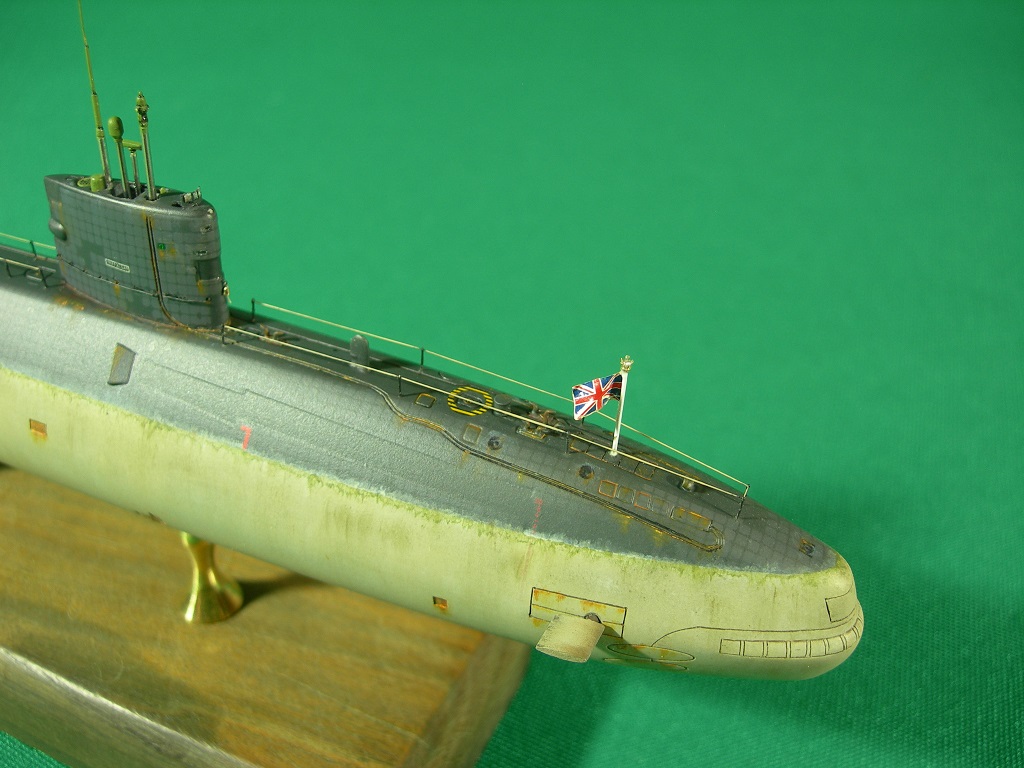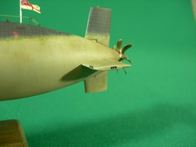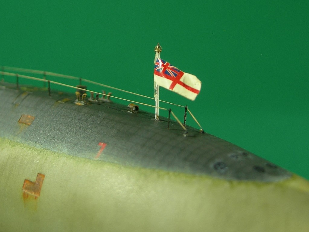Доработка модели заключалась в нанесении расшивки АБУ, обтекателей ГАС, изготовлении выдвижных устройств, ШБУ, винта, якоря, установке кингстонных решеток, решеток главных конденсаторов (кстати,весьма оригинальное решение- разместить их на стабилизаторах), флагштоков с коронами Британской империи, ну и так, по мелочам.