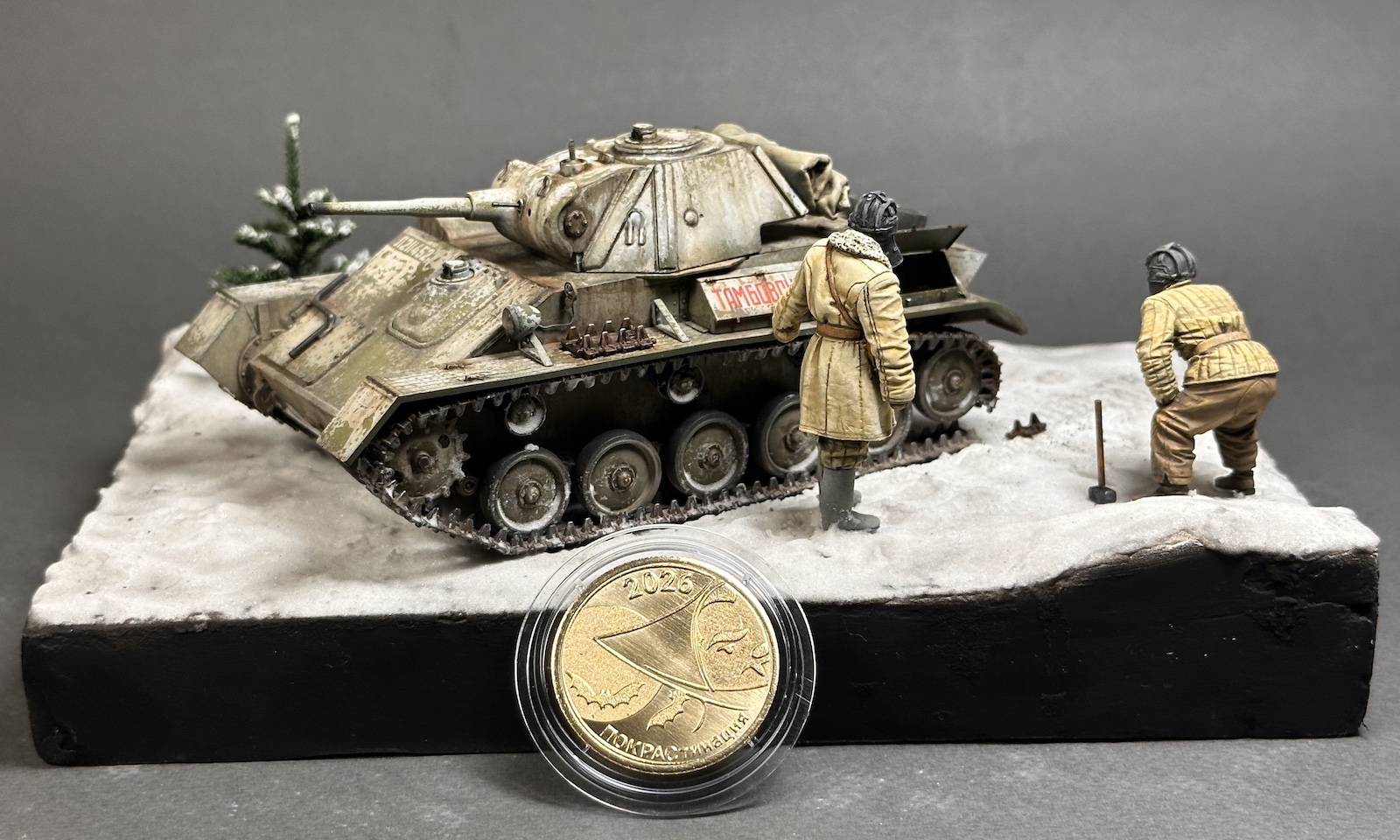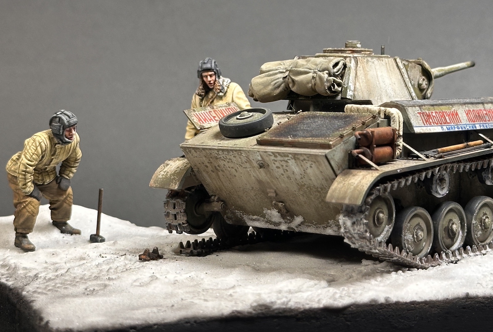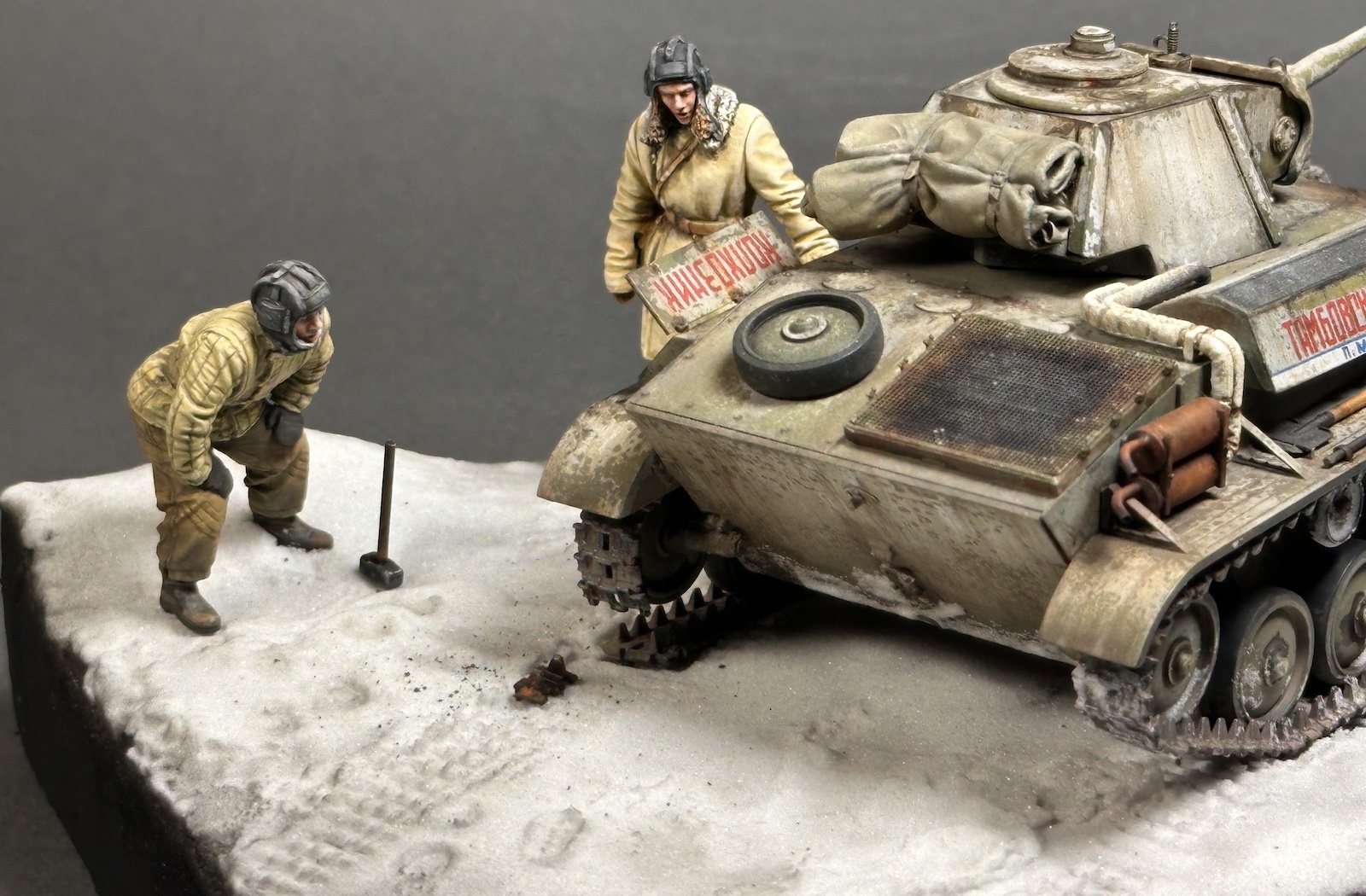 Работа несомненно отличная. Но не хватает пальцев выбитых мехводом. Ибо, если бы бал разрыв, то гусянка осталась бы позади. И не хватает зимних экранов, закрывающих радиатор и мест их крепления. С уважением.