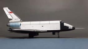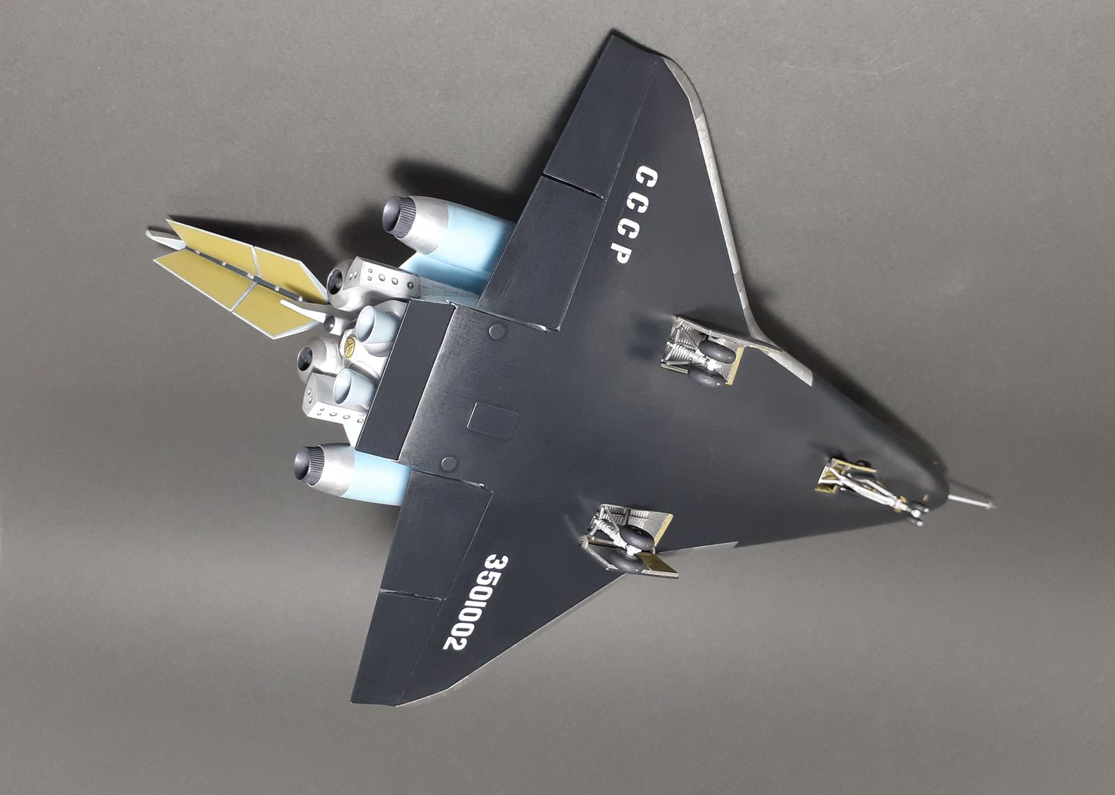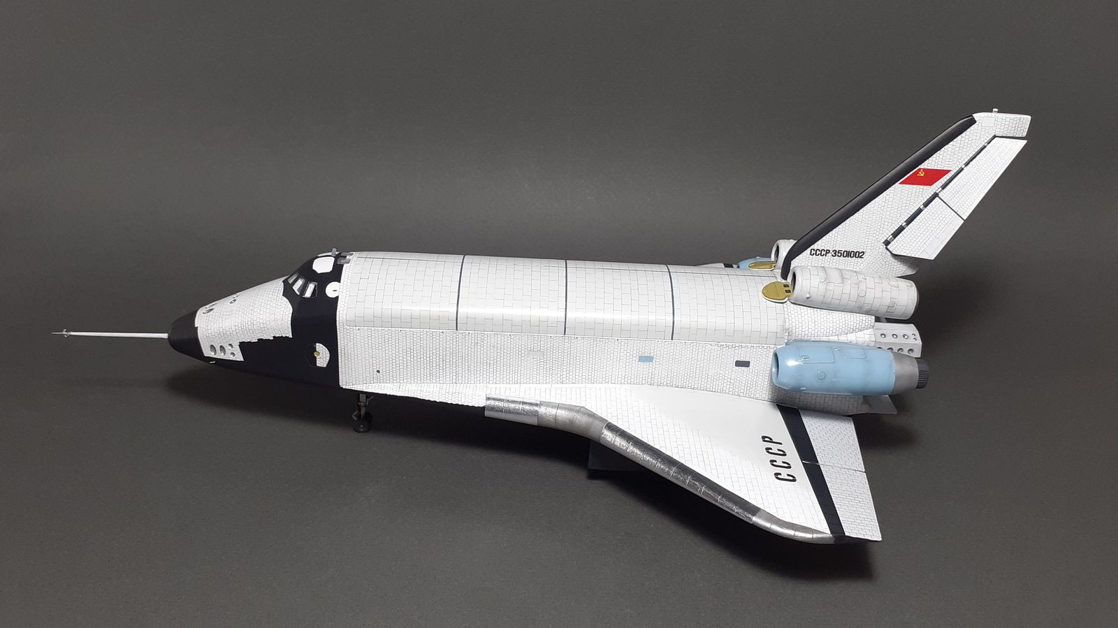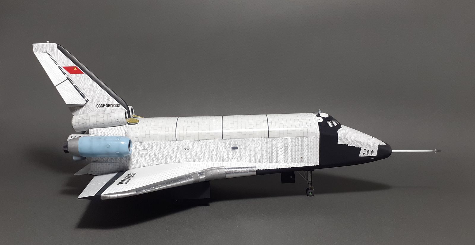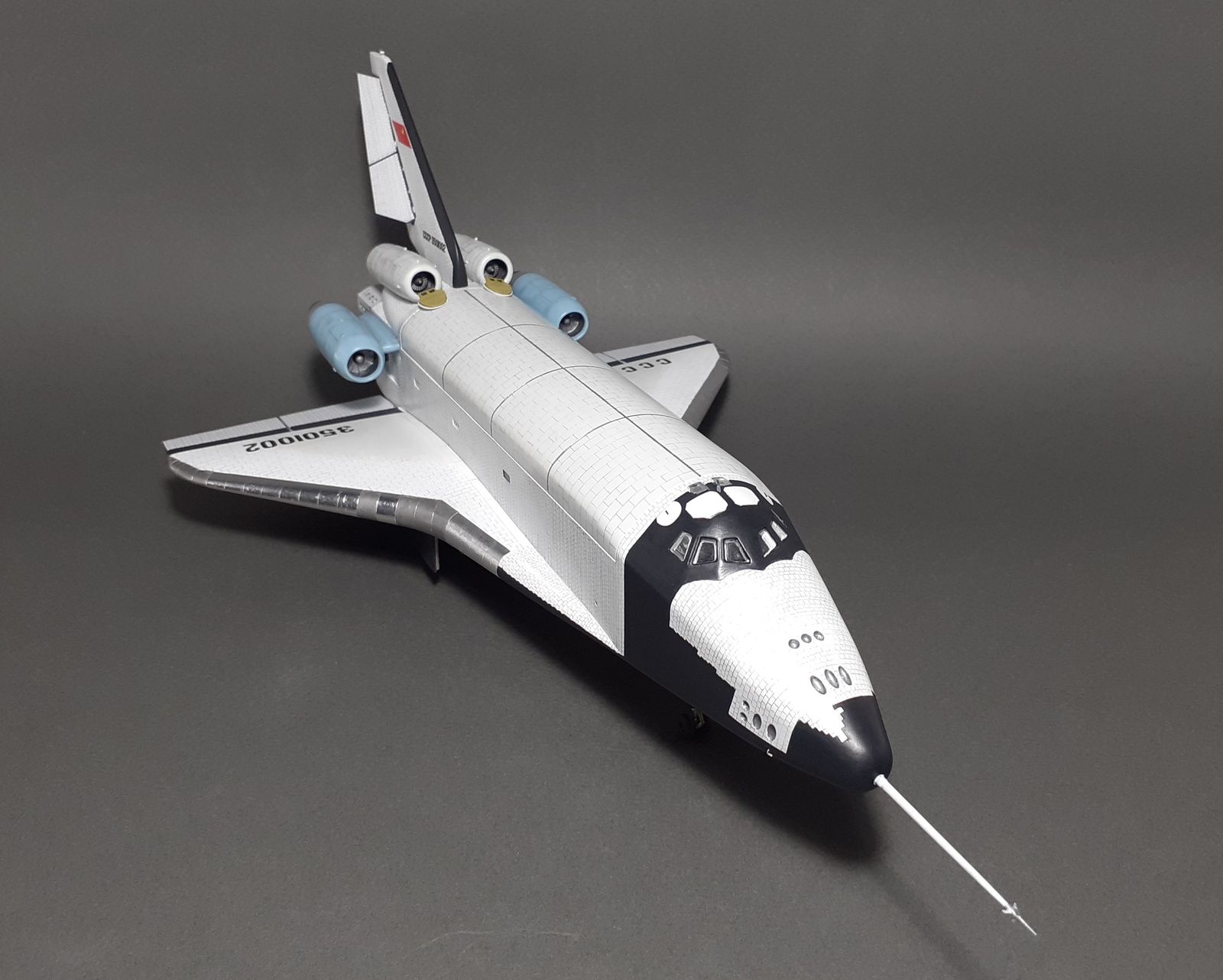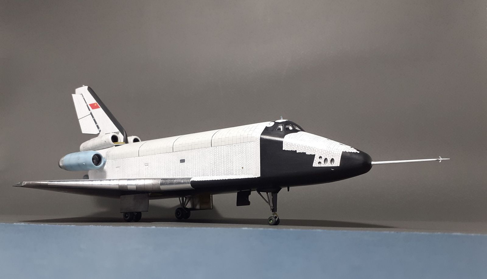 Работы по стройке: двойные окна кабины, снёс и заново нарезал накладки торцов крыла (+ фрагментальная оклейка фольгой), удлинил и детализировал переднюю нишу шасси (+обтекатель), изготовил переднюю стойку шасси, переделал переднюю створку, доработал основные ниши и створки шасси, переделал люк в корме, выбрал зазоры между элевонами, добавил недостающие сопла рулевых хвостовых ЖРД, укоротил стабилизатор, изготовил двигатели, доработал РН, изготовил носовую штангу, +разнообразные датчики по кабинной части.