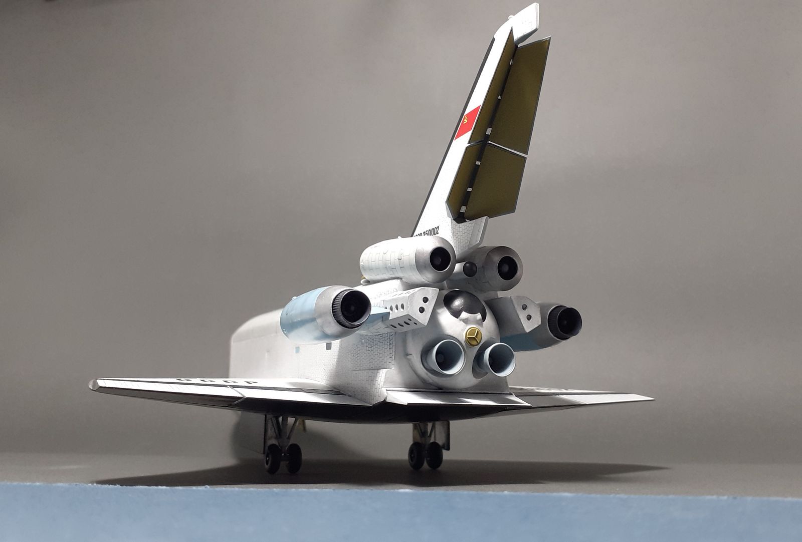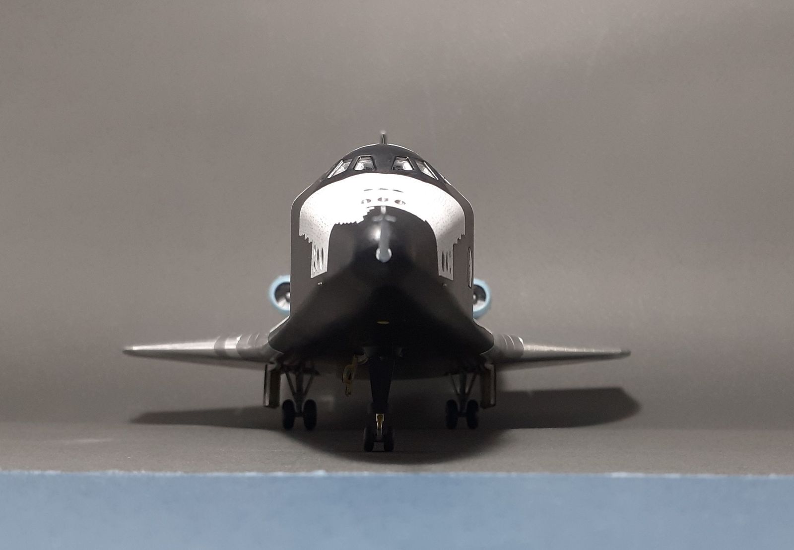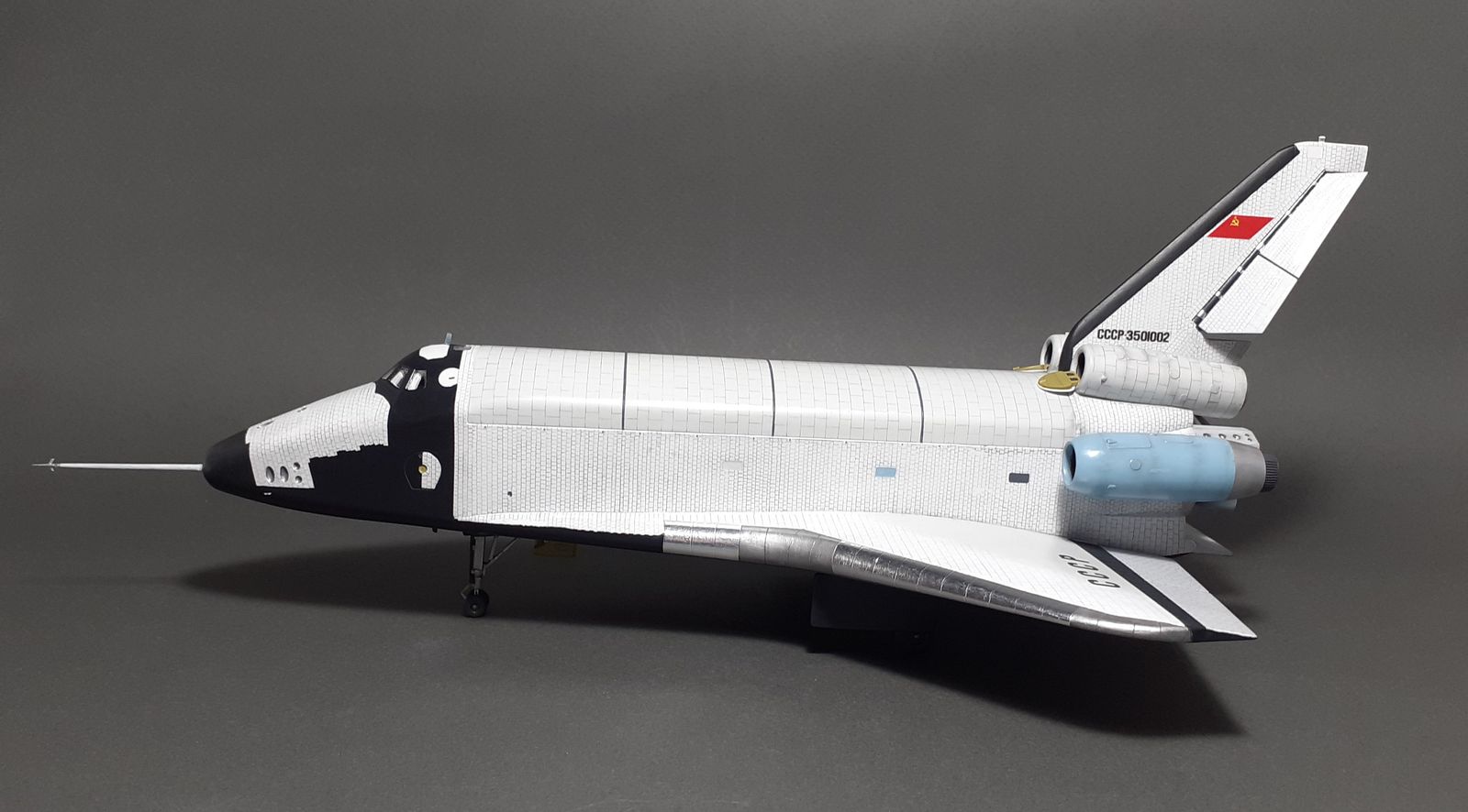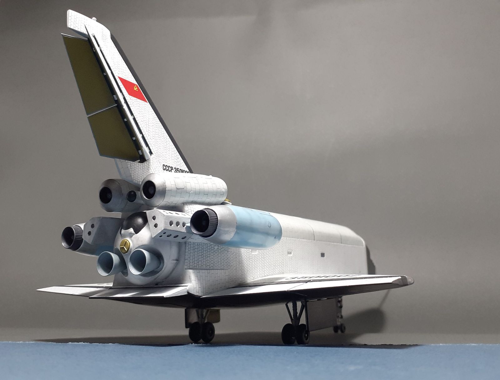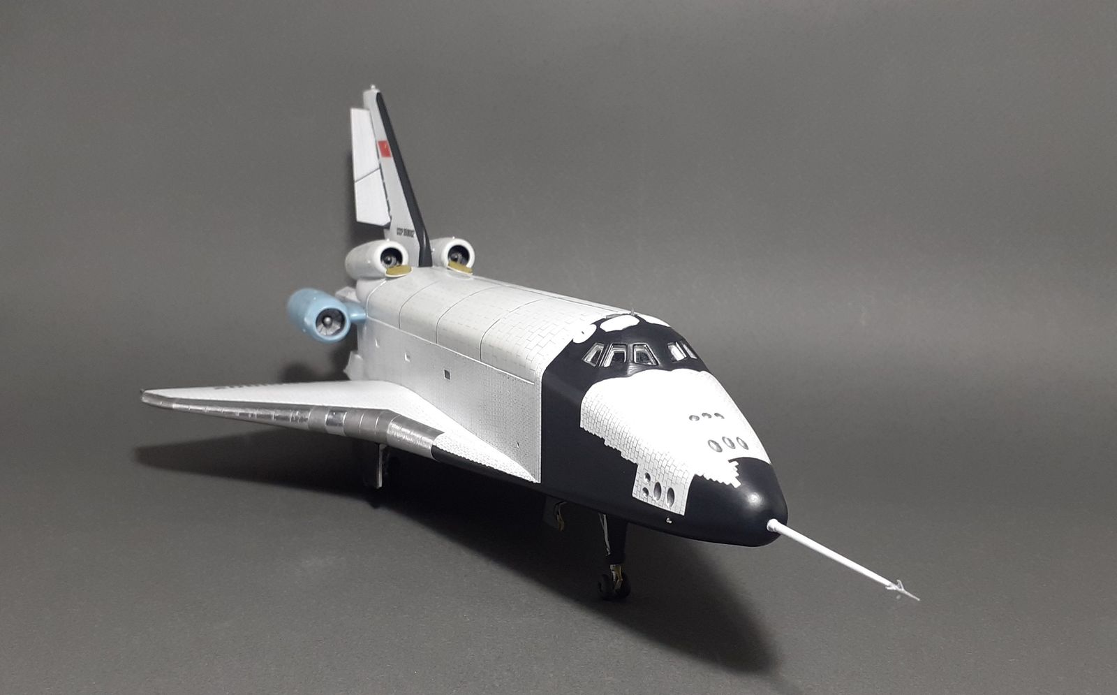 Работы по стройке: двойные окна кабины, снёс и заново нарезал накладки торцов крыла (+ фрагментальная оклейка фольгой), удлинил и детализировал переднюю нишу шасси (+обтекатель), изготовил переднюю стойку шасси, переделал переднюю створку, доработал основные ниши и створки шасси, переделал люк в корме, выбрал зазоры между элевонами, добавил недостающие сопла рулевых хвостовых ЖРД, укоротил стабилизатор, изготовил двигатели, доработал РН, изготовил носовую штангу, +разнообразные датчики по кабинной части.
