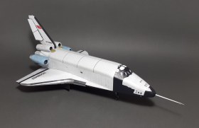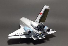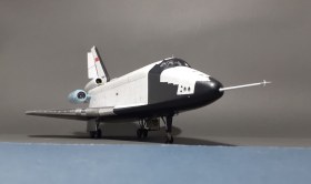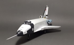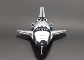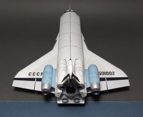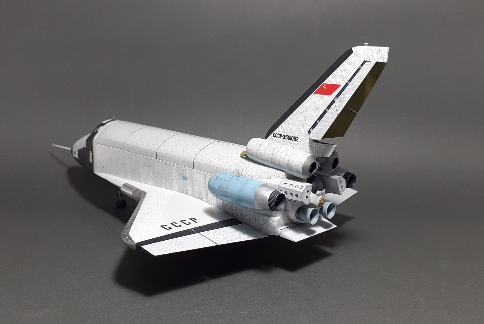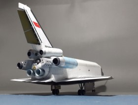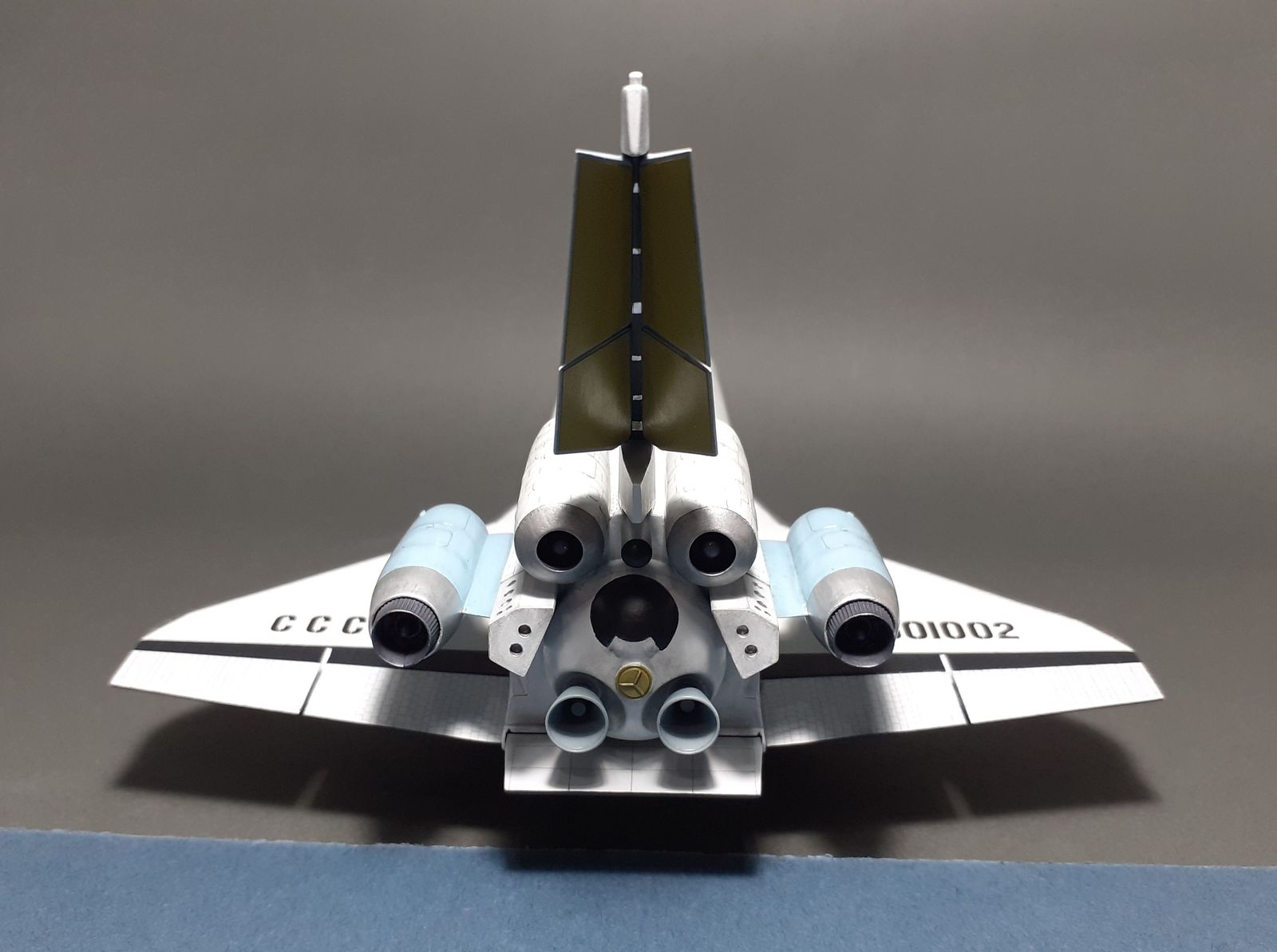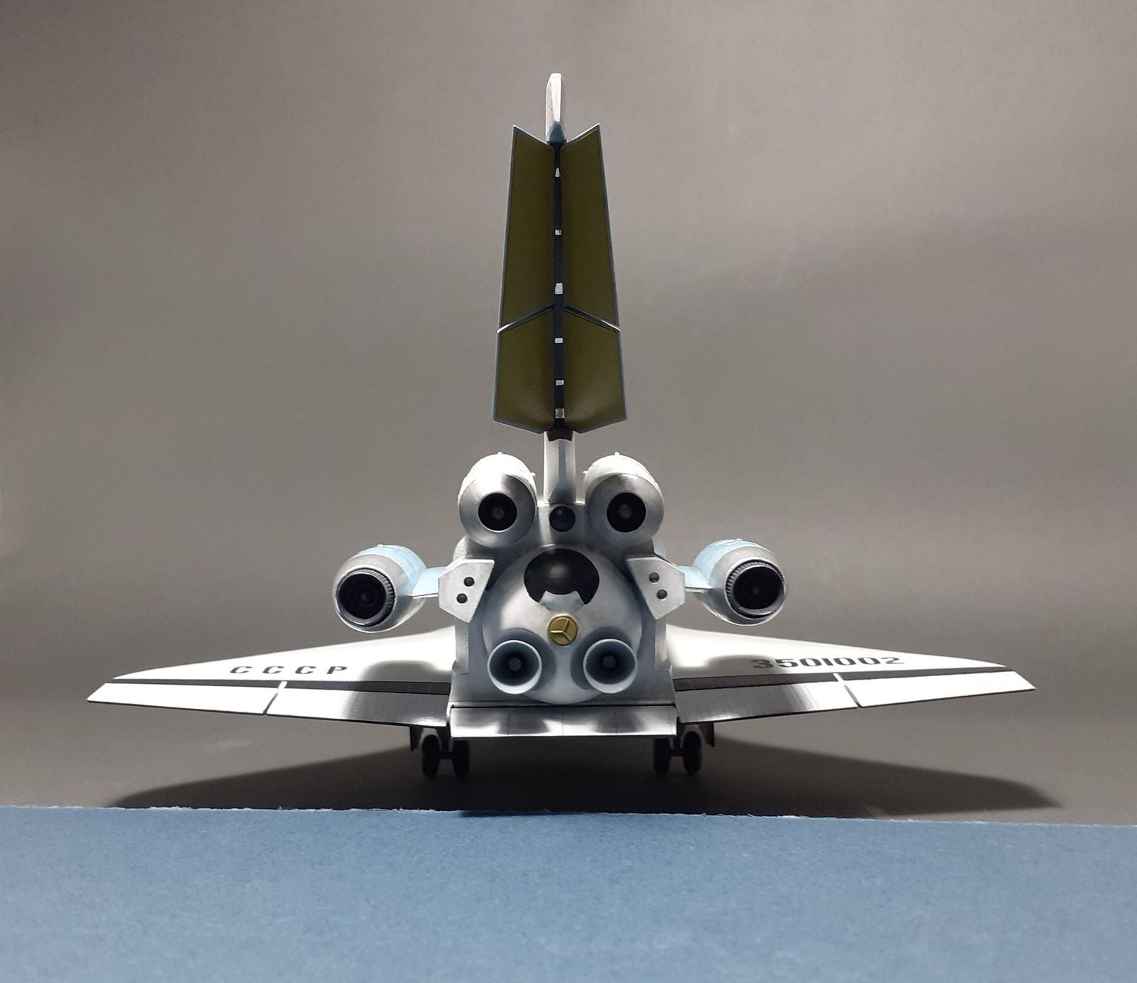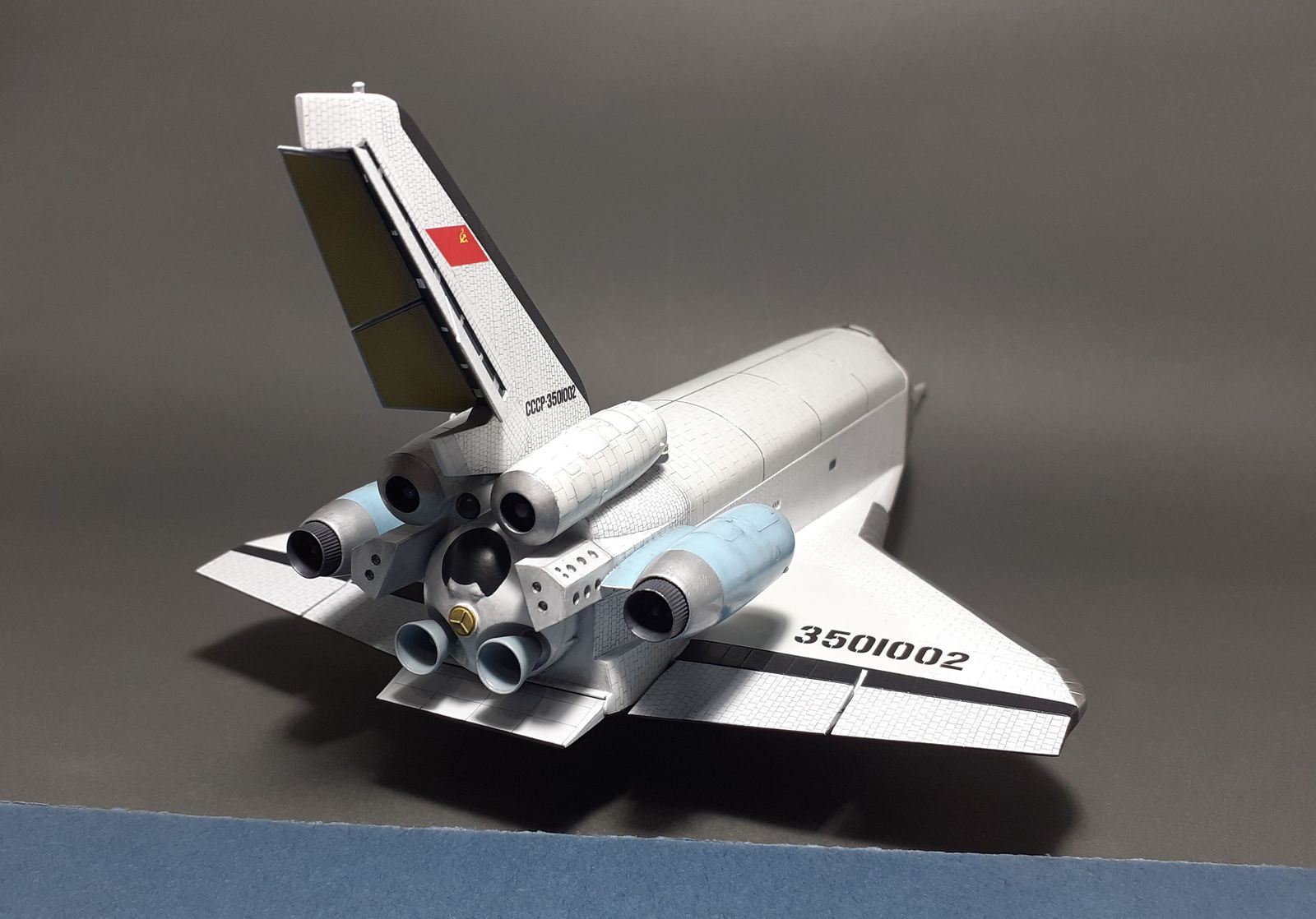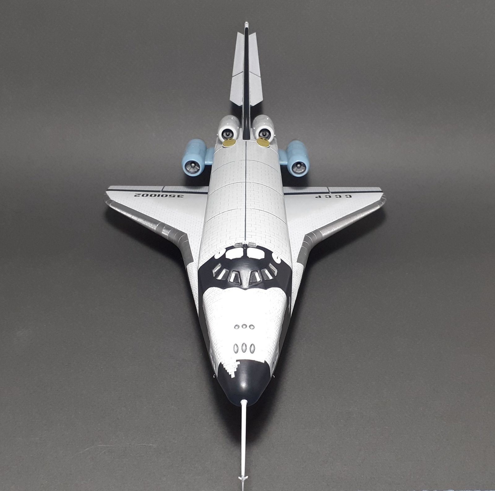 Работы по стройке: двойные окна кабины, снёс и заново нарезал накладки торцов крыла (+ фрагментальная оклейка фольгой), удлинил и детализировал переднюю нишу шасси (+обтекатель), изготовил переднюю стойку шасси, переделал переднюю створку, доработал основные ниши и створки шасси, переделал люк в корме, выбрал зазоры между элевонами, добавил недостающие сопла рулевых хвостовых ЖРД, укоротил стабилизатор, изготовил двигатели, доработал РН, изготовил носовую штангу, +разнообразные датчики по кабинной части.