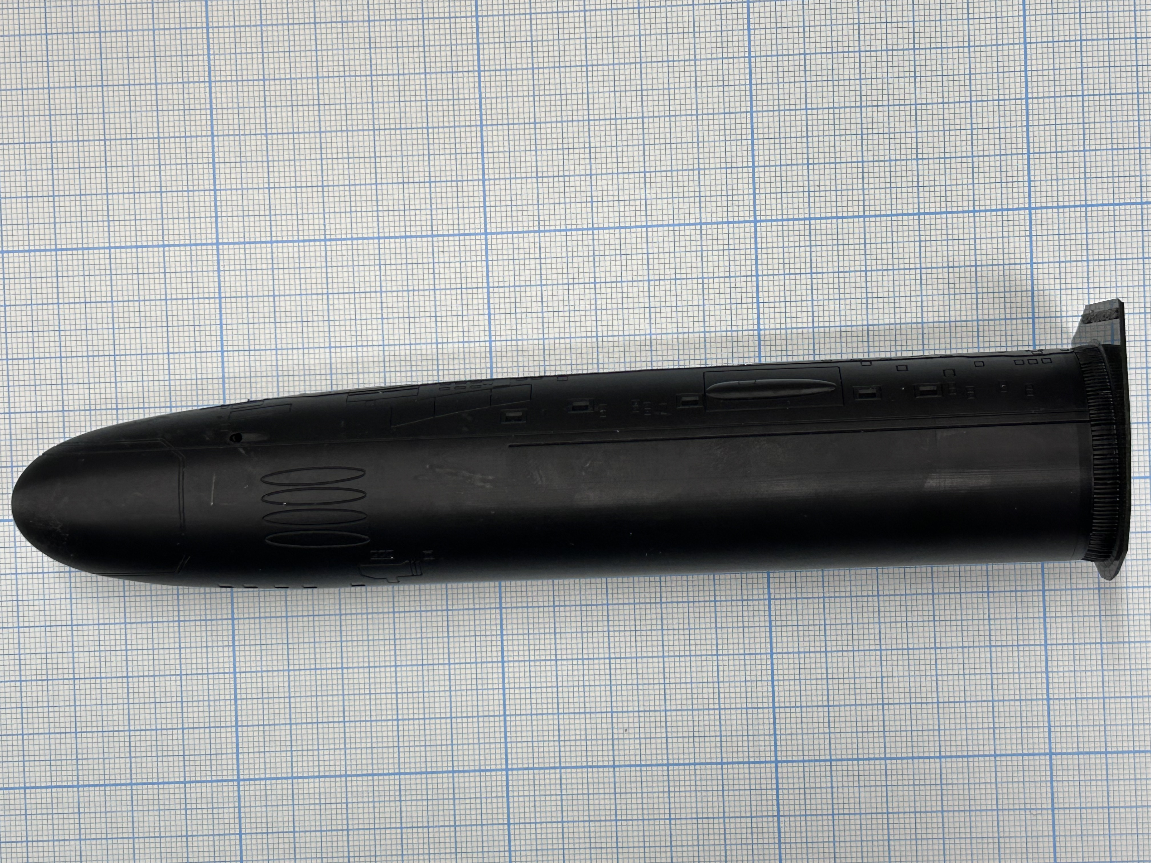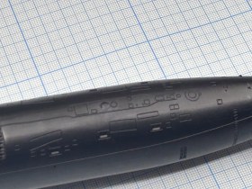 Собирается из двух частей, для облегчения стыковки предусмотрены замки. При таком способе сборки обязательно нудно будет убрать шов от стыка, и тут могут возникнуть небольшие сложности - в верхней части есть деталировка, а также длинный шпигат вдоль борта этим стыком разделяется на 2 части. На корпусе видня следы печать, а также остатки смолы, но это все легко можно будет убрать. Главный на мой взгляд недочет - это неправильное количество крышек торпедных аппаратов. На модели их по 4 с каждого борта, а должно быть 5. При подготовке обзора я изучил довольно большое количество фото и схем (особенно на форуме Авиабазы) и нашел, откуда может быть эта проблема. Как говорил ранее, на боксарте у нас схема автора с ником igorkot c форума Авиабазы, на конкретно этой изображены 8 торпедных аппаратов (по 4 с каждого борта), но у него же есть схемы и с 10 аппаратами. Не вникая в подробности обсуждений о количестве ТА приведу итог - аппаратов на корабле 10 (по 5 с каждого борта). Есть фотографии из доков, подтверждающие их количество. Нам же это вылилось в такую ошибку на модели. Самый простой вариант как исправить - снять шаблон с одной из крышек каждого борта и по нему сделать еще одну крышку скрайбером над текущей группой. Также снова вопрос к обтекателю ГАК, а точнее к двойной линии расшивки (аналогично ОВУ). Еще одно очень сильное упрощение это комингс площадки. Они выполнены очень упрощенно просто двумя кругами, а формой повторяют круглую форму корпуса, хотя сами по себе они плоские. Также палуба не на всем протяжении от ОВУ до кормовой комингс площадки аналогично покатая. На фото видно, что она в этой части имеет характерную более плоскую форму. При этом мне понравилось качество проработки шпигатов, люков и выгородок, если судить по фото и схемам - расположение также у них правильное на первый взгляд. Кормовые руи имеют очень тонкую кромку, также прекрасно проработаны. Корма лодки также в защитной рамке, что позволит избежать повреждения рудей (на моих фото рамка отломана у оснований по моей неаккуратности). Носовая часть имеет правильную форму в районе крышек ТА и к носу.
