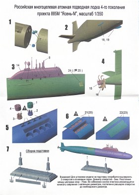 Инструкция произвела приятные впечатления. Всего 6 этапов. Этапы показаны хорошо, вопросов к позиционированию деталей не возникает, разные детали показаны разными цветами. Вопрос только к пункту 2 - на проекте 885М нет водозаборных устройств. Причем на боксарте их тоже нет. Особых проблем с этим не должно быть, нужно будет зашпаклевать отверстия от креплений. Также в инструкции показаны варианты сборки - различное наполнение ракетных шахт и возможность сборки шахт в открытом и закрытом положении.