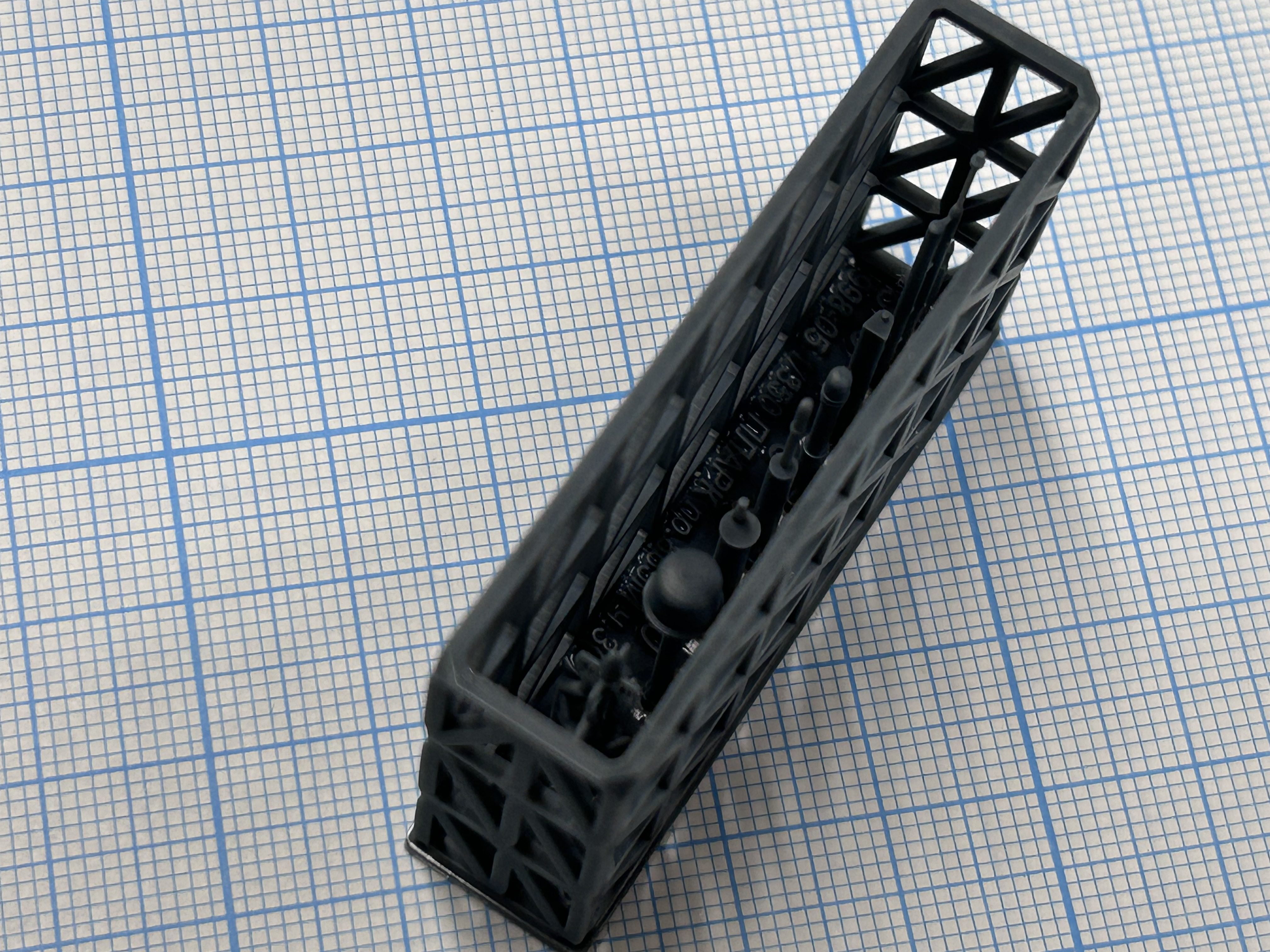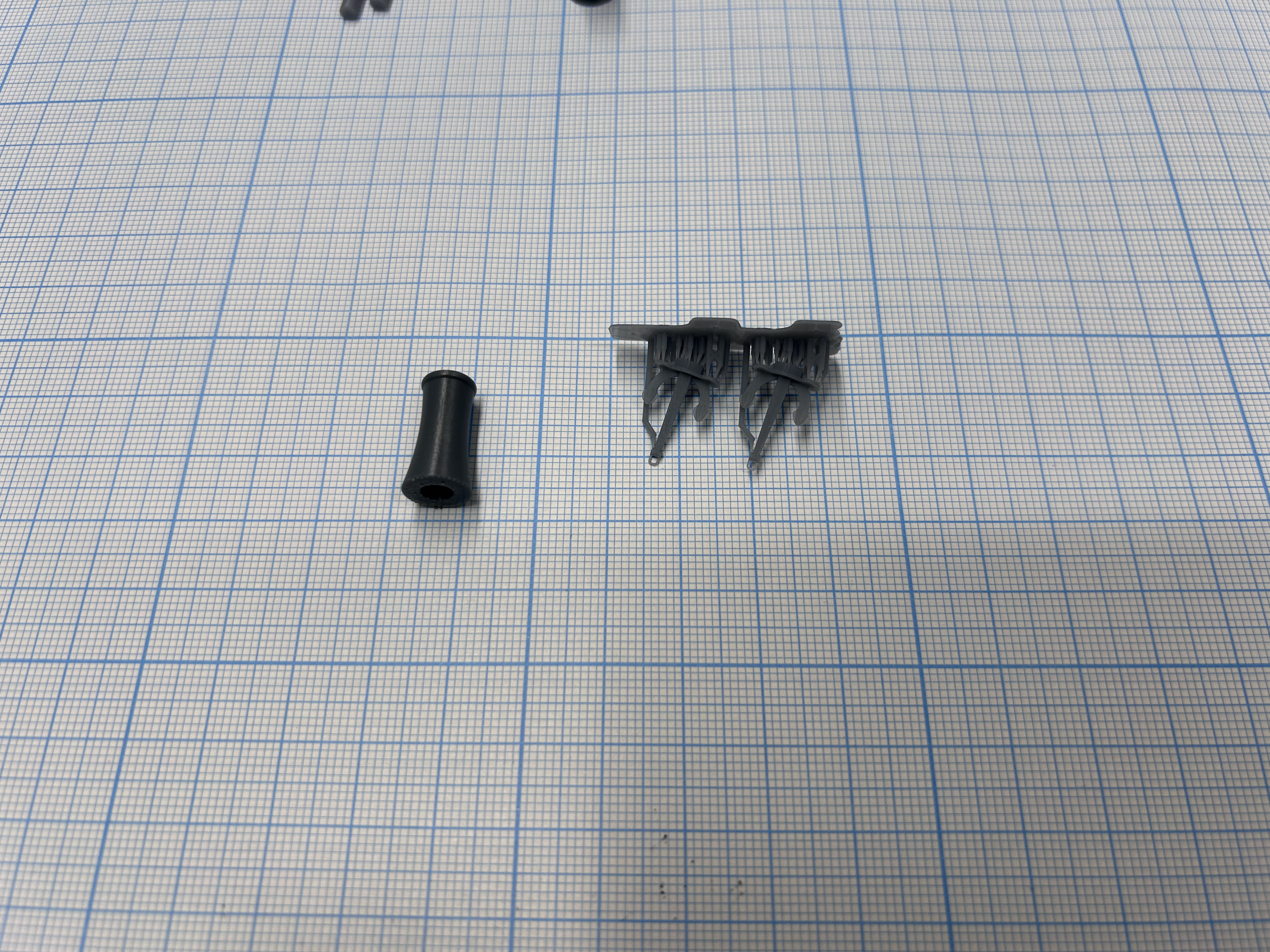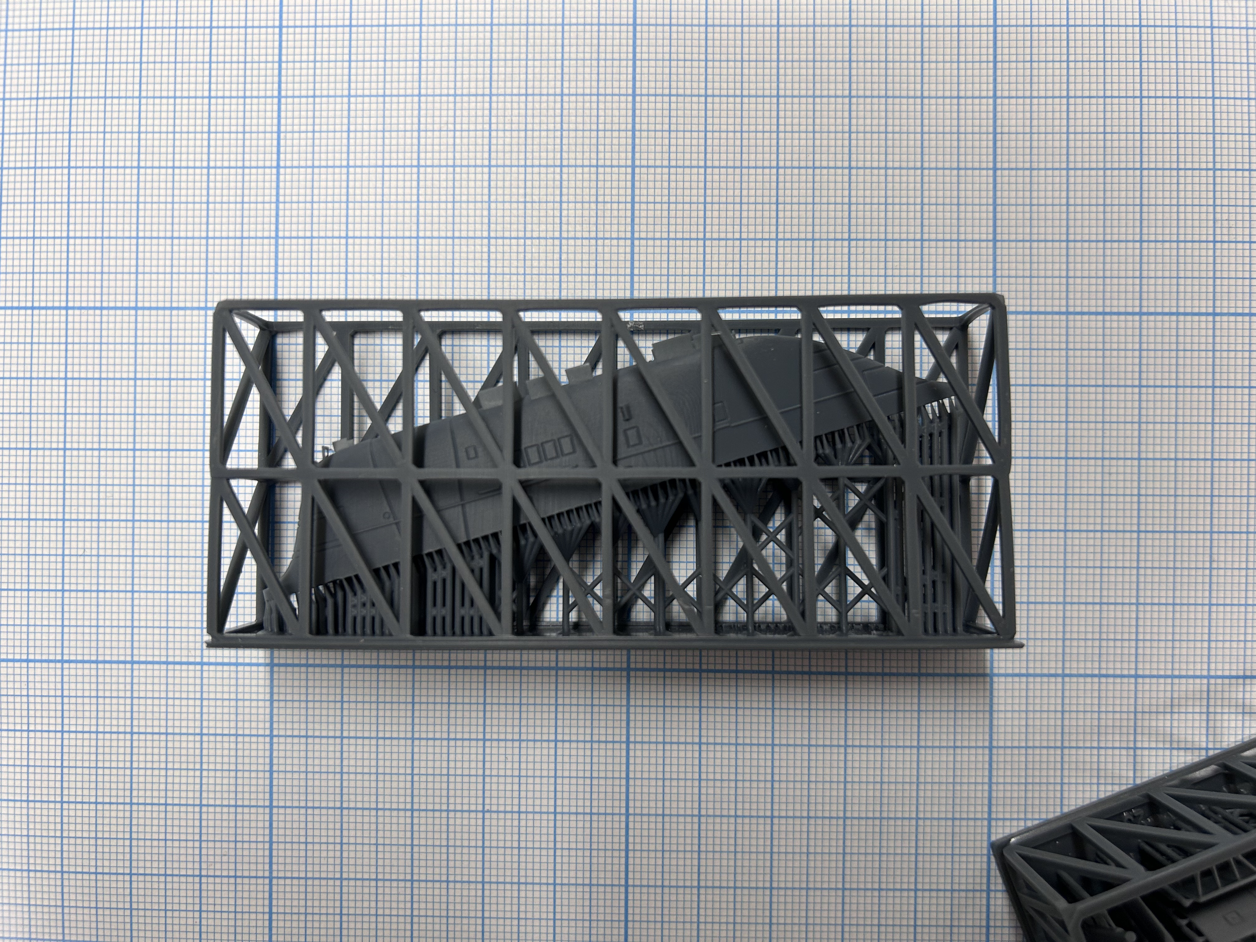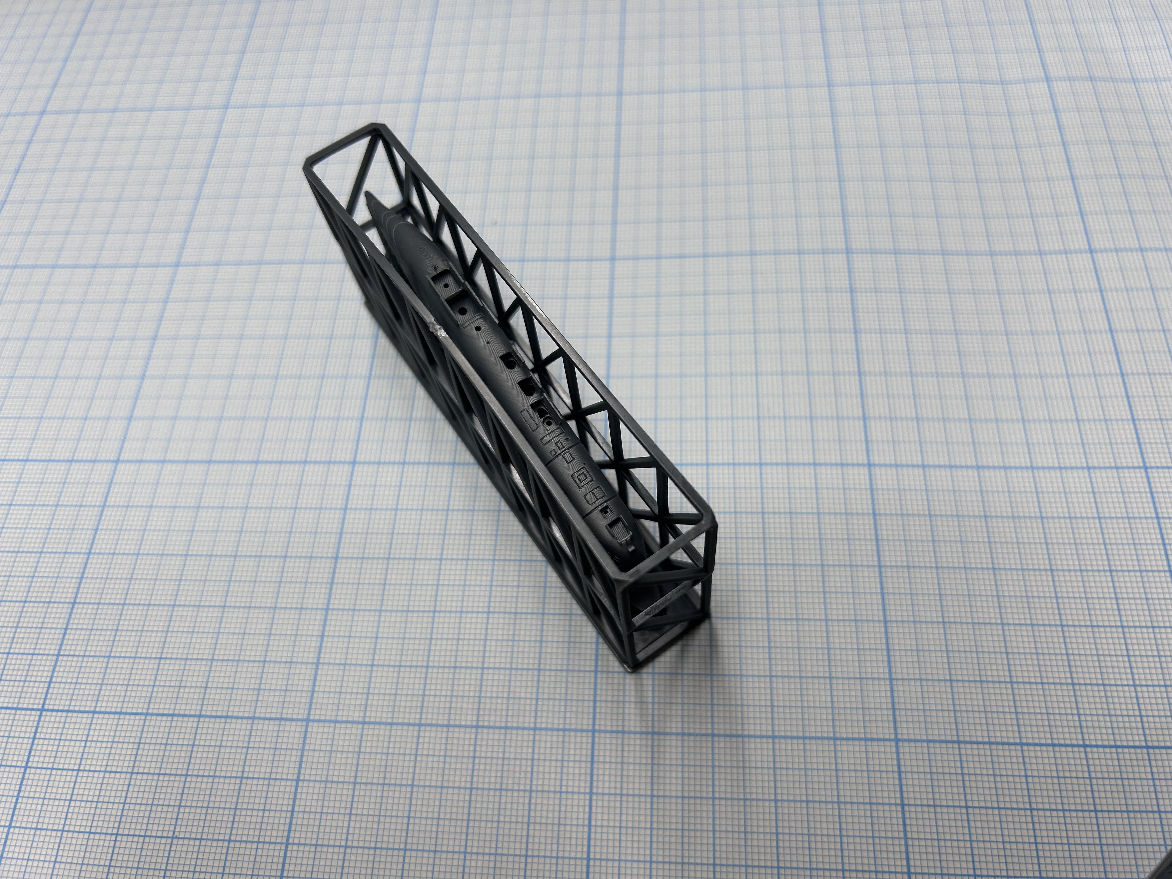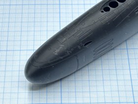 По традиции модели подводных лодок этого производителя напечатаны на фотополимерном принтере из специальной фотополимерной смолы. Основные детали из смолы серого цвета, а корпус из черного. Не знаю точно на марки смол, но есть небольшое подозрение, что механические свойства у них могут быть разные (при работе станет яснее).