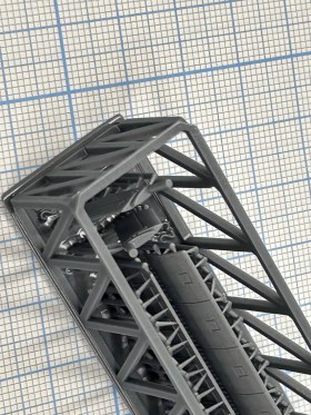Первое, что бросилось в глаза - это слои печать на задней части ограждения, на фото постарался показать. В носовой части характерный обтекатель выделен двойной расшивкой - с одной стороны есть фото, на которых видно, что по его периметру действительно идет довольно широкая полоса, но с другой стороны кажется, что на модели достаточно было бы оставить только одну линию. Для себя пока не решил, оставлю так или одну из полос зашпаклюю. Очень понравилась проработка и исполнение ветрозащитного щитка мостика, а также что щиты выдвижных устройств не плоские, а повторяют форму верхней части ограждения (хоть и немного толстоваты). Рубка в таком исполнении позволяет собрать из коробки вариант только с поднятыми выдвижными, возможно, кому-то этот момент будет неудобен. В остальном эта деталь оставила положительные впечатления.