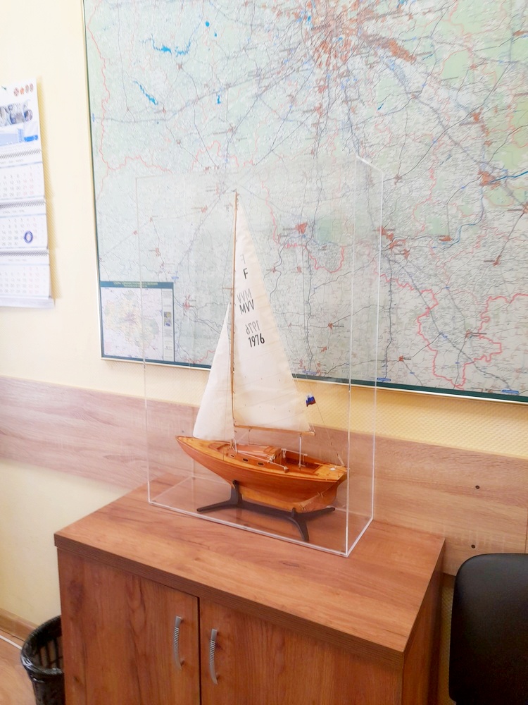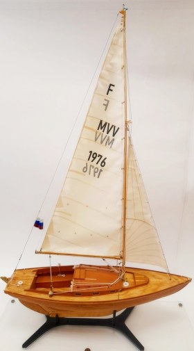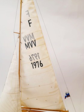 Яхта строилась для коллеги на работу, поэтому нумерация на гроте такая странная (инициалы и год рождения вместо страны и номера), вымпел яхтклуба тоже придуман.