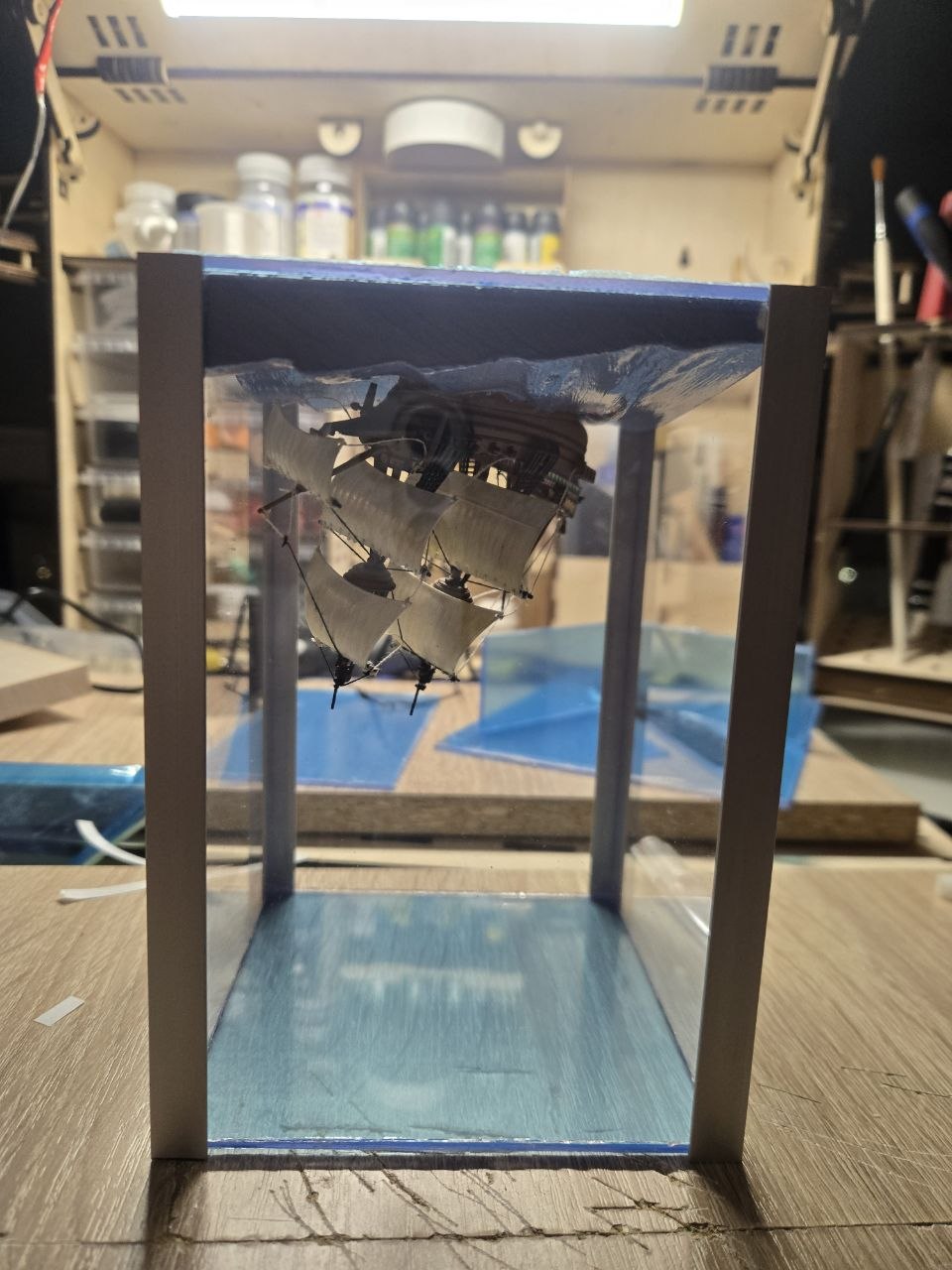 Без фигурок, больше на "Летучий Голландец" похоже...)) Ну а если серьёзно, то в целом, работа неплохая получилась. Мои поздравления! За футляр, отдельный плюс. А теперь, что касается водной поверхности. В принципе, как вариант имеет место быть, а вот покрашено на мой взгляд, немного не удачно, всё выглядит как то однотонно. Понятно, что у вас нет опыта, но теме не менее... Вот если бы, вы добавили немного эффектов, хотя бы в виде кильватерного следа (можно было сделать, из обычного силикона), работа смотрелась бы интересней. В общем, работайте в этом направлении, смотрите как делают другие, и у вас всё получится. А если будут вопросы, то обращайтесь. Удачи в новых работах!